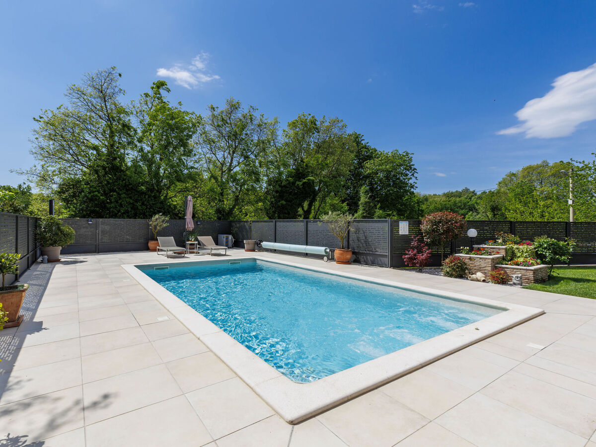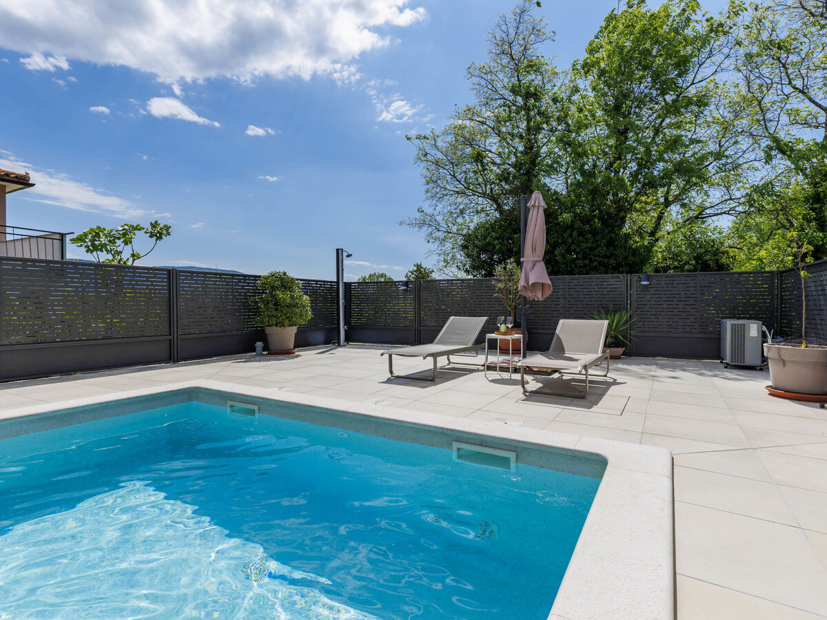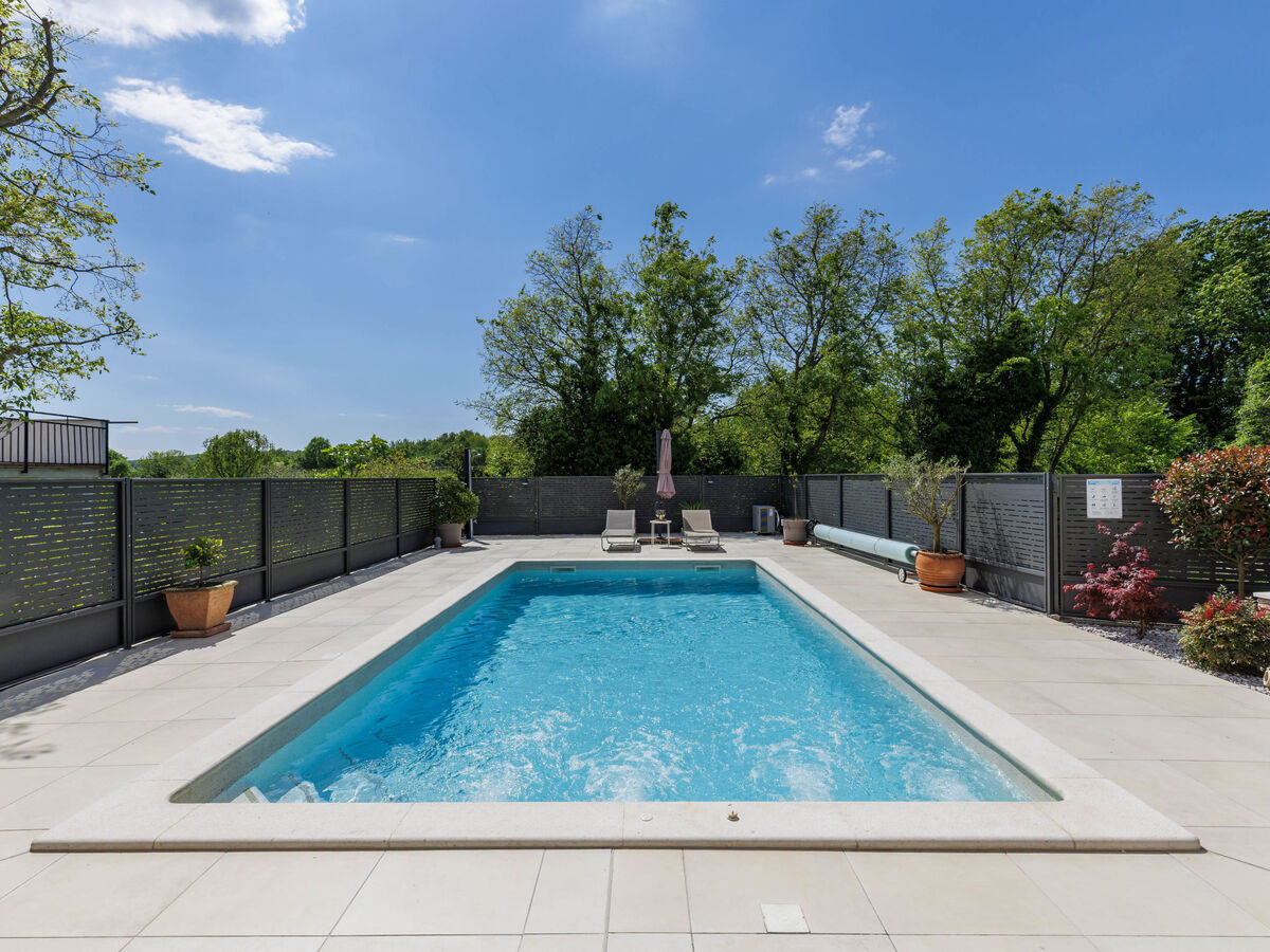 A usage privé: terrain 650 m2 (clôturé) avec pelouse et plantes, piscine rectangulaire, chauffée (8 x 4 m, profondeur 150 cm, disponibilité saisonnière: 15.Mai.
