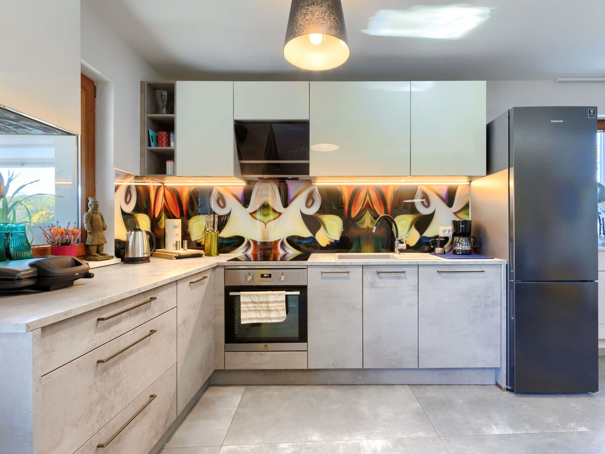 Cuisine ouverte (four, lave-vaisselle, 4 plaques à induction, grille-pain, bouilloire électrique, congélateur, cafetière électrique).