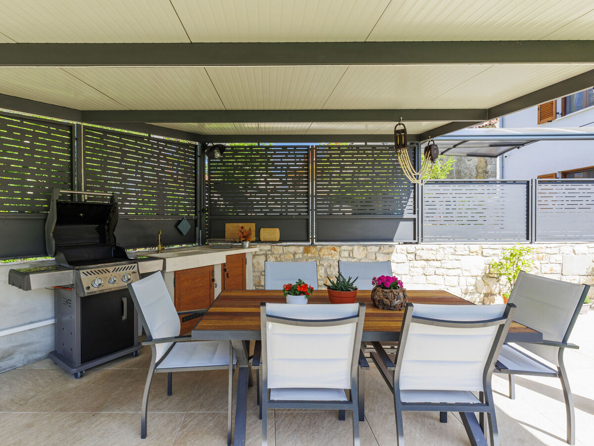 Meubles de terrasse, barbecue (portable), chaises longues.