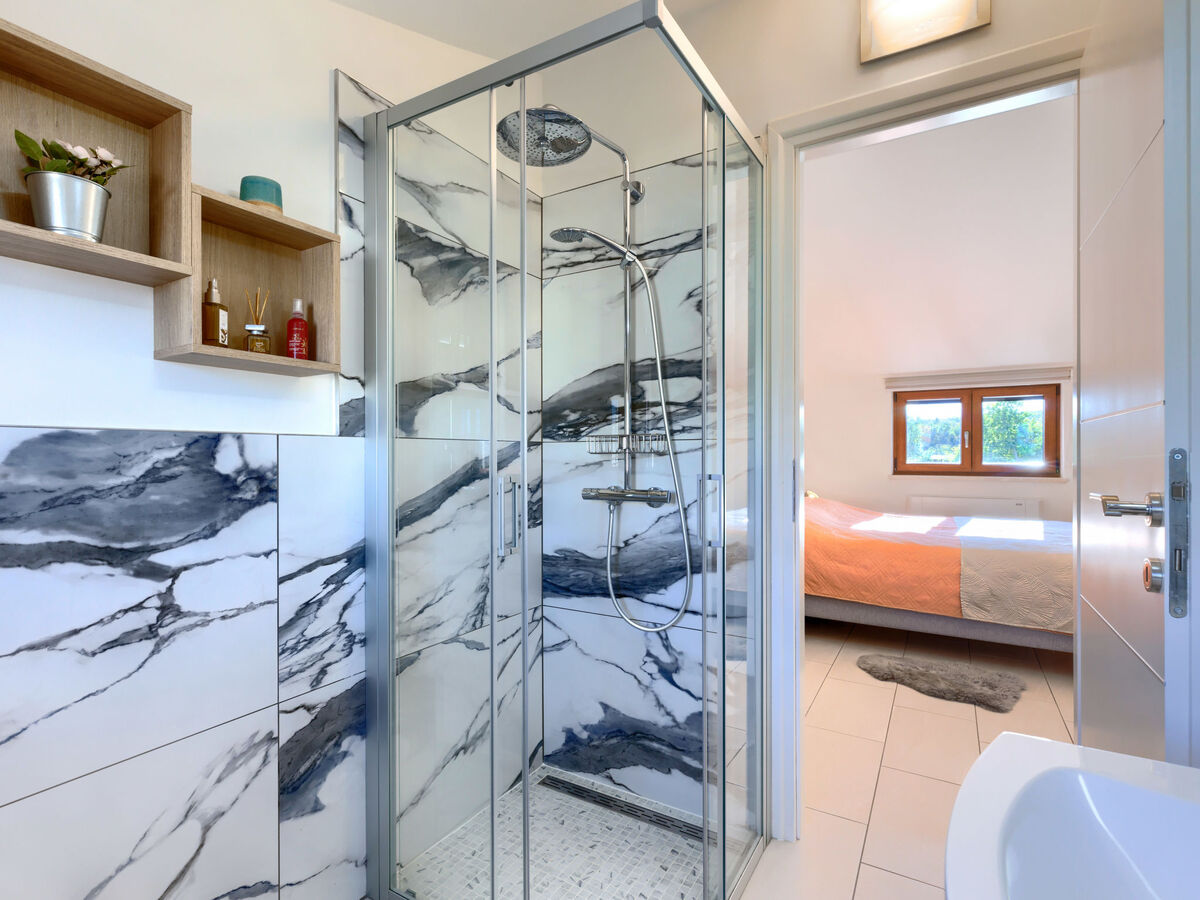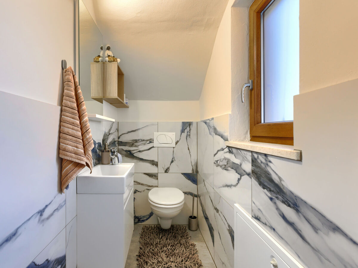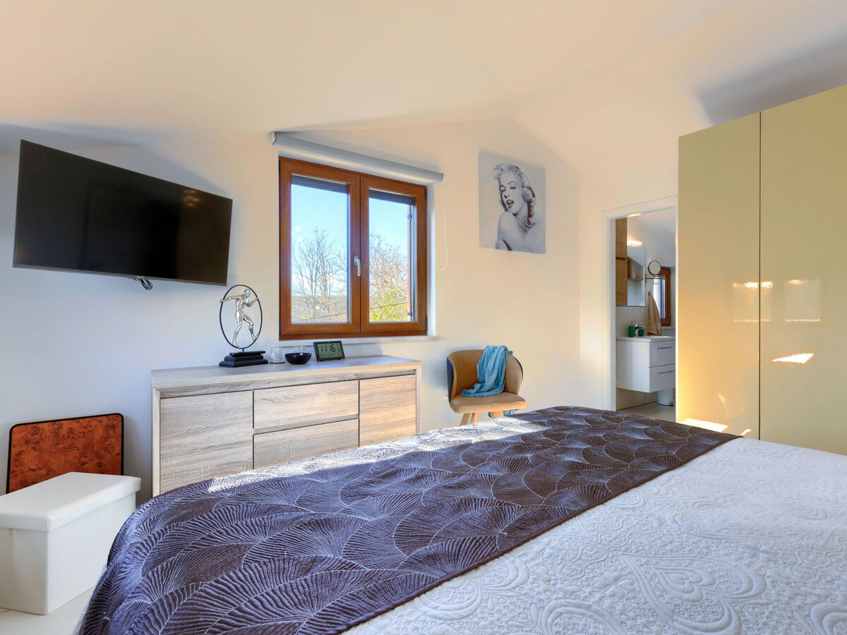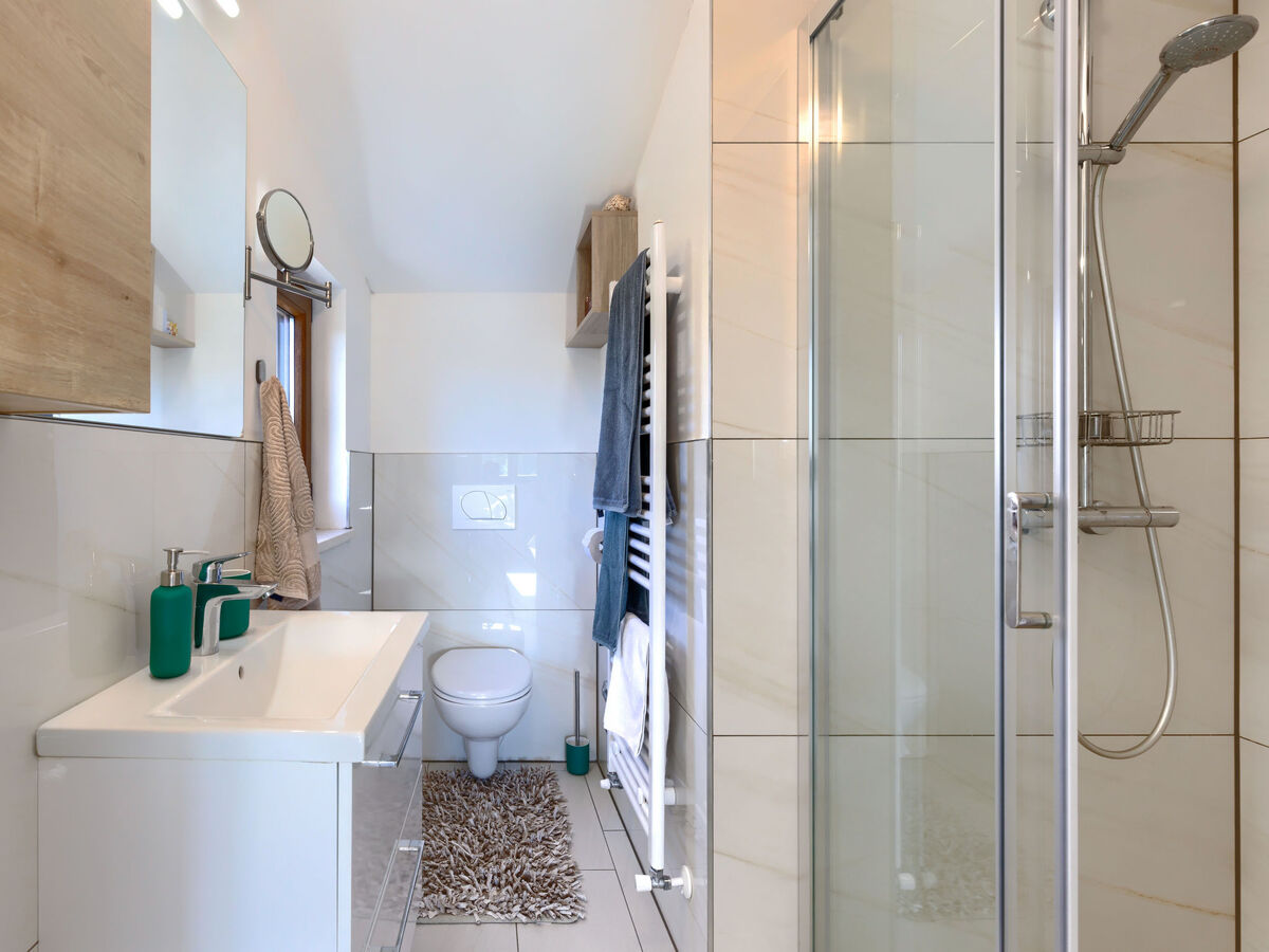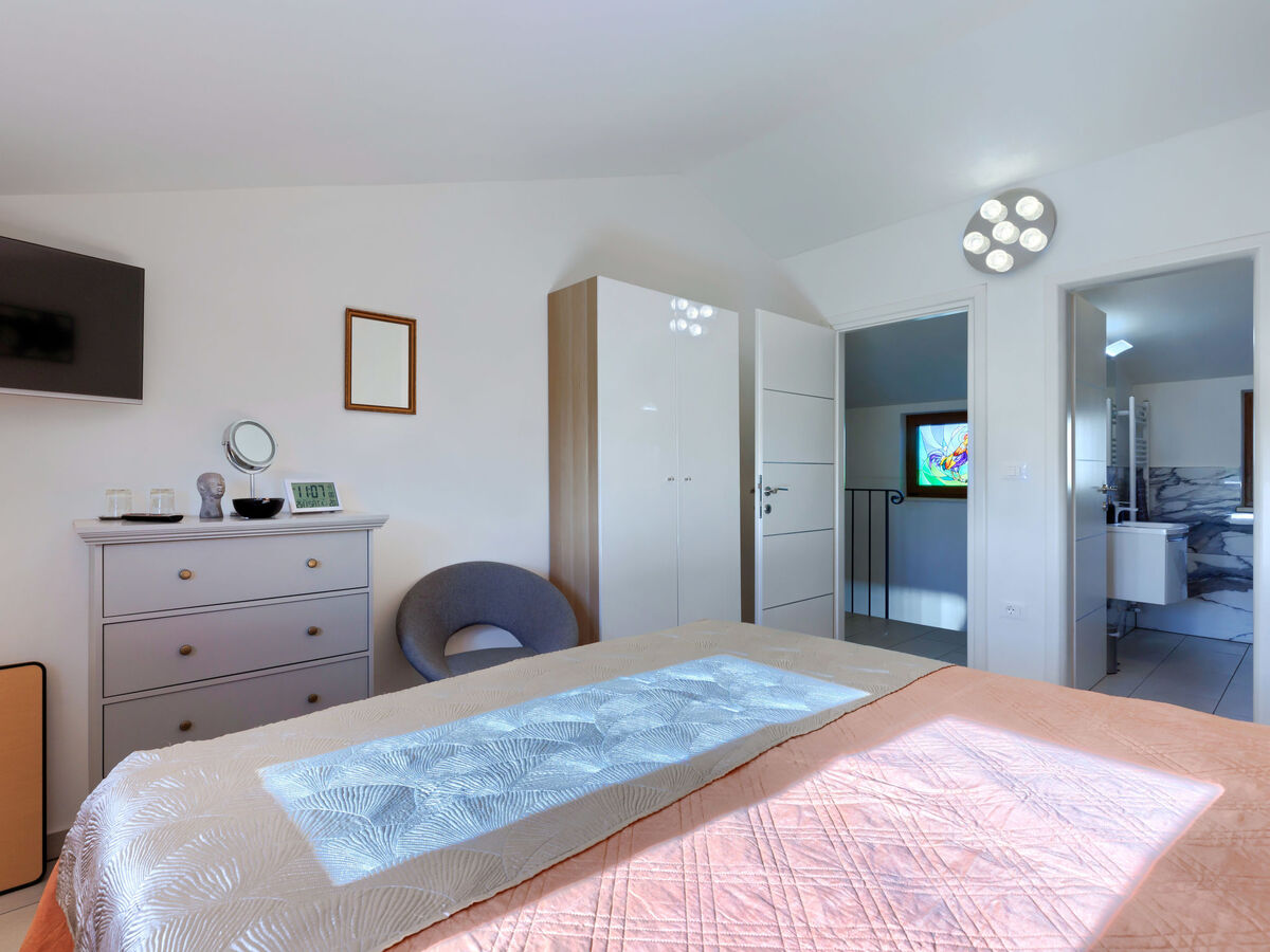 Sous le toit: 2 chambres, mansardées, chaque chambre avec: 1 grand-lit (180 cm, longueur 200 cm), douche/WC, TV (satellite), air-conditionné et chauffage à air chaud.
