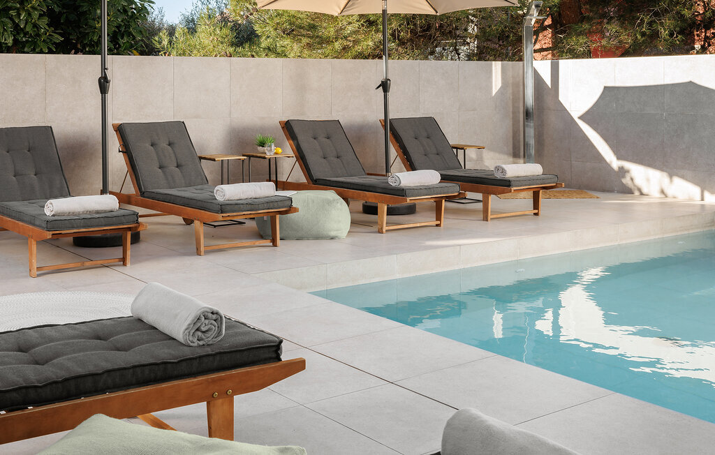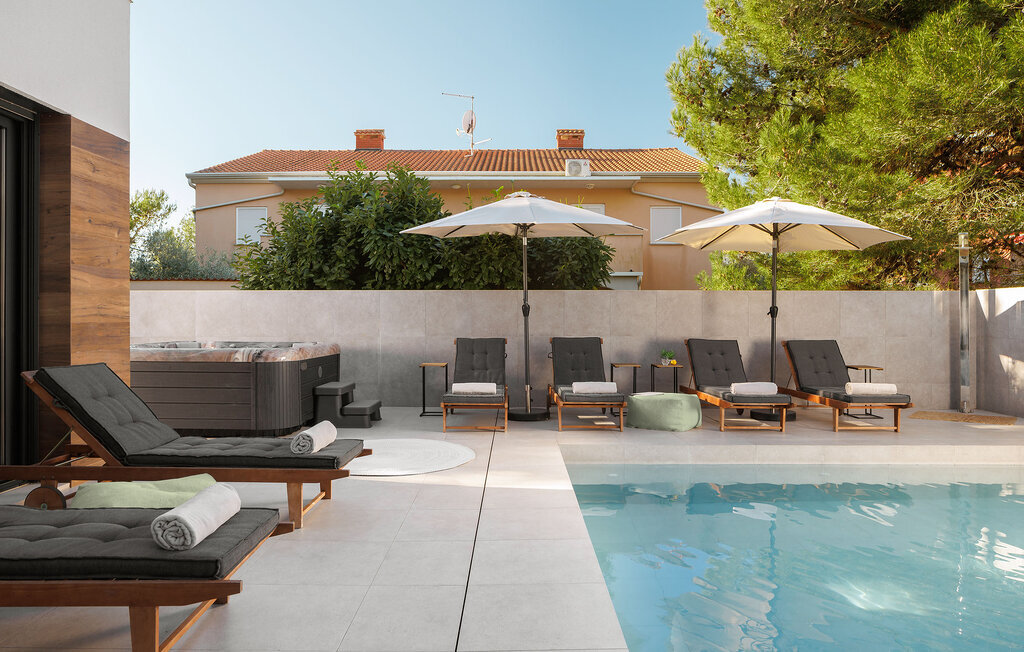 Bien-être à l'extérieur : Location de vacances disposant de chaises-longues et d'un ou plusieurs équipements tels que piscine extérieure, jacuzzi extérieur, lit à baldaquin de jardin etc...