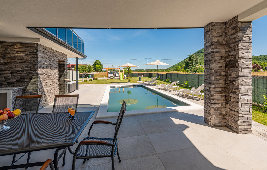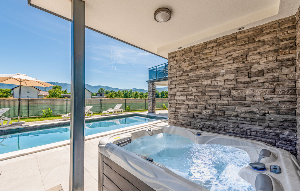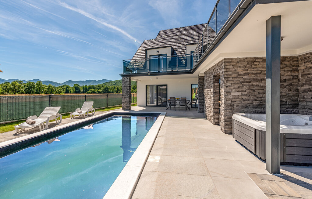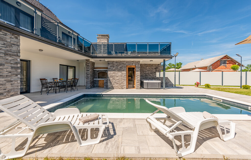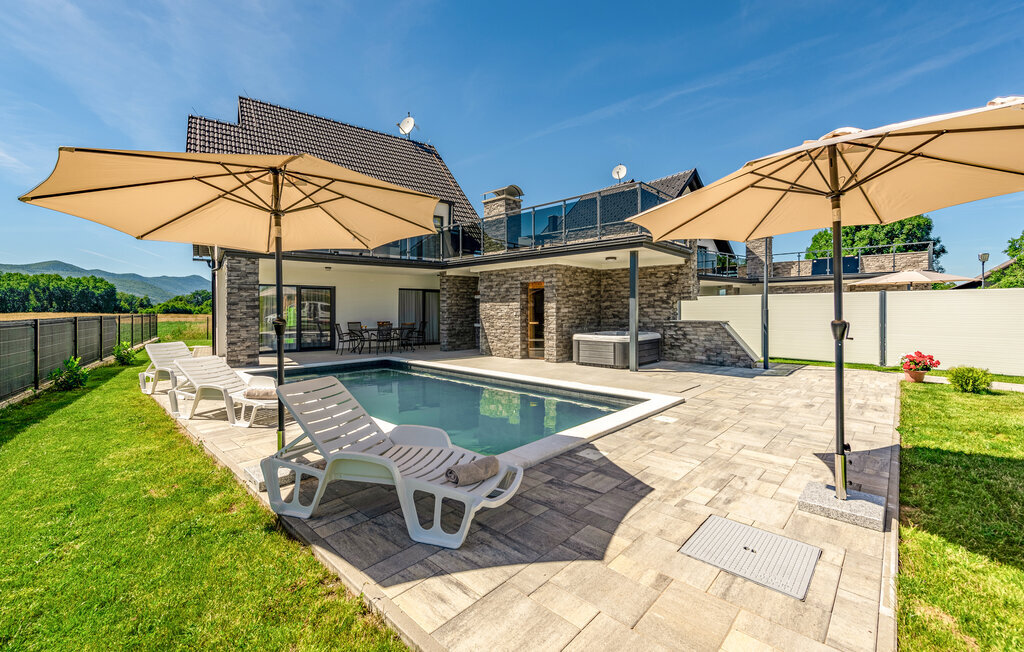 Bien-être à l'extérieur : Location de vacances disposant de chaises-longues et d'un ou plusieurs équipements tels que piscine extérieure, jacuzzi extérieur, lit à baldaquin de jardin etc...