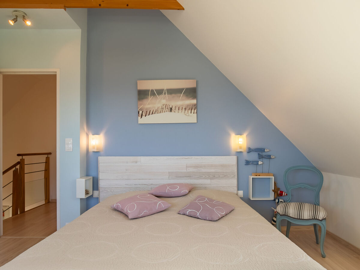 À l'étage supérieur: 1 grande chambre avec baie vitrée avec 1 grand-lit (160 cm, longueur 200 cm).