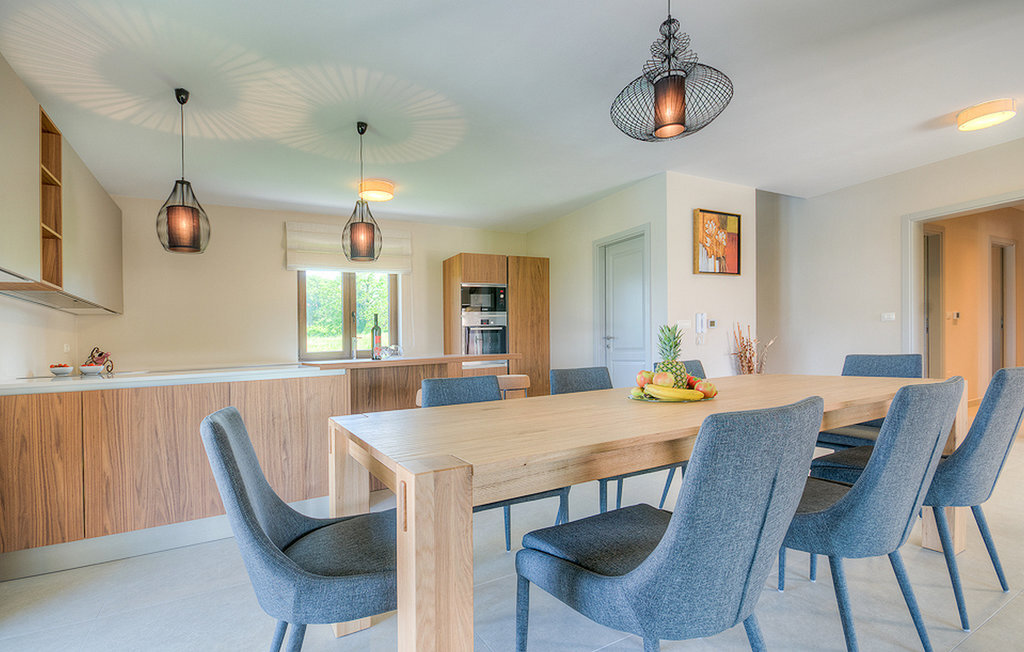 Profitez avec votre grande famille ou des couples d'amis de cette maison de vacances moderne et élégante. Sur plusieurs étages, vous pourrez vous sentir comme chez vous, profiter de l'ambiance lumineuse et de bon goût ainsi que des nombreuses chambres et salles de bains. La salle à manger avec sa grande table vous invite à prendre des repas conviviaux, tandis que le salon avec son canapé confortable et sa télévision est parfait pour se détendre après une journée bien remplie. Profitez de l'accès au balcon à l'étage supérieur, faites vos exercices de yoga matinaux ici et profitez d'une vue imprenable sur les environs pittoresques.
