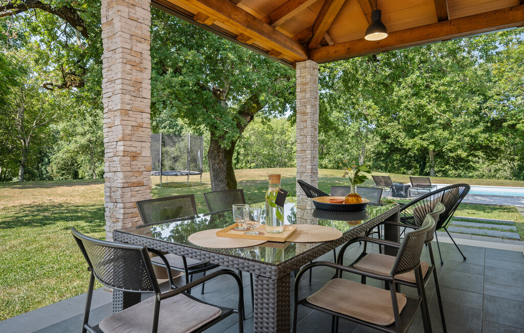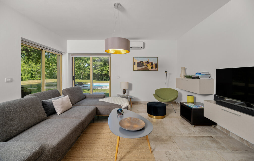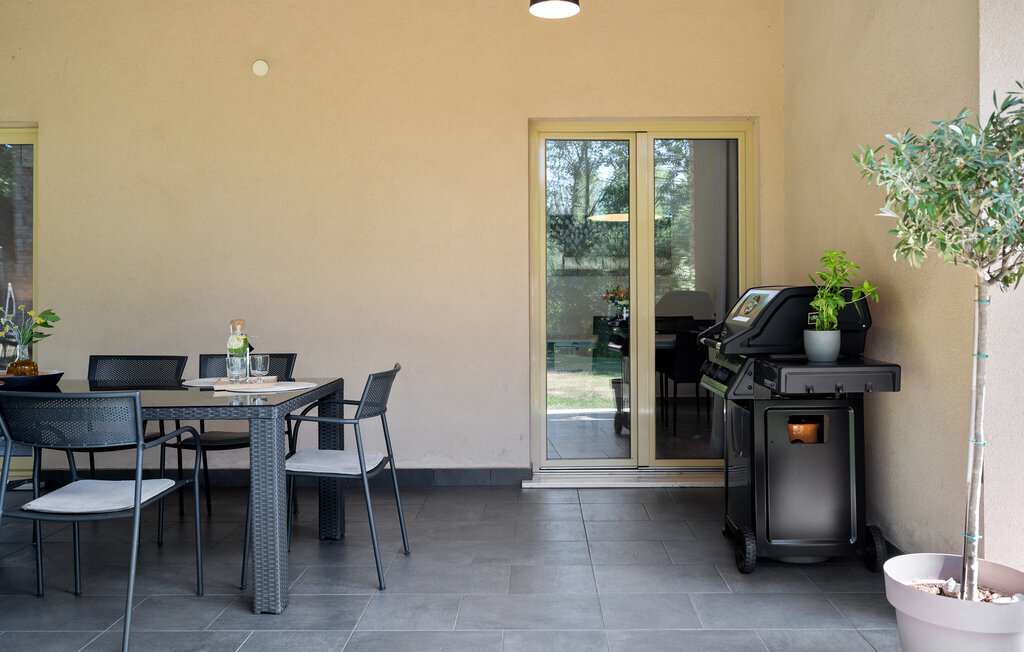 Le salon baigné de lumière est aménagé avec goût et attention aux détails et a un accès direct au jardin où se trouve la piscine. Sur la terrasse couverte se trouve également une table à manger en plein air où vous pourrez déguster de délicieuses friandises préparées au barbecue à gaz.