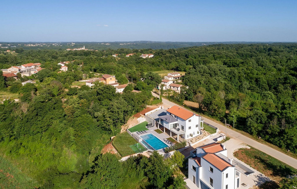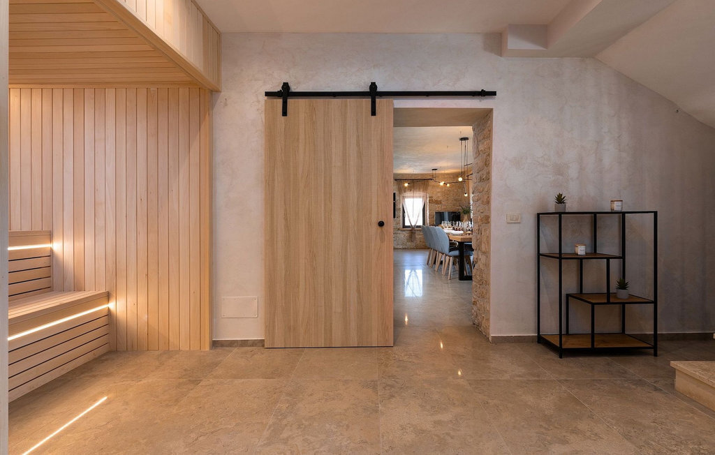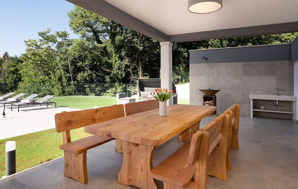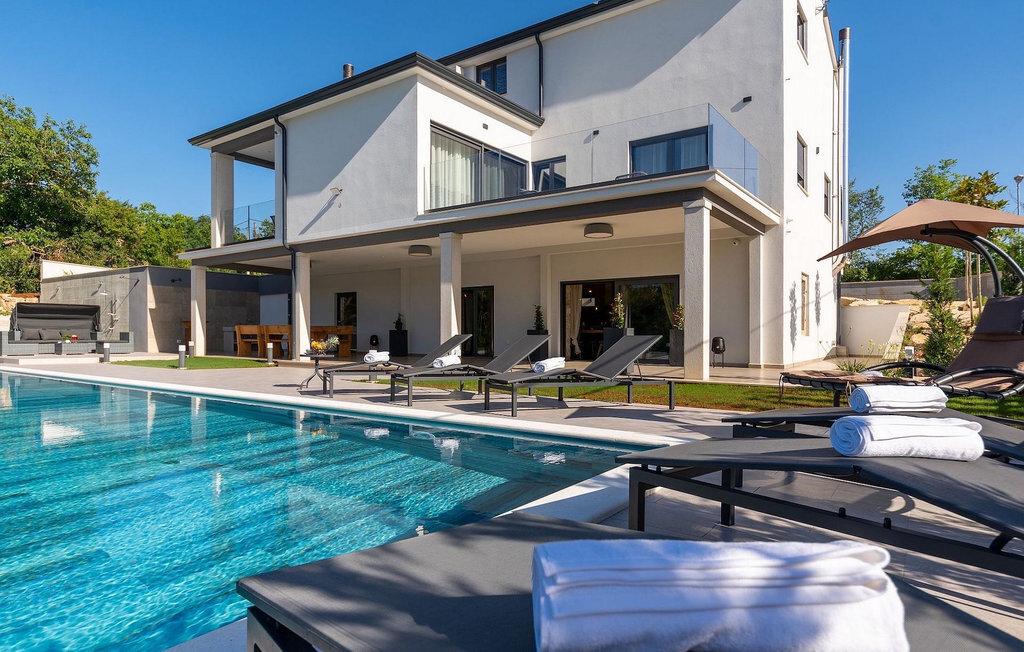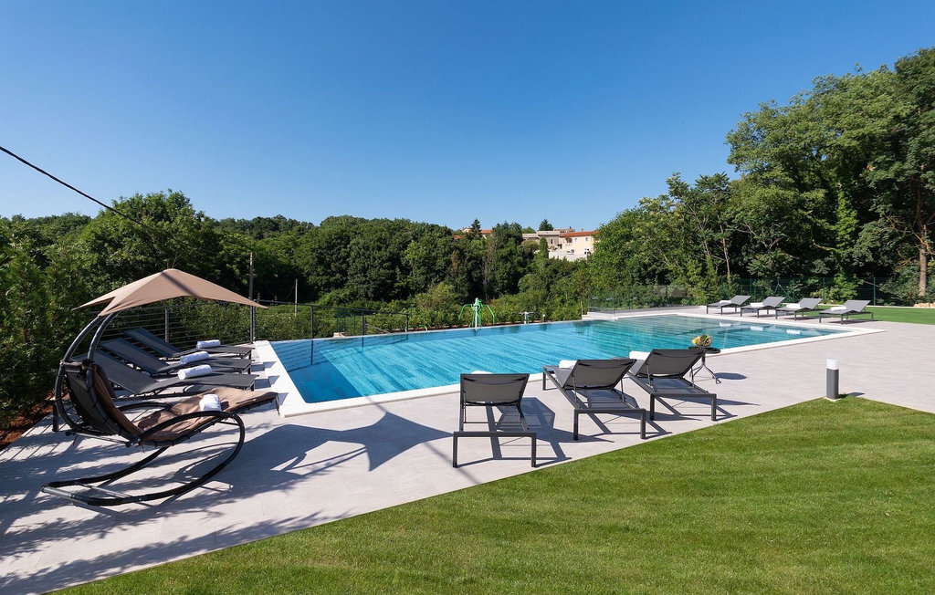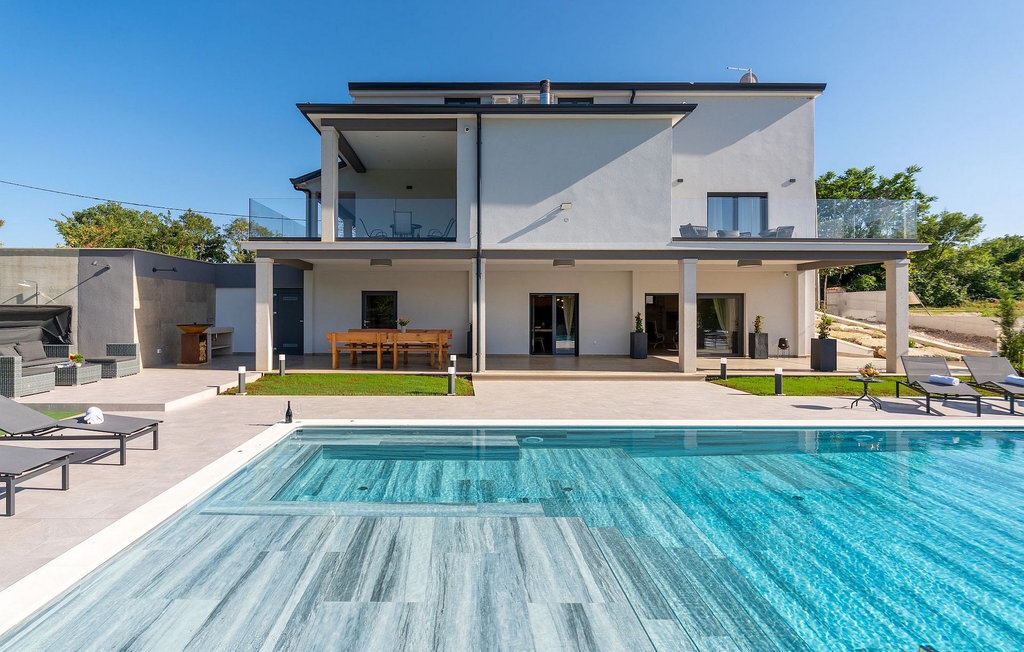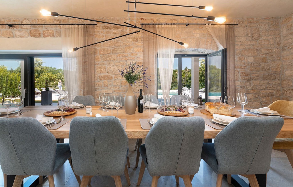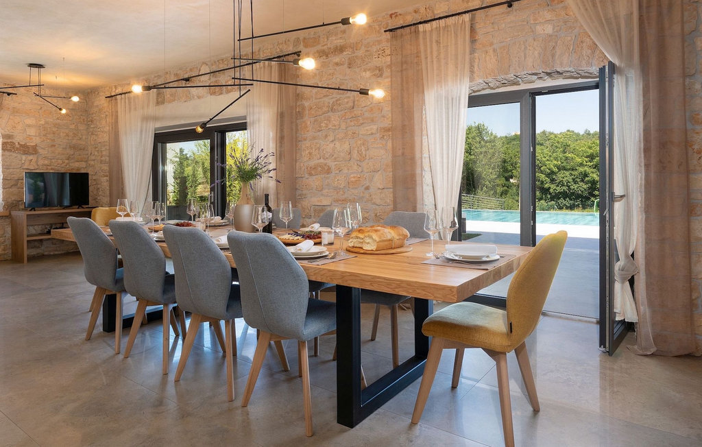 Découvrez notre fantastique Villa Fabris - une élégante villa de 5 chambres pouvant accueillir jusqu'à 10 personnes pour des vacances de rêve au cœur de l'Istrie. La villa est située dans le village de Danijeli, près de Tinjan, entourée de nature et pourtant suffisamment proche de toutes les commodités dont on a besoin en vacances. Le point de mire est la très belle piscine de 96m2 avec hydromassage, entourée de chaises longues et avec vue sur la verdure. Ici, vous pouvez vraiment vous détendre et profiter de l'été. Sur la terrasse avec vue sur la piscine, vous avez le coin barbecue moderne et un petit salon. Une grande table en bois vous invite à prendre vos repas en plein air avec votre famille et vos amis. En entrant dans la maison, vous vous trouvez dans la grande cuisine d'été entièrement équipée et meublée avec style, avec une grande table à manger où tout le monde peut s'asseoir. L'une des belles salles de bains se trouve également à ce niveau. Un étage plus haut, la Villa Fabris dispose d'un salon chic avec coin repas et cuisine ainsi que de deux chambres à coucher avec chacune leur propre salle de bain moderne. Si vous montez encore quelques marches, vous avez encore 3 chambres confortables avec salles de bains attenantes à votre disposition, qui vous promettent des nuits reposantes, si vous ne les passez pas à admirer le ciel étoilé sur le balcon ;-). Pour s'amuser, il y a par exemple un espace fitness au bord de la piscine, une table de ping-pong, un baby-foot, des fléchettes, un panier de basket-ball et un trampoline. Une Playstation est également à disposition. Un autre atout de la Villa Fabris est son sauna privé. Offrez-vous un peu de luxe, réservez notre nouvelle Villa Fabris et profitez de vos vacances d'été bien méritées avec vos proches dans la magie de l'Istrie!La Villa Fabris est située dans le centre de l'Istrie, entre Pazin et Rovinj, au milieu de nombreux petits villages. Le village de Danijeli est l'un de ces petits endroits où l'on se sent immédiatement comme chez soi. On y trouve tout ce dont on a besoin pour la vie quotidienne, mais aussi des villes particulières, des curiosités et des plages pas trop éloignées. Les emblèmes de cette région enchanteresse sont sans aucun doute le meilleur prosciutto d'Istrie, l'huile d'olive et le vin, les authentiques murs en pierres sèches, mais aussi l'intrigante histoire ancienne et la tradition riche en légendes locales et en secrets à découvrir. Les petites villes médiévales pittoresques sur les collines, les villages authentiques où le temps s'est arrêté et les paysages d'une beauté fascinante sont idéaux pour des tours panoramiques, des balades à vélo et des randonnées. Une excellente cuisine traditionnelle, de l'huile d'olive vierge et des raisins de première qualité de Muscat, Malvasia et Teran - pour lesquels cette région est mondialement connue - ajoutent les derniers ingrédients à des vacances inoubliables. Et si vous êtes d'humeur à faire autre chose, la mer Adriatique cristalline avec ses magnifiques plages ainsi que les hotspots touristiques populaires ne sont qu'à une courte distance en voiture.