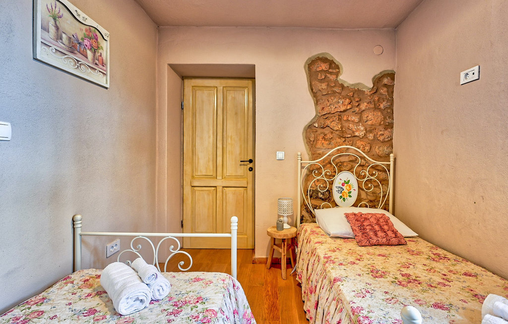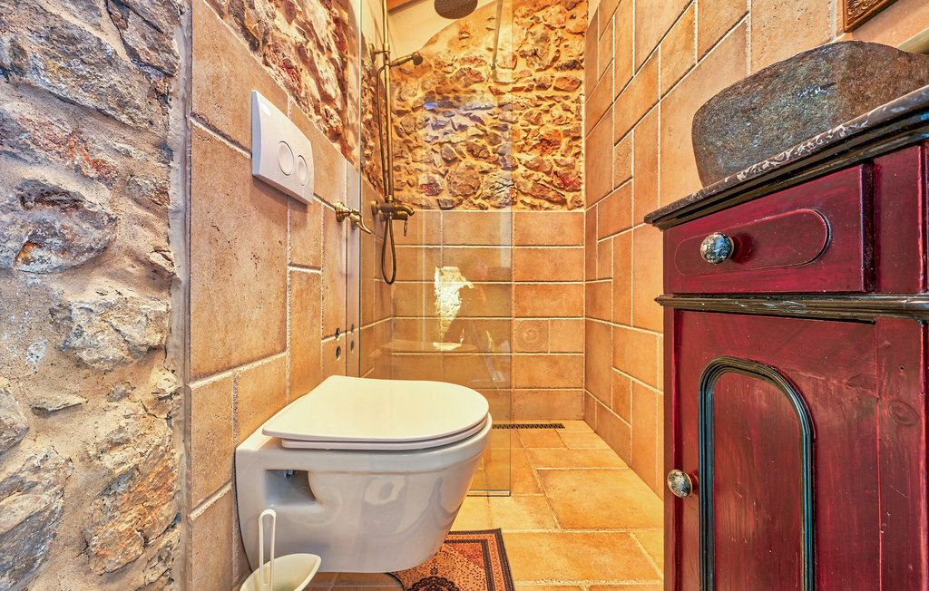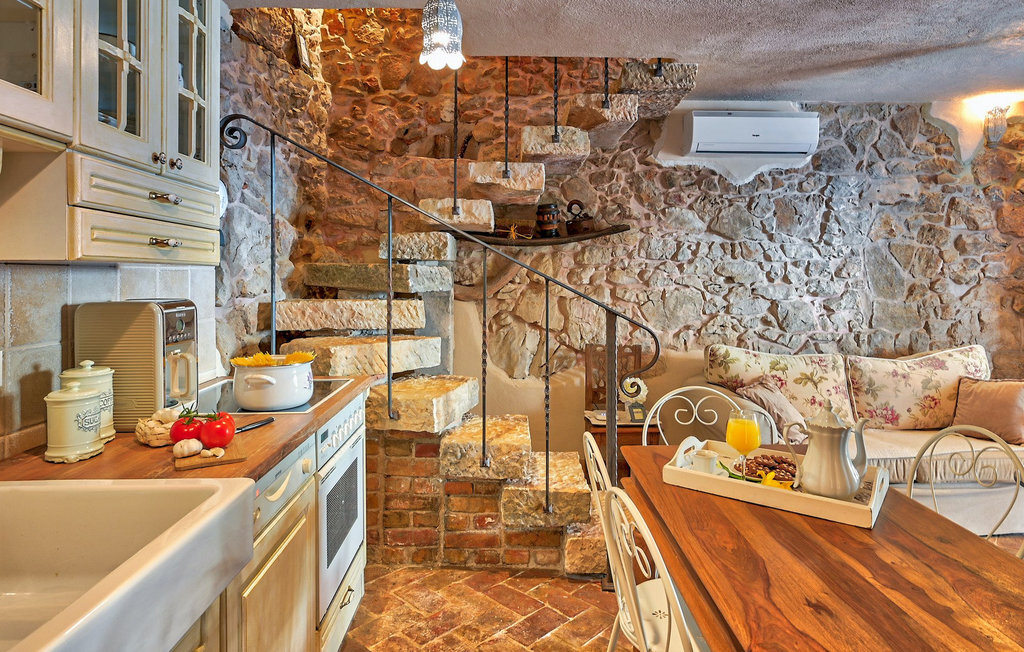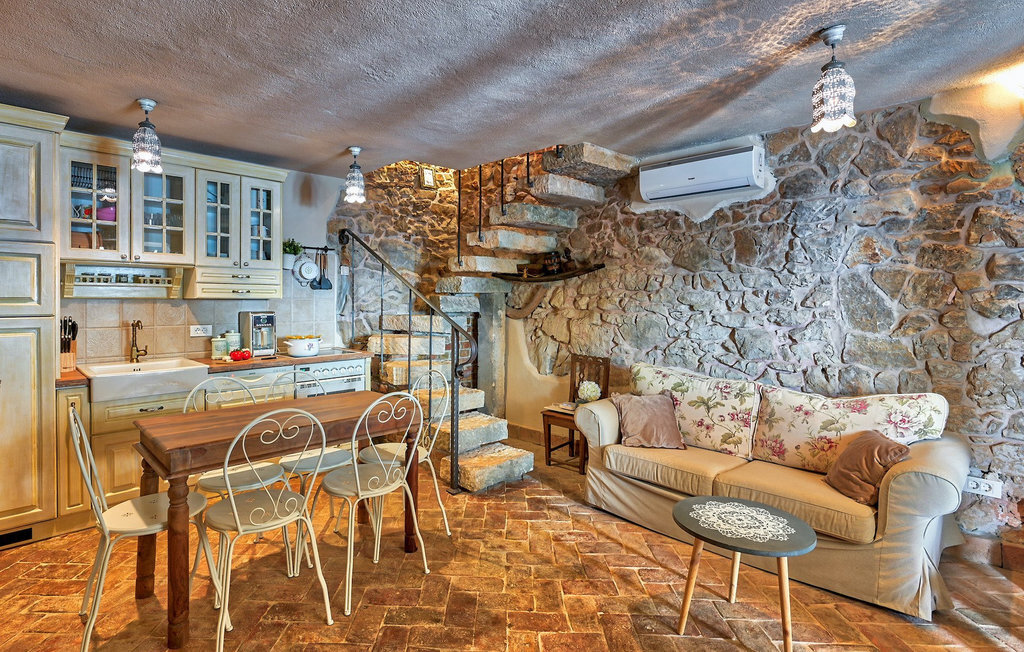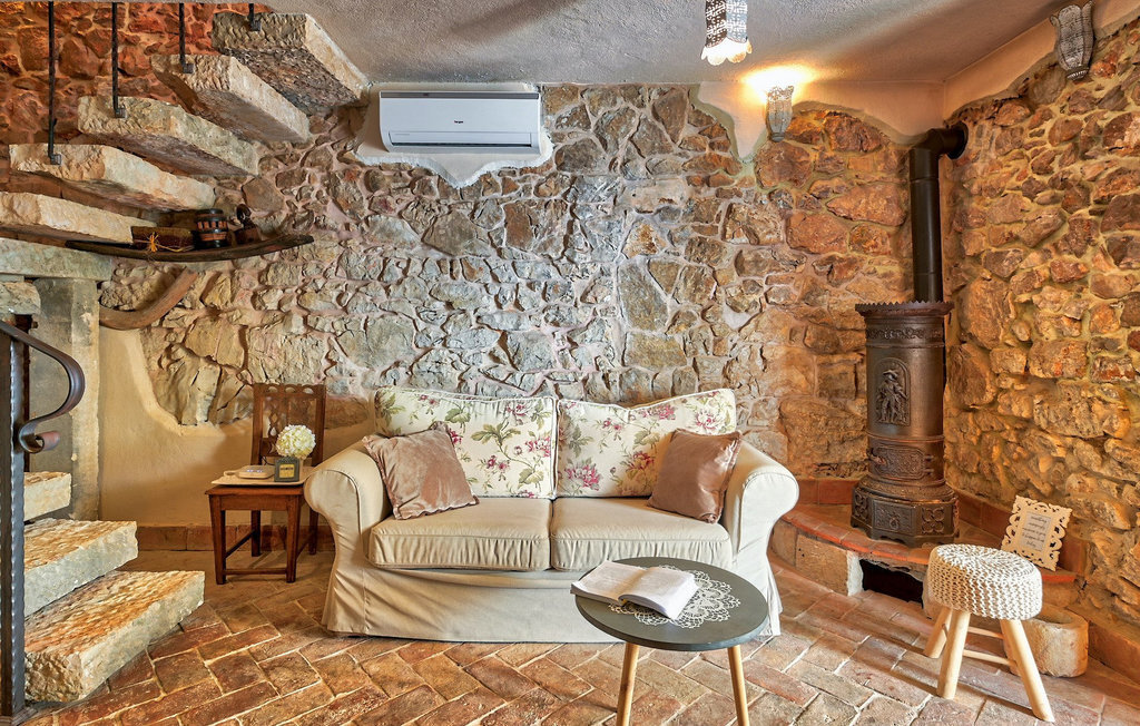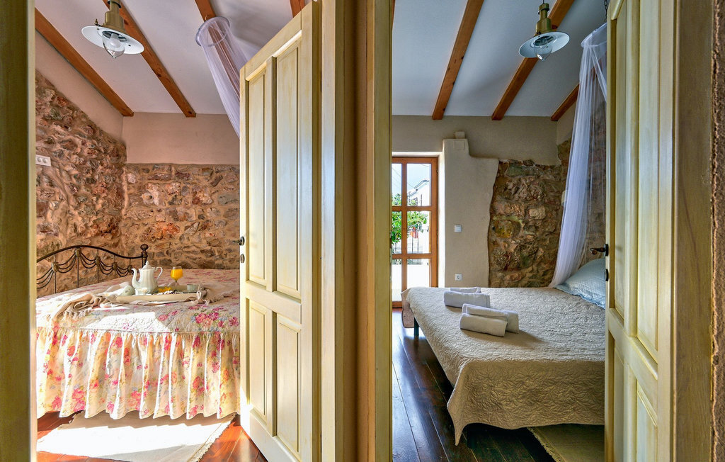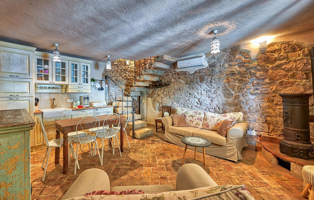 Au rez-de-chaussée se trouvent la cuisine, la salle à manger et le salon avec un poêle à bois, une chambre avec deux lits simples et une salle de bain avec douche à l'italienne. Un escalier en pierre élégant mène au premier étage, où se trouvent deux chambres à coucher avec lit double, une salle de bain et une sortie sur le balcon.