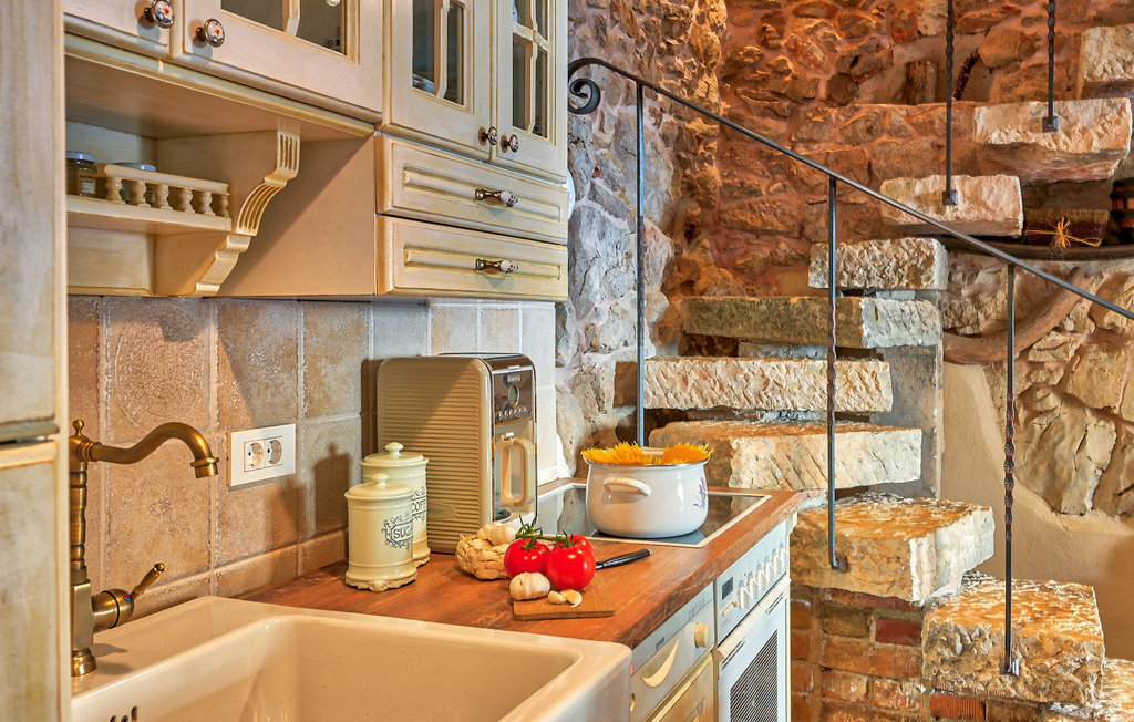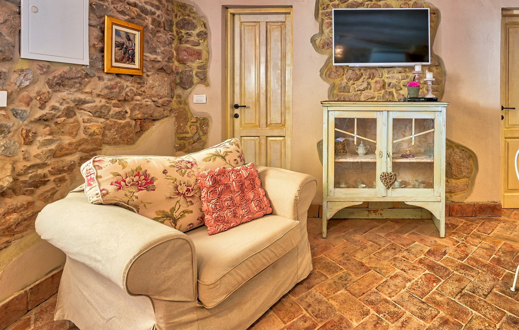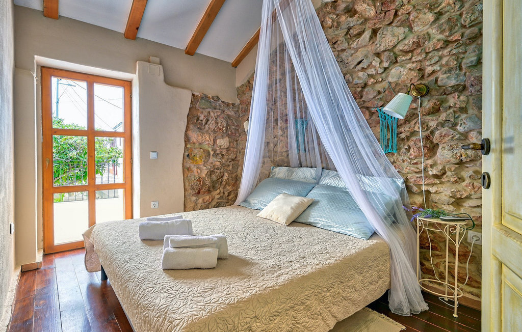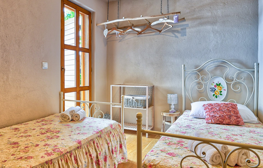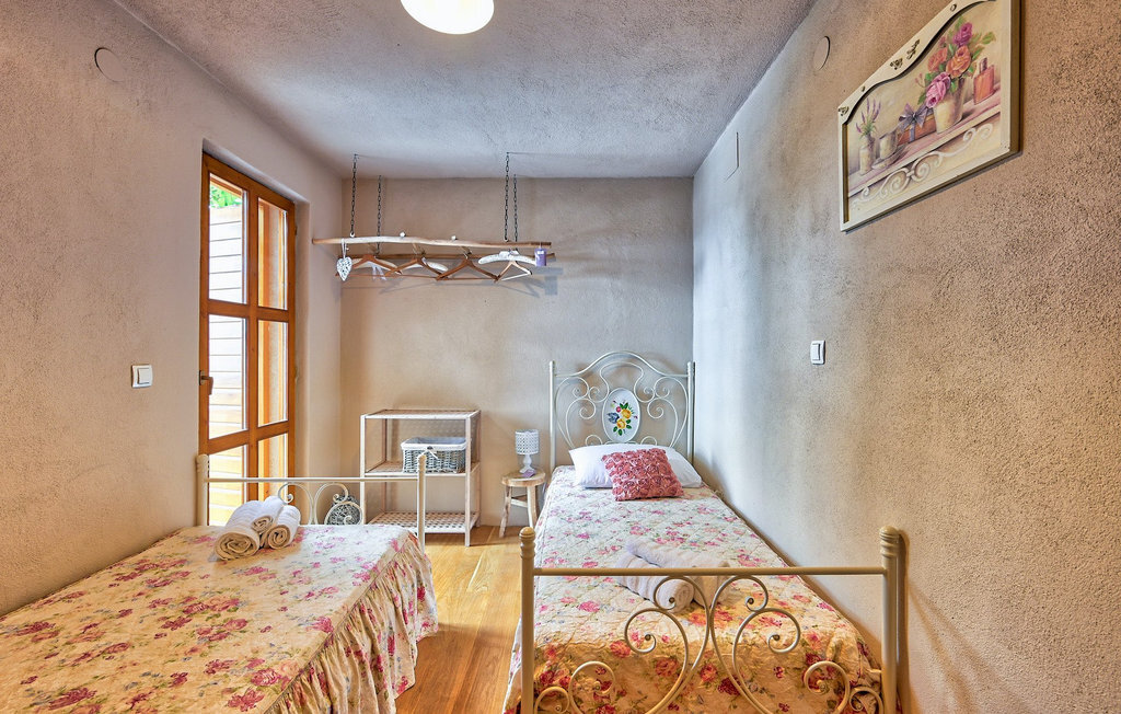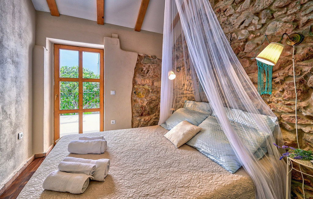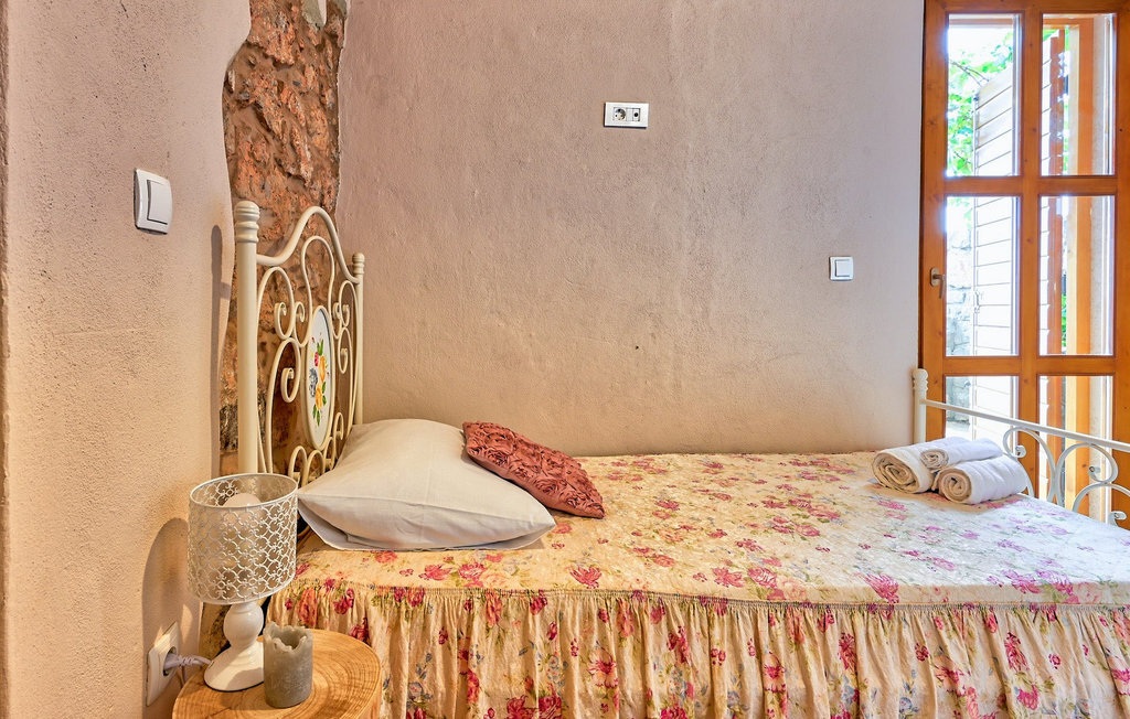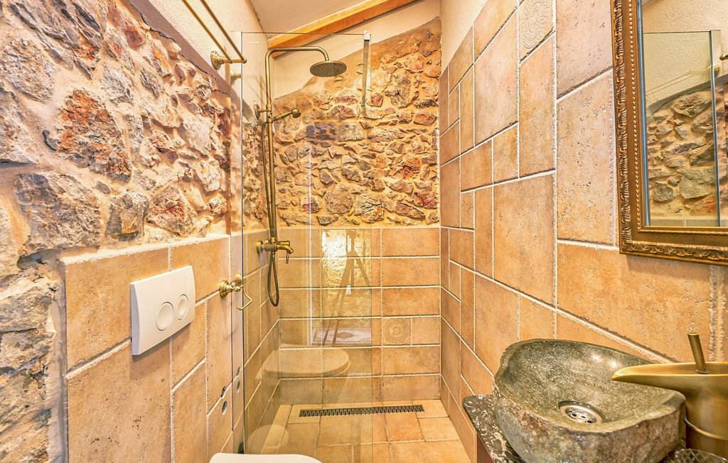 Au rez-de-chaussée se trouvent la cuisine, la salle à manger et le salon avec un poêle à bois, une chambre avec deux lits simples et une salle de bain avec douche à l'italienne. Un escalier en pierre élégant mène au premier étage, où se trouvent deux chambres à coucher avec lit double, une salle de bain et une sortie sur le balcon.