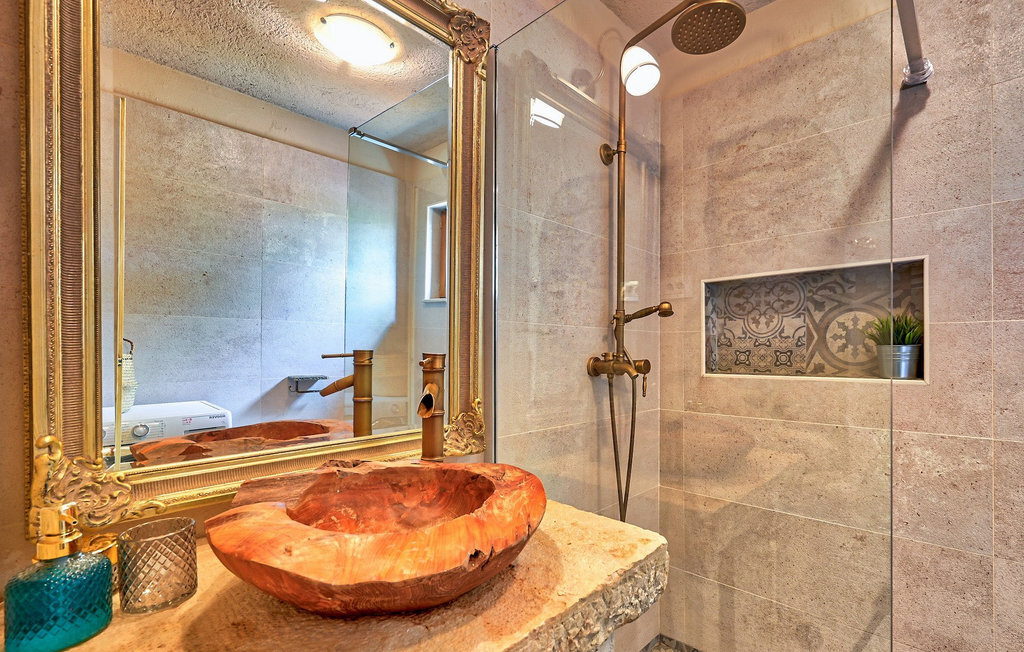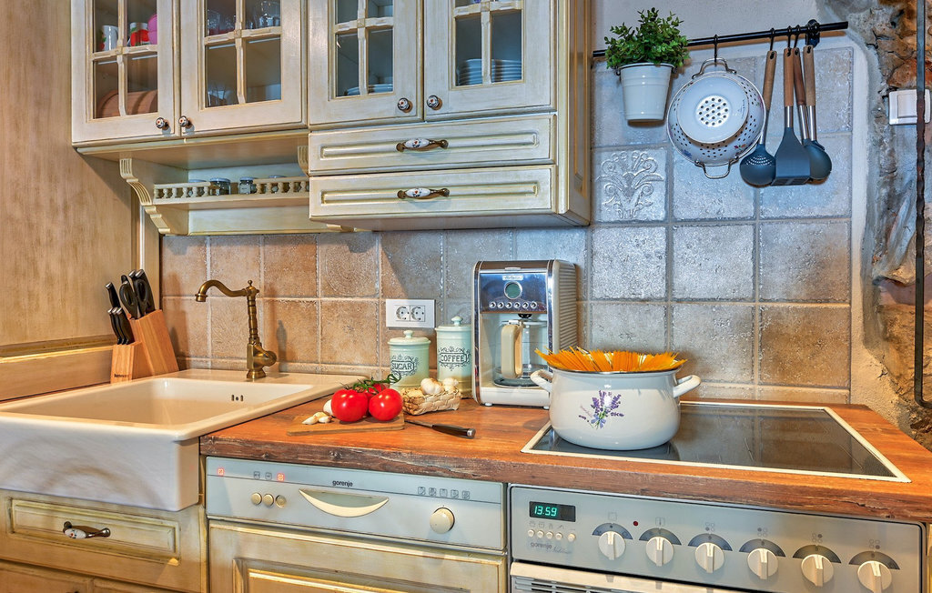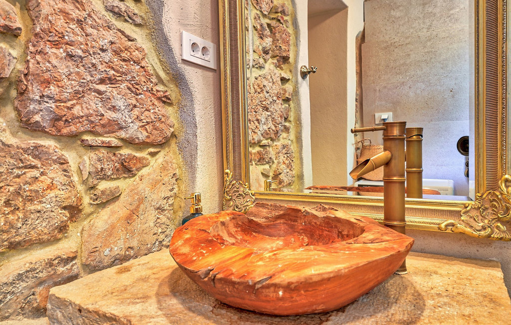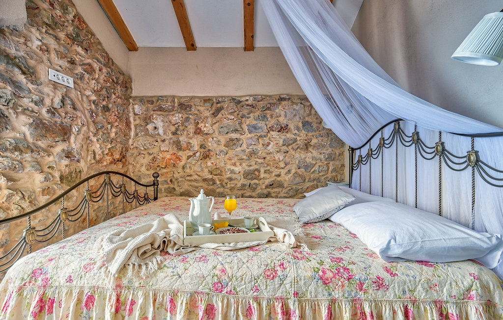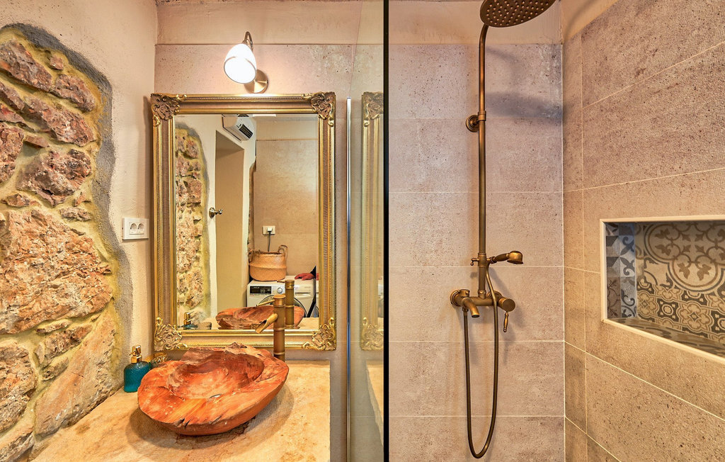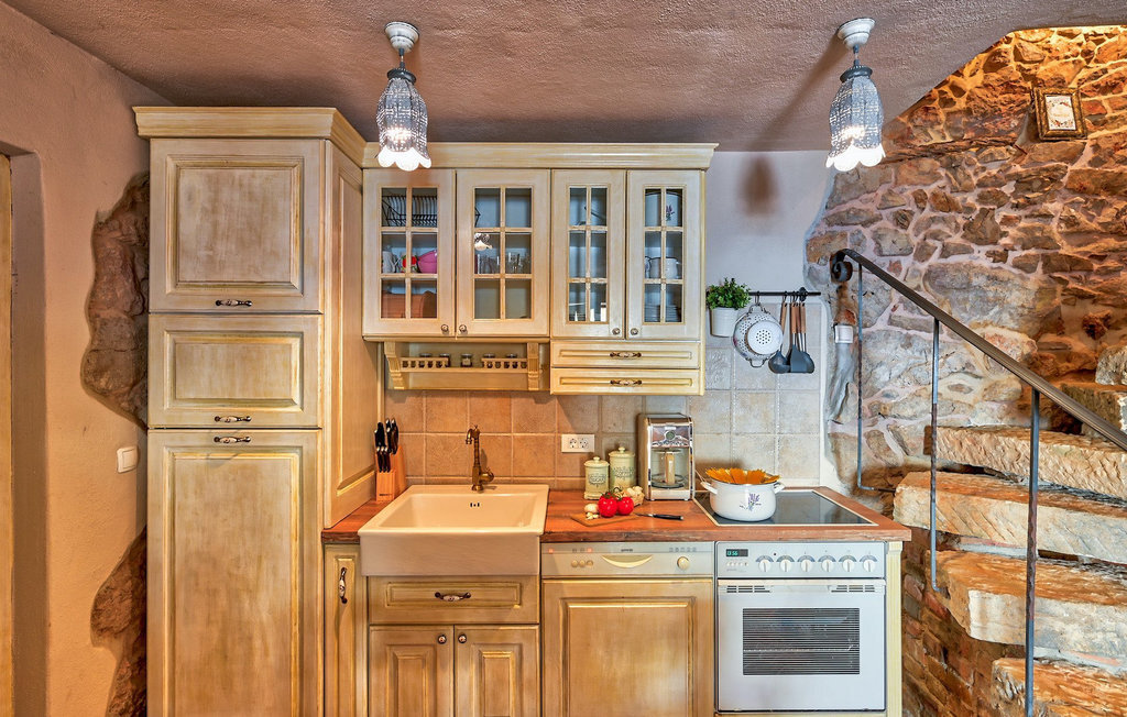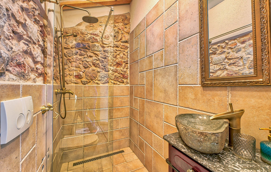 Au rez-de-chaussée se trouvent la cuisine, la salle à manger et le salon avec un poêle à bois, une chambre avec deux lits simples et une salle de bain avec douche à l'italienne. Un escalier en pierre élégant mène au premier étage, où se trouvent deux chambres à coucher avec lit double, une salle de bain et une sortie sur le balcon.