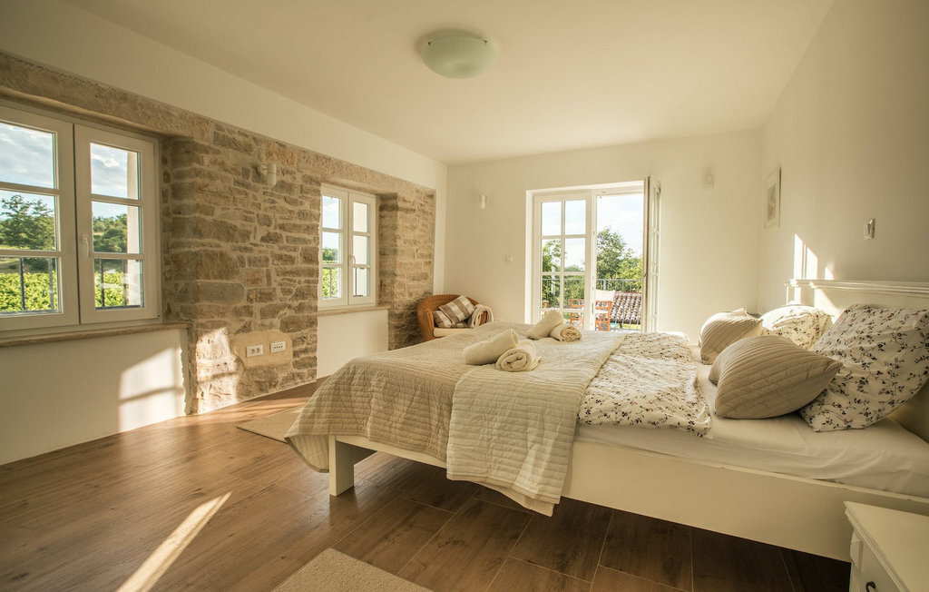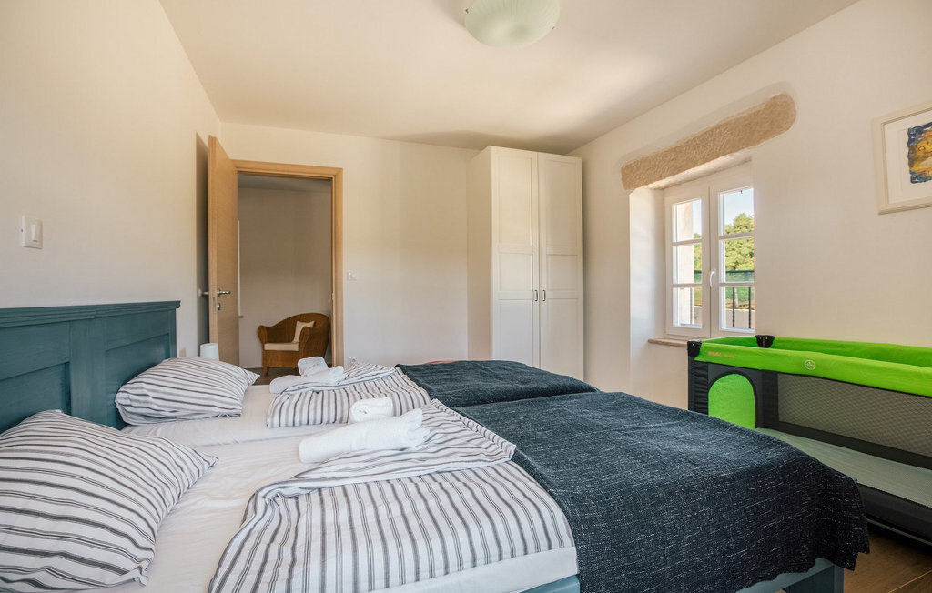 Les groupes plus jeunes ne sont pas autorisés!La magnifique et romantique villa Kanedolo est située dans un petit village appelé Momjan, à moins de 20 km de la ville côtière d'Umag avec ses magnifiques plages de galets et de rochers. Momjan et la région autour de Buje, la ville la plus proche, sont connus pour leurs collines pittoresques, leurs vignobles, leurs oliveraies et leur agrotourisme. Ne manquez pas les spécialités locales istriennes et méditerranéennes : truffes, huile d'olive, bœuf d'Istrie Bokarin, prosciutto et bon vin d'Istrie. La première ligne de chemin de fer d'Istrie, qui passe par Buje, a été récemment transformée en piste cyclable et offre de belles balades à travers les beaux paysages. La ville côtière d'Umag offre un grand choix d'activités de loisirs et d'installations touristiques ainsi qu'un petit port. Vous trouverez d'excellents restaurants, bars et cafés dans les charmantes rues pavées de la ville. Aujourd'hui, Umag est surtout connue pour le sport : Chaque mois de juillet, l'ATP Croatia Open s'y déroule, avec de nombreux grands noms du tennis masculin. Près de la ville se trouve le parc aquatique primé Istralandia - idéal pour une journée de divertissement pour toute la famille.