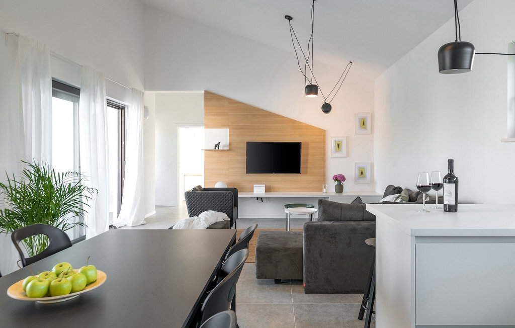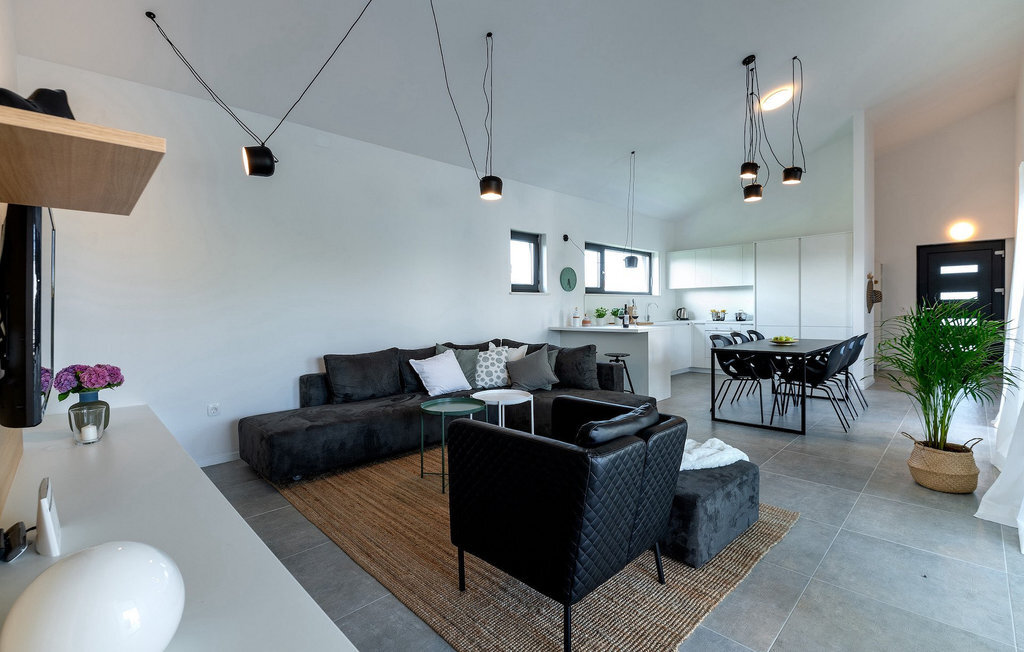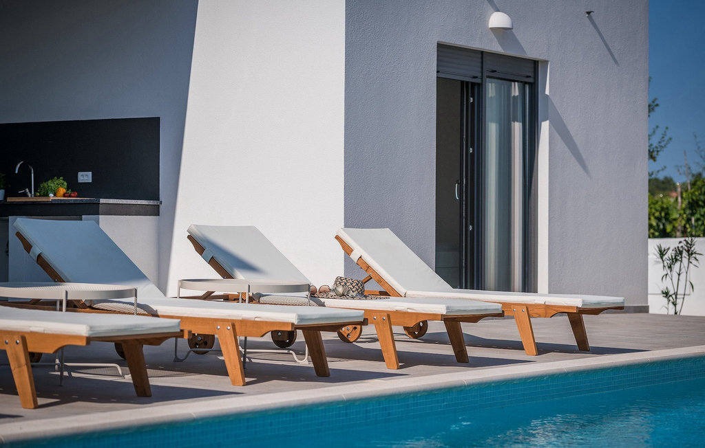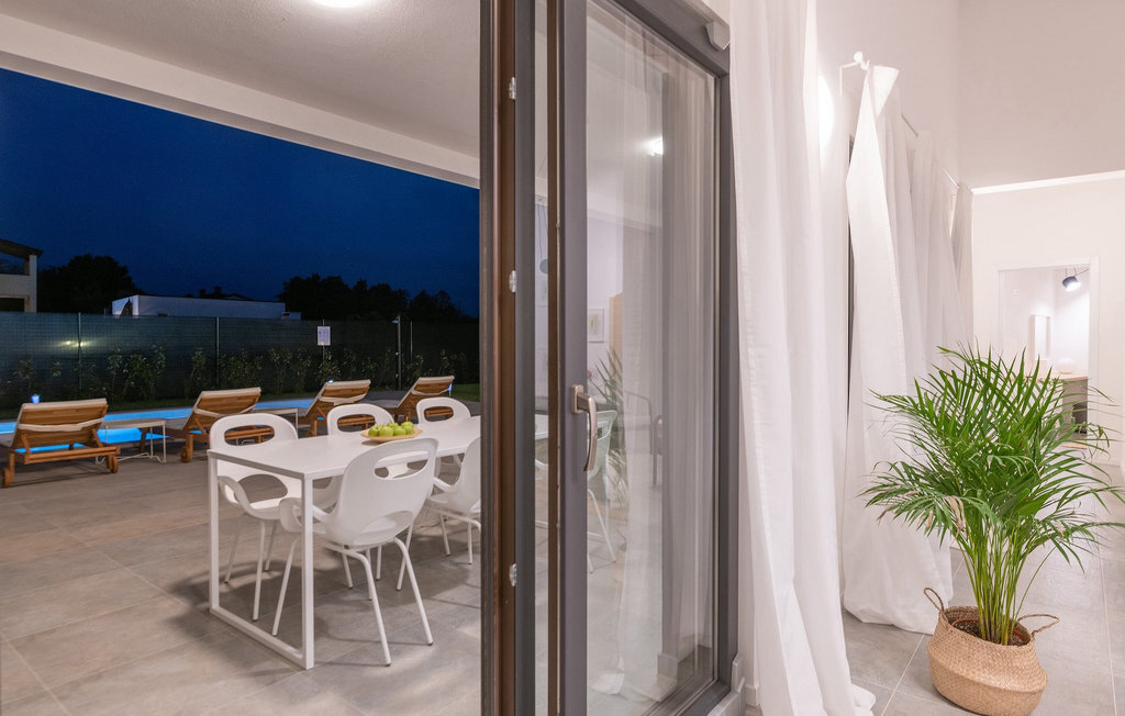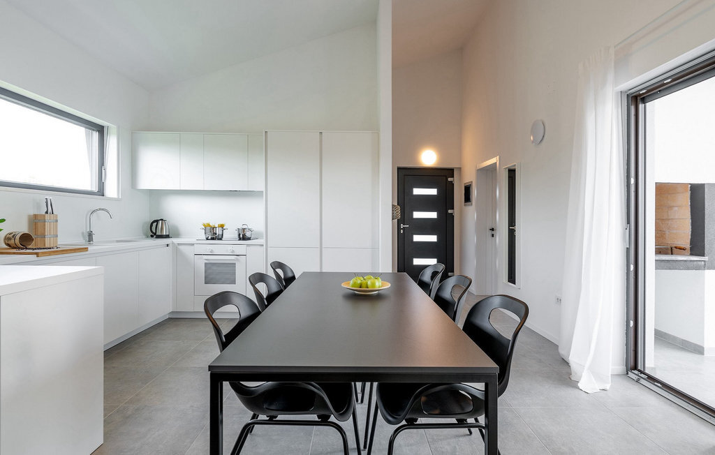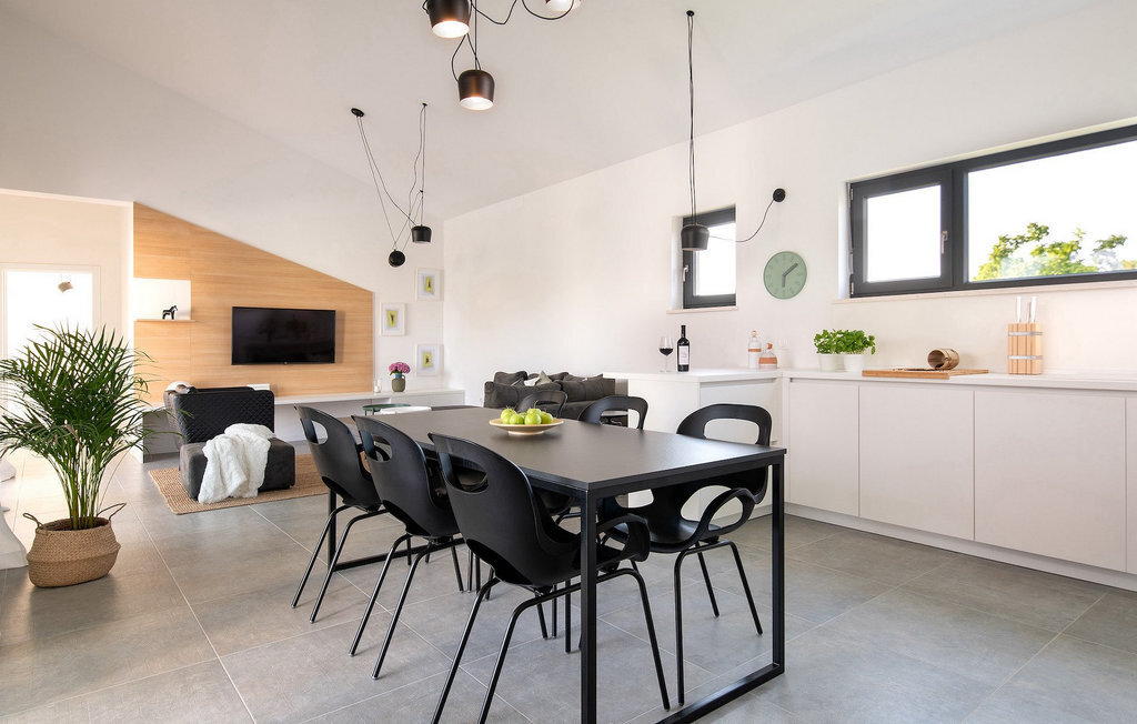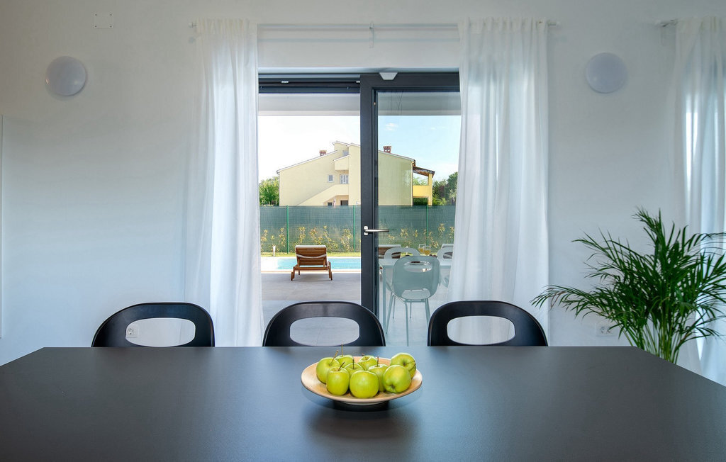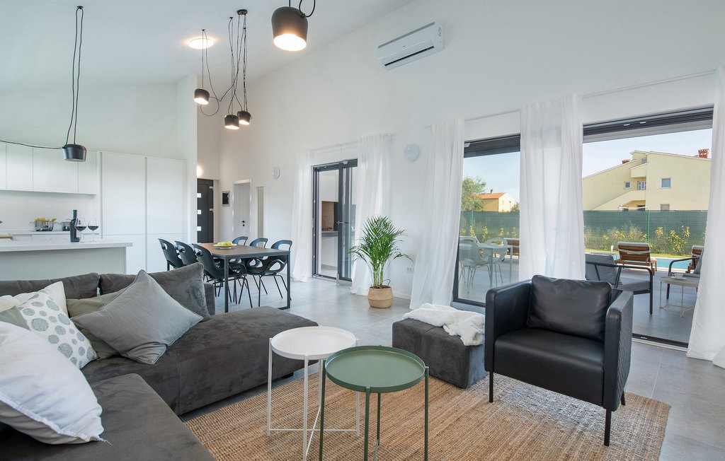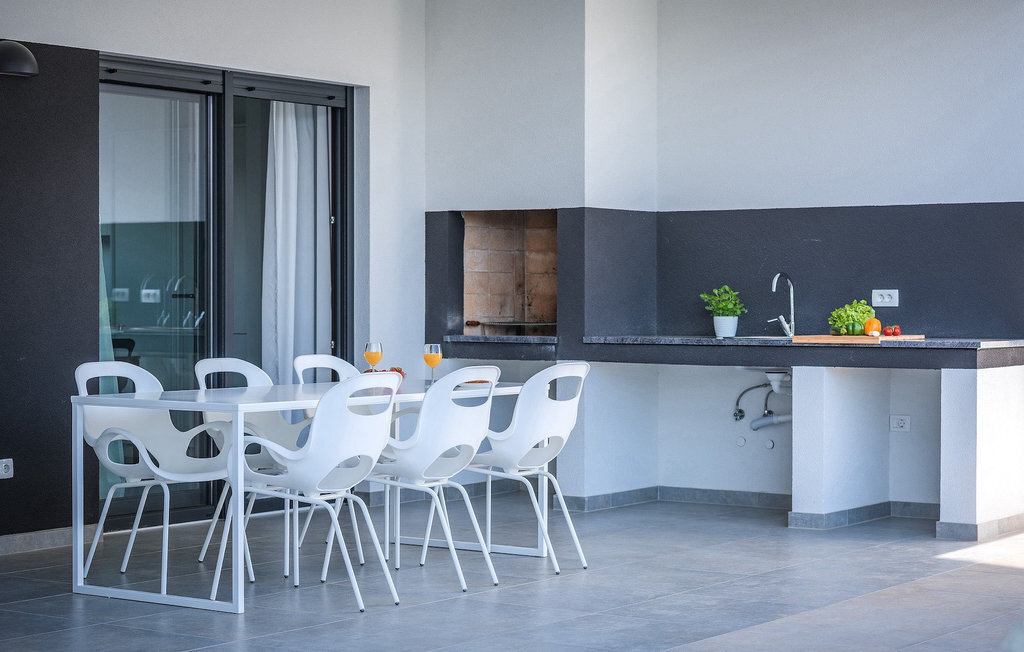 Le salon/salle à manger et la cuisine offrent un accès direct à l'extérieur, où vous attend le point fort de la villa : la piscine privée, qui vous rafraîchira pendant les chaudes journées d'été.