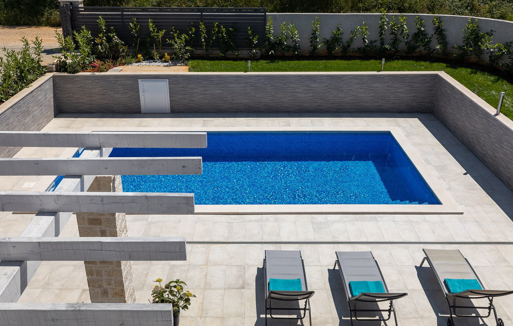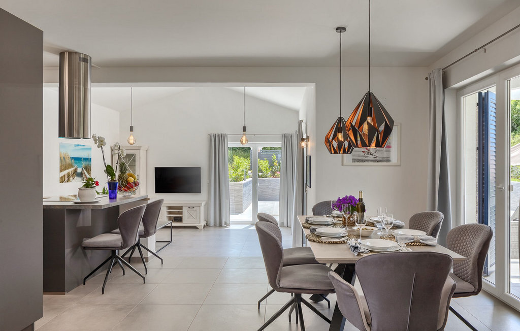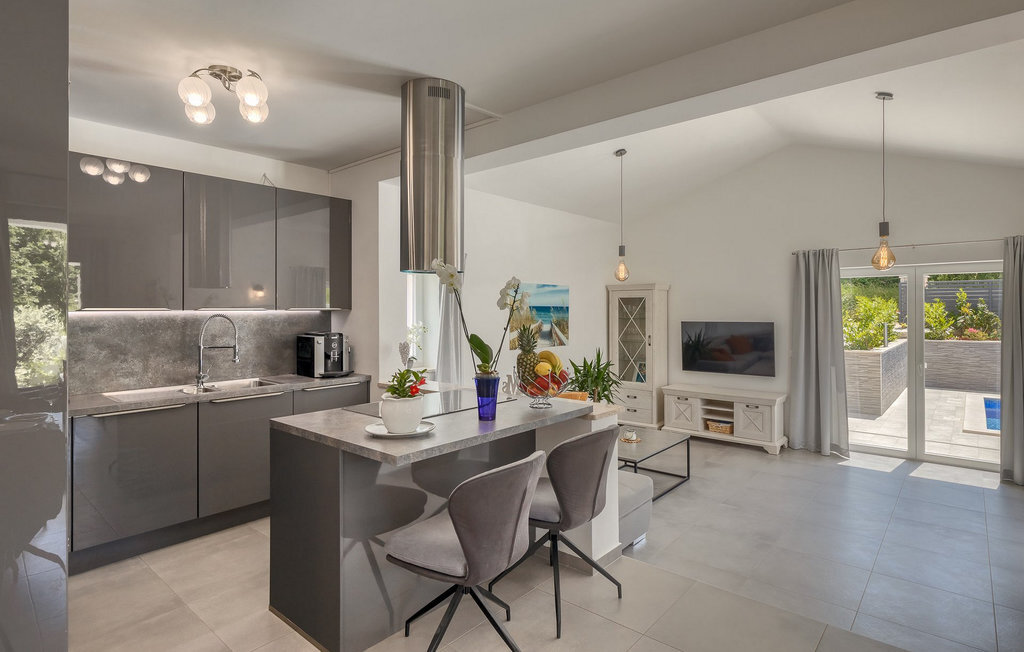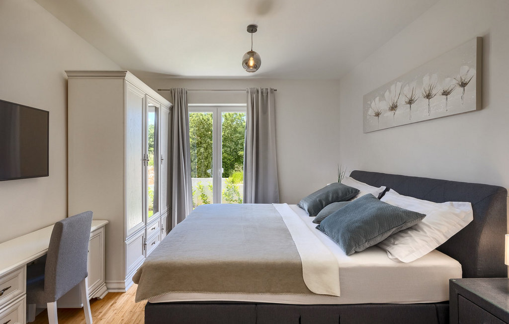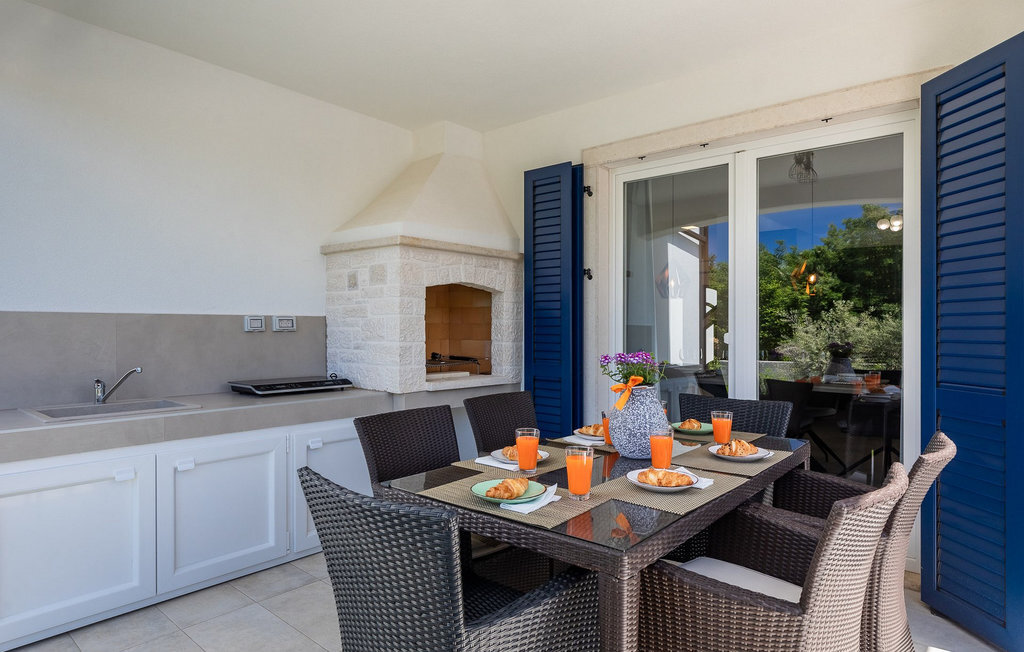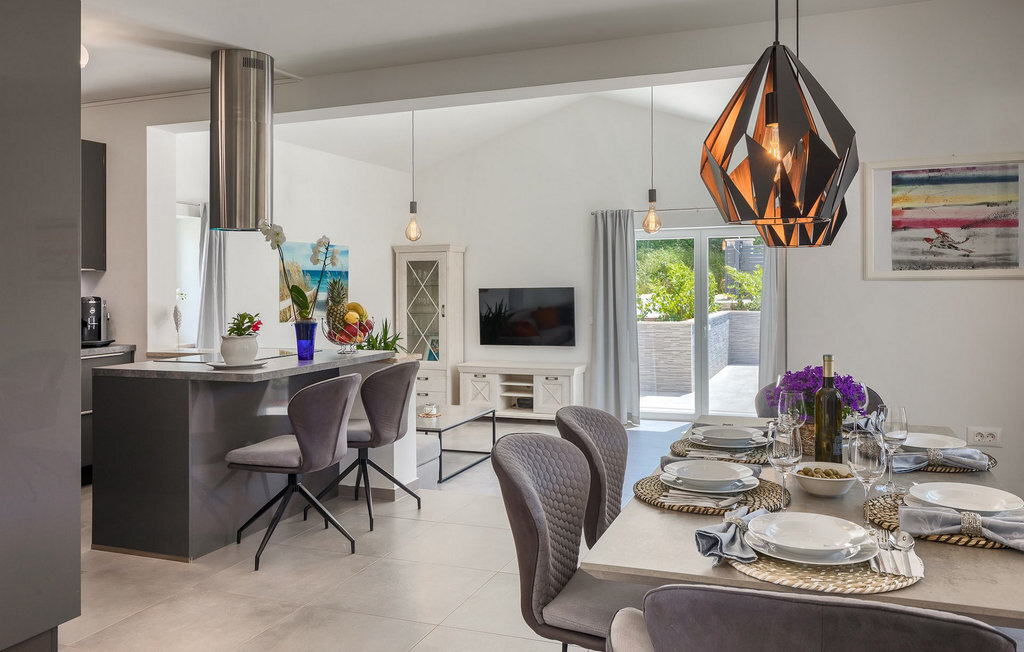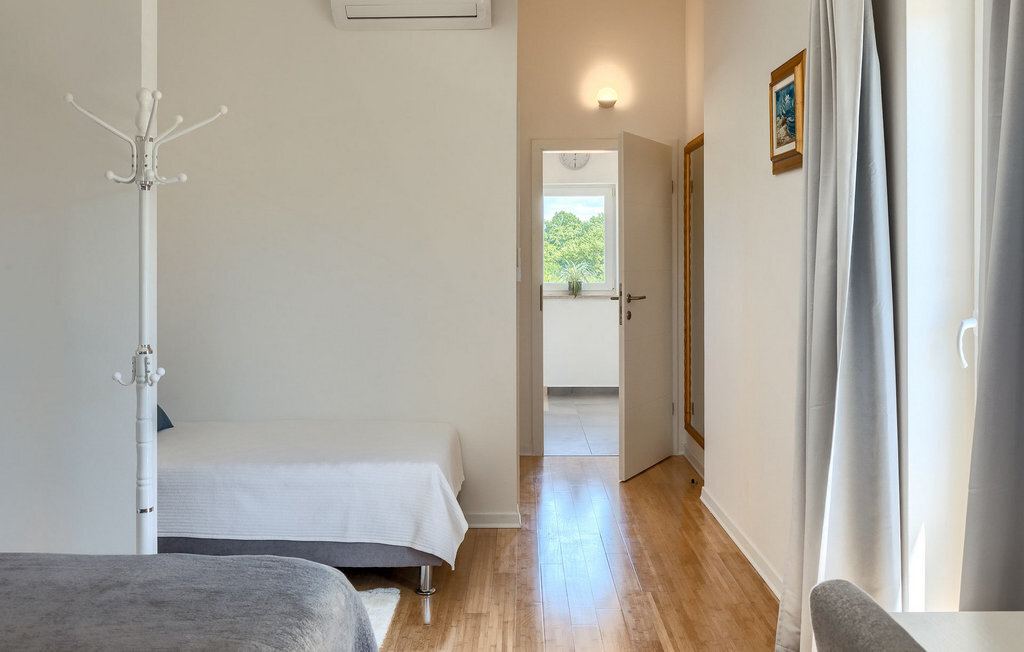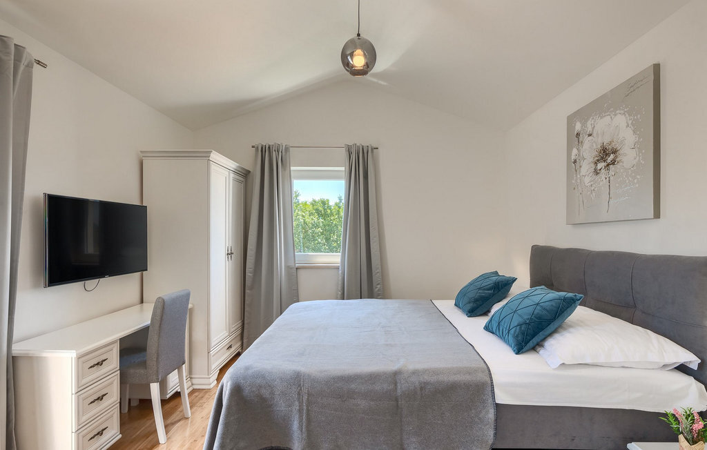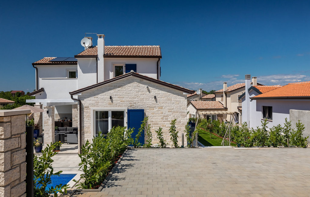 Dans le salon, vous trouverez un confortable canapé gris sur lequel vous pourrez vous détendre ou passer une soirée cinéma en famille ou entre amis. La porte-fenêtre du salon offre une vue imprenable sur la piscine et le magnifique paysage. Au premier étage se trouvent deux chambres à coucher avec salle de bain en suite. Les deux chambres ont accès au balcon. À l'extérieur de la villa, sur la terrasse, il y a une table avec 8 chaises où vous pouvez servir un délicieux repas préparé sur le barbecue au charbon de bois disponible. Il y a également des meubles de jardin où vous pourrez vous détendre après une longue journée de plaisir en sirotant une boisson fraîche. Rafraîchissez-vous dans la piscine devant la terrasse ou détendez-vous sur les chaises longues. Les bains de soleil sur les chaises longues complèteront votre journée. Idéale pour de belles vacances en famille ou entre amis, la Villa Camelia vous séduira par son bel environnement méditerranéen.La Villa Camelia se trouve non loin de Novigrad, dans la petite ville de Tar. Tar est connue pour sa culture d'oliviers et sa pêche, ainsi que pour ses hôtes accueillants. Le centre de la petite ville conserve l'esprit traditionnel de l'Istrie dans de nombreuses maisons en pierre et tavernes où vous pourrez déguster les meilleures spécialités istriennes, notamment l'huile d'olive, les fruits de mer, les truffes et de délicieux desserts. La péninsule de Lanterna est une destination idéale pour tous les amateurs de soleil et de mer. Vous pourrez pratiquer de nombreuses activités sportives sur la plage ou vous détendre dans l'un des cafés avec vue sur Novigrad. Les amoureux de la nature ne doivent pas manquer de se rendre à l'embouchure de la rivière Mirna. La Mirna est la plus longue rivière d'Istrie et s'étend le long de la forêt de Motovun, qui est une destination de choix pour les amateurs de truffes. La rivière Mirna est une réserve ornithologique appréciée et connue. Le long de la rivière, il y a de petites villes comme Motovun, Gronjan et Oprtalj qui méritent d'être explorées.