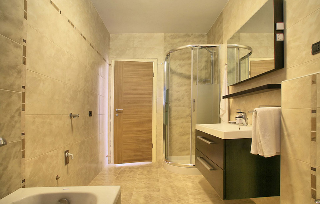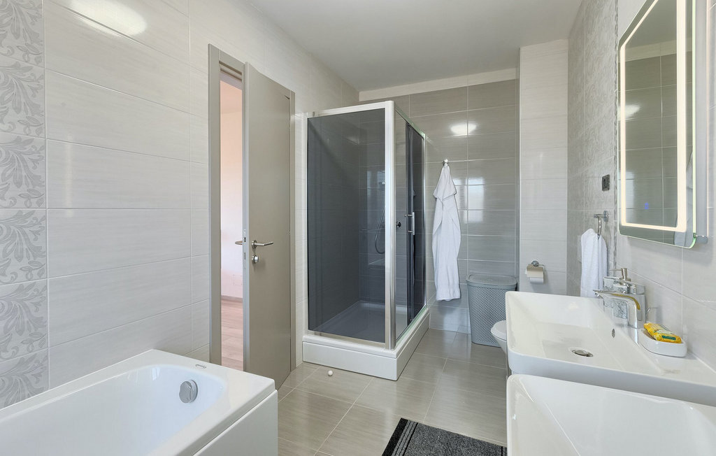 Quatre autres chambres à coucher vous attendent à l'étage supérieur et vous promettent des nuits d'été tranquilles. L'une des chambres est équipée d'un lit double et d'un lit simple et a accès à une salle de bain privée avec douche et baignoire. Il y a également une autre chambre avec un lit simple, deux chambres avec un lit double et une salle de bain avec douche et baignoire.