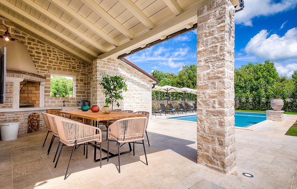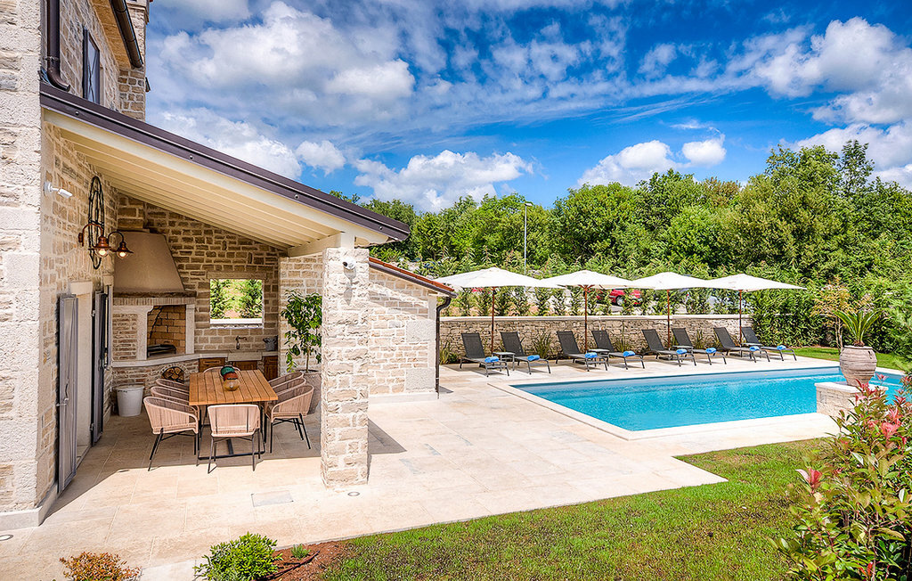 Élégante, stylée et très bien située, au milieu du paysage pittoresque de l'Istrie, mais toujours à proximité des plages ensoleillées et des villes côtières animées, la Villa Zoe offre un hébergement luxueux où vous pourrez profiter de chaque minute de vos vacances en toute décontraction. Le rez-de-chaussée est entièrement consacré à la détente. L'espace magnifique et spacieux est divisé par une arche en pierre en zones de salon, de salle à manger et de cuisine, avec d'immenses portes-fenêtres qui laissent entrer une abondance de lumière chaude d'Istrie. Les murs en pierre naturelle, les plafonds à poutres en bois et la magnifique cheminée créent une atmosphère chaleureuse et accueillante, tandis que le mélange de meubles modernes et vintage, ainsi que l'équipement exquis, vous procurent un confort de première classe. Les quatre chambres à coucher meublées avec style sont réparties sur l'étage supérieur, tandis que le rez-de-chaussée s'ouvre directement sur l'alléchante piscine privée, l'endroit merveilleux pour se reposer et se détendre. La jolie véranda couverte, avec son authentique barbecue intégré et sa grande table à manger, est un refuge attrayant contre la chaleur de l'été, ainsi que l'endroit parfait pour des repas savoureux en plein air.