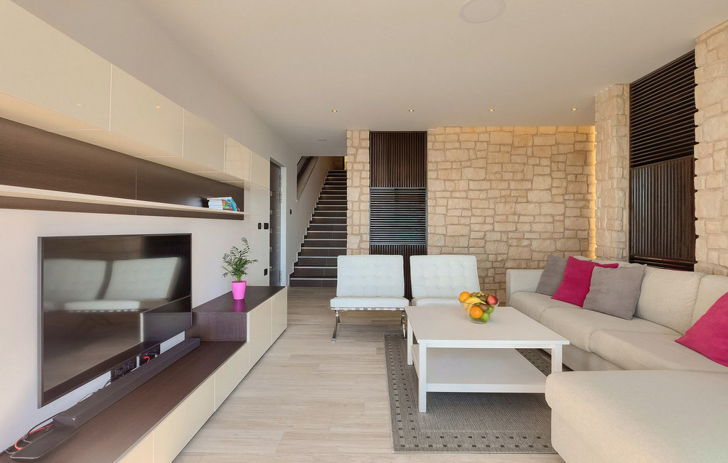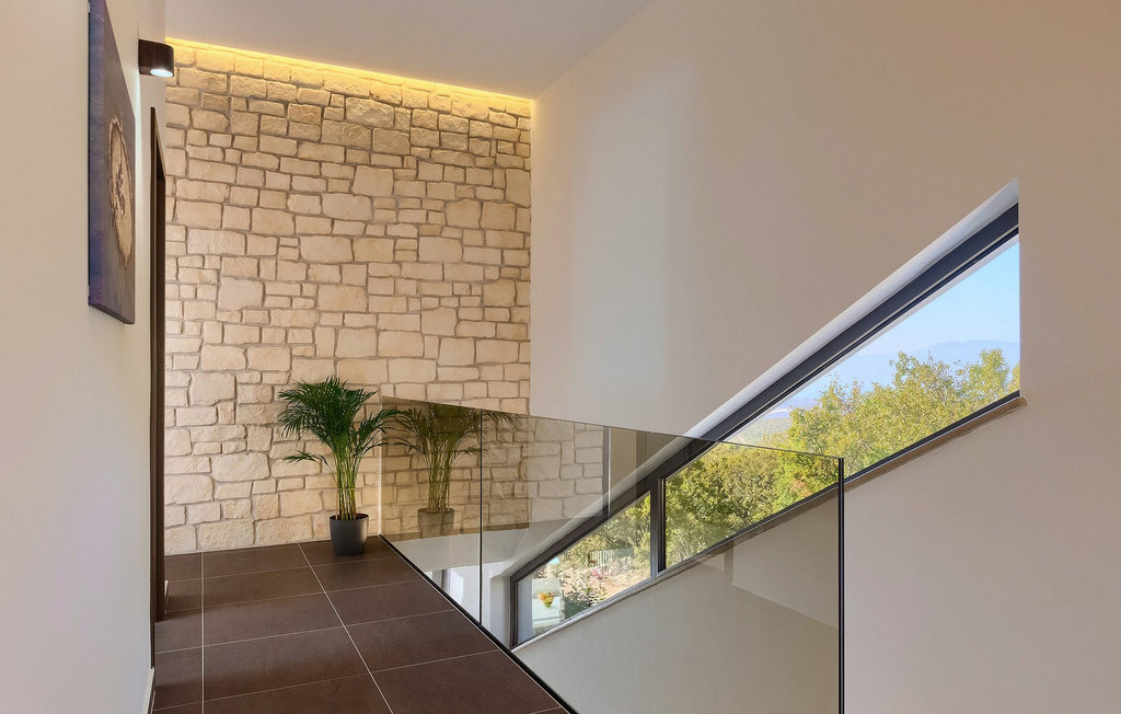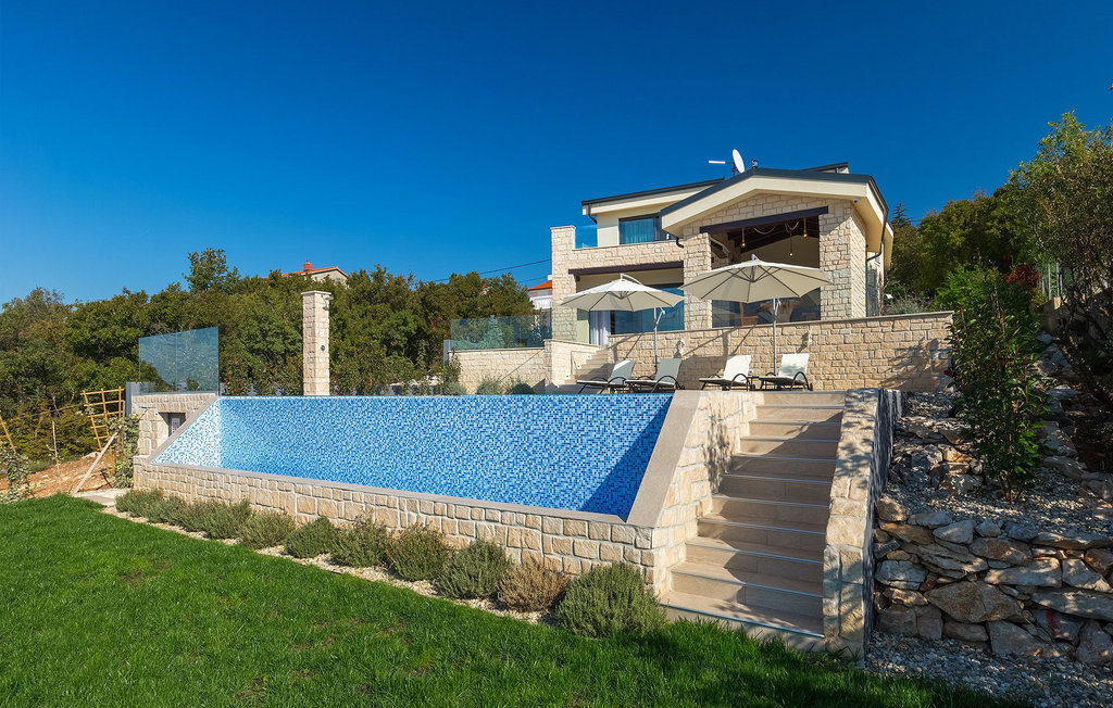 Depuis l'étage inférieur, vous avez un accès direct au beau jardin, qui est divisé en étages et dispose d'une piscine privée et d'une grande pelouse. À côté de la piscine, vous pouvez vous détendre sur l'une des chaises longues et profiter de la vue panoramique sur la mer et les îles environnantes, ou passer du temps avec vos amis dans l'espace extérieur.