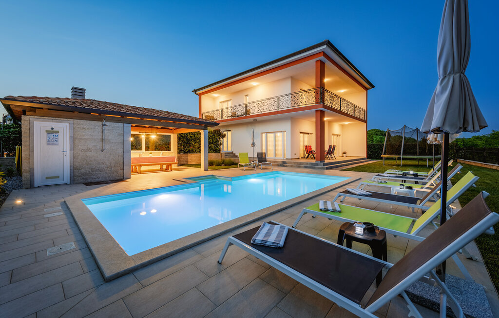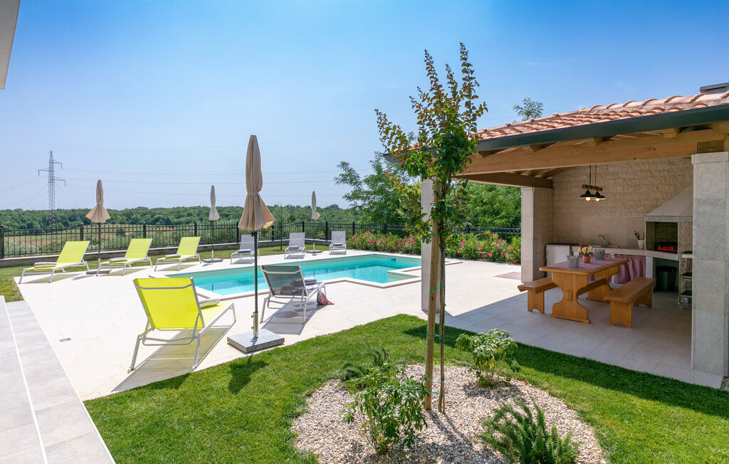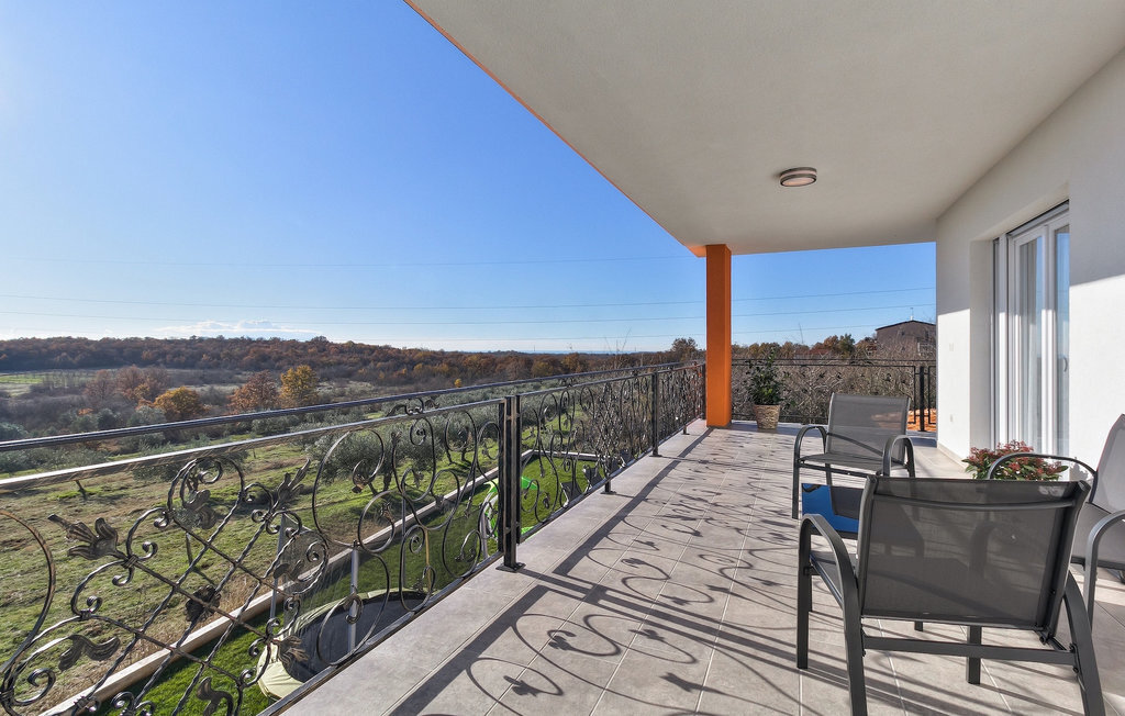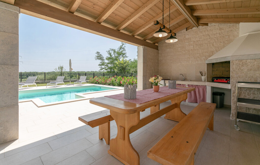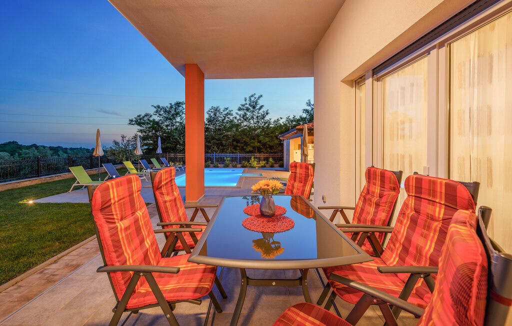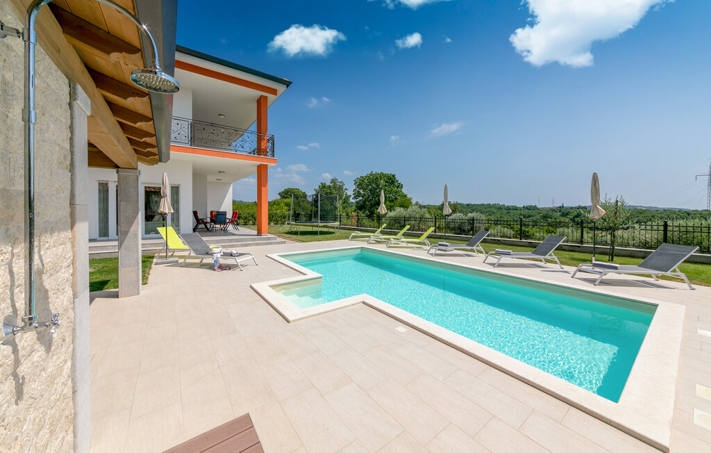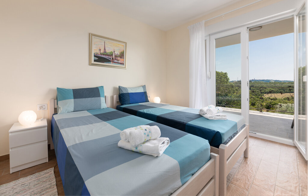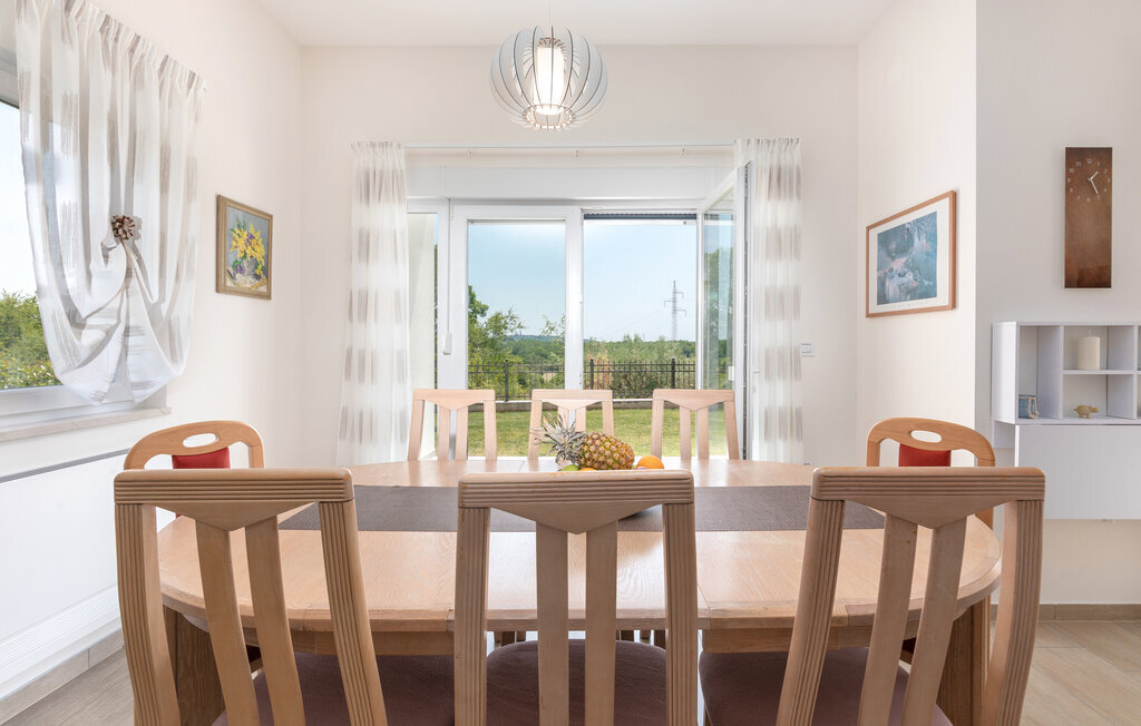 L'intérieur de la villa est moderne et offre des vacances reposantes et tranquilles. Au premier étage se trouvent 3 chambres confortables avec salles de bains privées. Deux chambres disposent de lits doubles et la troisième de deux lits simples. Toutes les pièces sont chauffées et refroidies par la climatisation. Les chambres à l'étage donnent accès à un grand balcon commun avec une excellente vue sur le paysage verdoyant d'Istrie. Profitez de vos soirées ici avec un verre de vin local istrien de cette région, connue pour ses routes du vin.La Villa Eva est située dans le petit village de Katel, sur une colline surplombant la rivière Dragonja, qui offre une vue magique sur le paysage istrien. Katel se trouve dans la partie nord-ouest de la péninsule d'Istrie, à proximité de la belle petite ville de Buje, que vous devez absolument visiter. À seulement 2 km de la villa se trouve la ville du vin et de l'huile d'olive, Buje. Vous pourrez y admirer de nombreuses églises bien conservées, visiter un musée ethnographique ou simplement vous détendre en vous promenant le long des nombreuses routes du vin et en dégustant du vin ou de l'huile d'olive locaux. Pour les amateurs de vacances actives, il y a également de nombreuses pistes cyclables dans cette région. Détendez-vous dans la belle nature à l'ombre des pins à côté de la mer cristalline sur la plage de Kanegra, à seulement 8,5 km de la villa. Le centre touristique d'Umag se trouve à environ 15 minutes en voiture. Umag offre de nombreuses attractions touristiques, des restaurants, des magasins, des cafés, des bars et des événements. L'un d'entre eux est la coupe de tennis ATP Croatia Open, mondialement connue, qui se déroule en juillet.