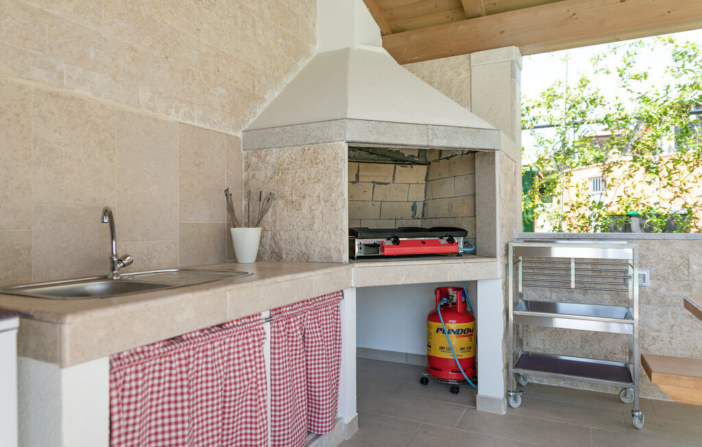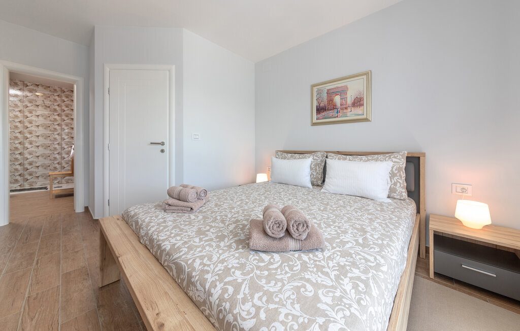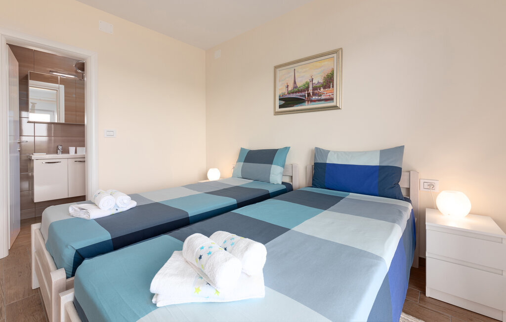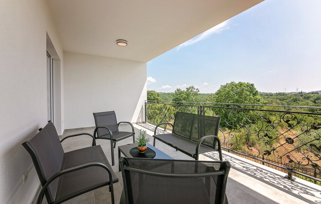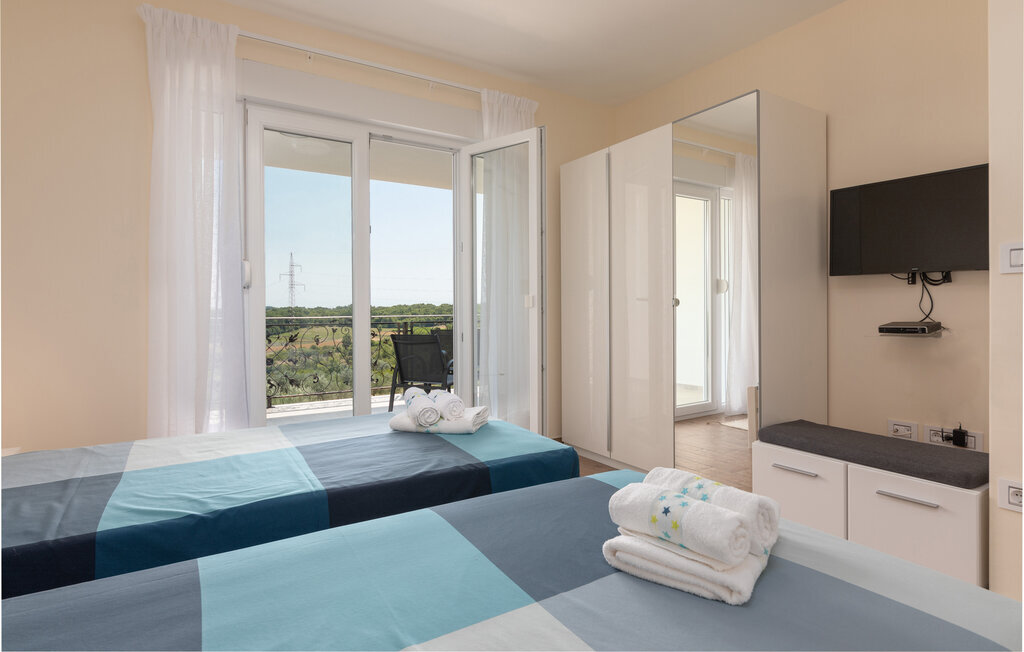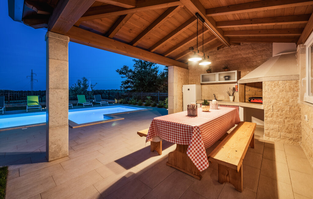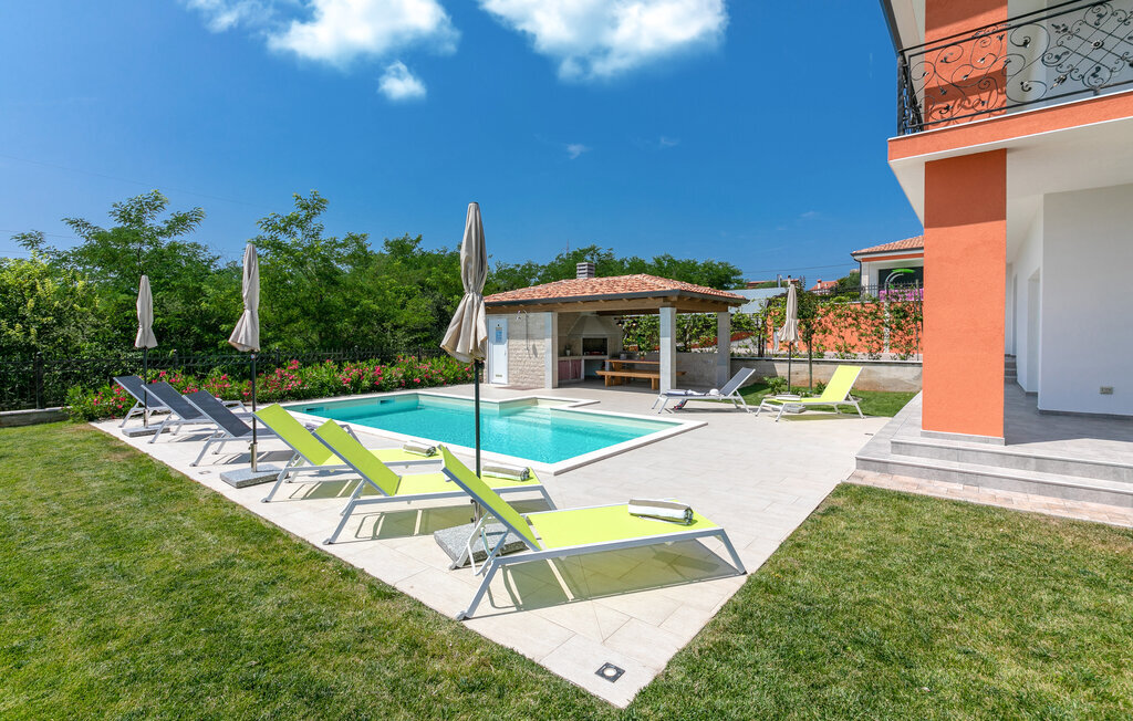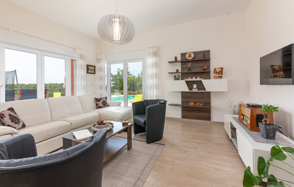 L'intérieur de la villa est moderne et offre des vacances reposantes et tranquilles. Au premier étage se trouvent 3 chambres confortables avec salles de bains privées. Deux chambres disposent de lits doubles et la troisième de deux lits simples. Toutes les pièces sont chauffées et refroidies par la climatisation. Les chambres à l'étage donnent accès à un grand balcon commun avec une excellente vue sur le paysage verdoyant d'Istrie. Profitez de vos soirées ici avec un verre de vin local istrien de cette région, connue pour ses routes du vin.La Villa Eva est située dans le petit village de Katel, sur une colline surplombant la rivière Dragonja, qui offre une vue magique sur le paysage istrien. Katel se trouve dans la partie nord-ouest de la péninsule d'Istrie, à proximité de la belle petite ville de Buje, que vous devez absolument visiter. À seulement 2 km de la villa se trouve la ville du vin et de l'huile d'olive, Buje. Vous pourrez y admirer de nombreuses églises bien conservées, visiter un musée ethnographique ou simplement vous détendre en vous promenant le long des nombreuses routes du vin et en dégustant du vin ou de l'huile d'olive locaux. Pour les amateurs de vacances actives, il y a également de nombreuses pistes cyclables dans cette région. Détendez-vous dans la belle nature à l'ombre des pins à côté de la mer cristalline sur la plage de Kanegra, à seulement 8,5 km de la villa. Le centre touristique d'Umag se trouve à environ 15 minutes en voiture. Umag offre de nombreuses attractions touristiques, des restaurants, des magasins, des cafés, des bars et des événements. L'un d'entre eux est la coupe de tennis ATP Croatia Open, mondialement connue, qui se déroule en juillet.