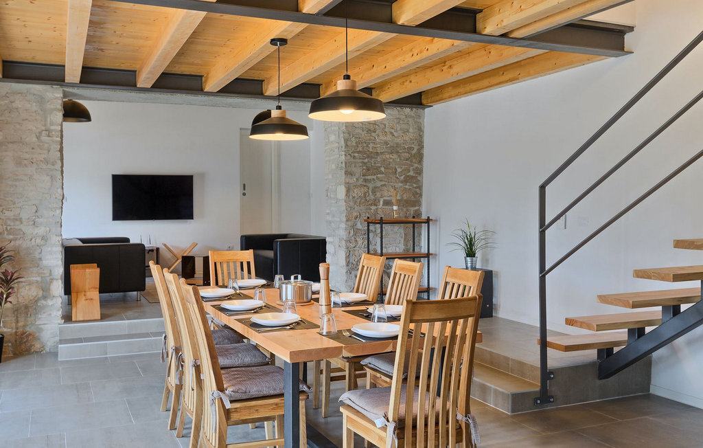 Au rez-de-chaussée se trouve un impressionnant espace ouvert pour le salon, la salle à manger et la cuisine. Le mélange harmonieux des styles traditionnel et contemporain crée l'ambiance idéale pour passer des moments agréables avec toute la famille et les amis. Les grandes portes-fenêtres apportent beaucoup de lumière naturelle et offrent une belle vue sur la piscine et le paysage idyllique.