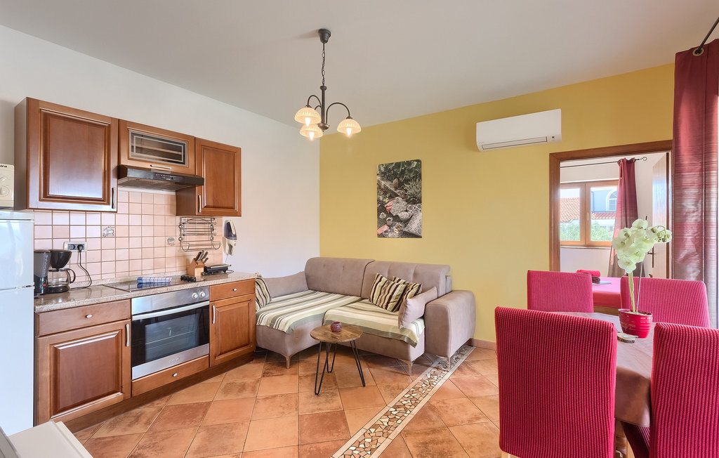 Le deuxième appartement au premier étage dispose de trois chambres à coucher (deux lits doubles et un lit superposé). Il offre également une kitchenette, un coin repas pour quatre personnes et un balcon avec une table et des chaises pour quatre personnes.
