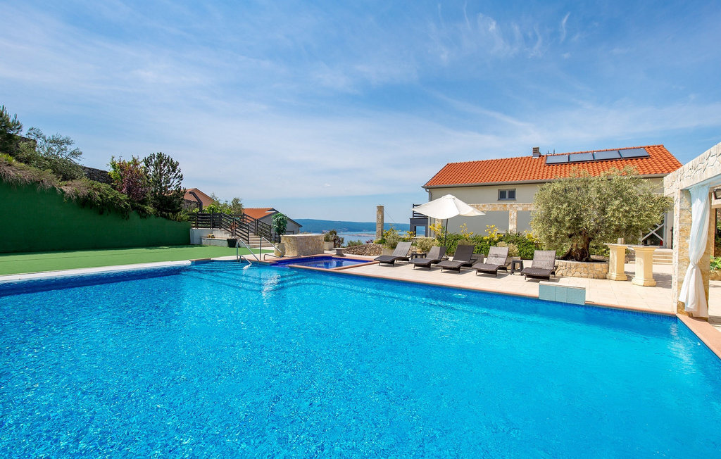 Cette luxueuse villa peut accueillir 18 personnes, avec un total de 9 chambres, 4 salles de bains et 4 cuisines entièrement équipées, ce qui en fait le choix idéal pour les grandes familles et les groupes d'amis. Il est presque impossible de ne pas trouver un espace à son goût dans cette luxueuse villa. À l'intérieur, on a combiné un aménagement minimaliste et moderne avec des détails colorés et une atmosphère familiale confortable et chaleureuse. Le grand jardin soigneusement entretenu est équipé d'une piscine privée accueillante et de 10 chaises longues où vous pourrez passer des vacances relaxantes. La villa est parfaite pour ceux qui préfèrent un style de vie somptueux, c'est pourquoi vous pouvez également profiter d'un jacuzzi dans le jardin. La piscine est partiellement entourée d'une terrasse spacieuse avec un barbecue et une salle à manger pour 22 personnes. Pour les amateurs de sport, il y a un terrain de basket-ball. Un service de cuisine, ainsi qu'un service de massage sont disponibles sur demande et moyennant un supplément. Les propriétaires de la villa offrent à leurs hôtes des premiers rendez-vous dentaires gratuits dans leur cabinet et des rendez-vous beauté VIP dans leurs salons de beauté - pour tous les détails, veuillez contacter les propriétaires avant votre arrivée.