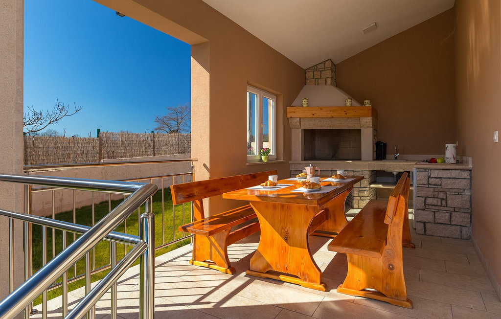 La terrasse surplombe la piscine et le jardin, tandis que vous préparez de délicieux repas dans la cuisine d'été bien équipée avec barbecue. La table à manger en bois avec des bancs vous invite à prendre un bon petit déjeuner avant de partir à la découverte de la région. Juste au coin, devant l'entrée du salon, il y a encore un ensemble supplémentaire de meubles de jardin.