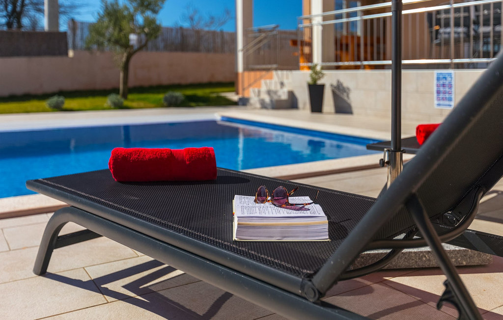 À l'extérieur, vous avez une superbe piscine avec des buses de massage - un rafraîchissement bienvenu lors des chaudes journées d'été - avec 8 chaises longues pour prendre le soleil et se détendre. Le grand jardin avec balançoire est idéal pour que vos enfants puissent jouer et s'amuser.