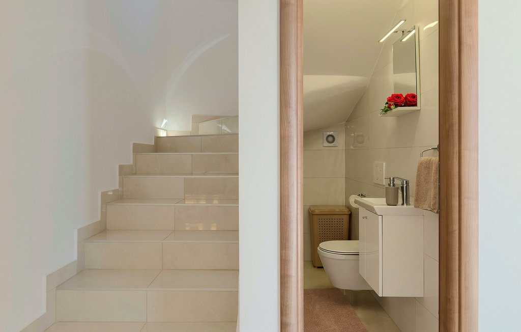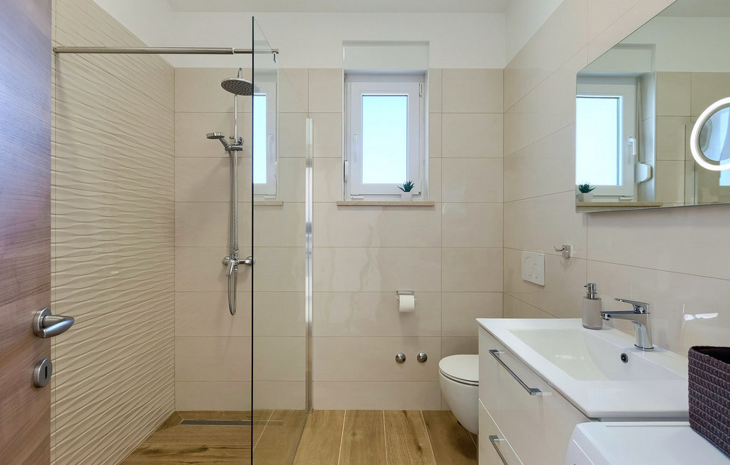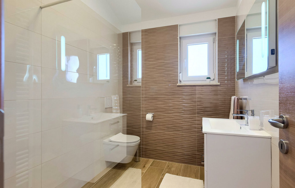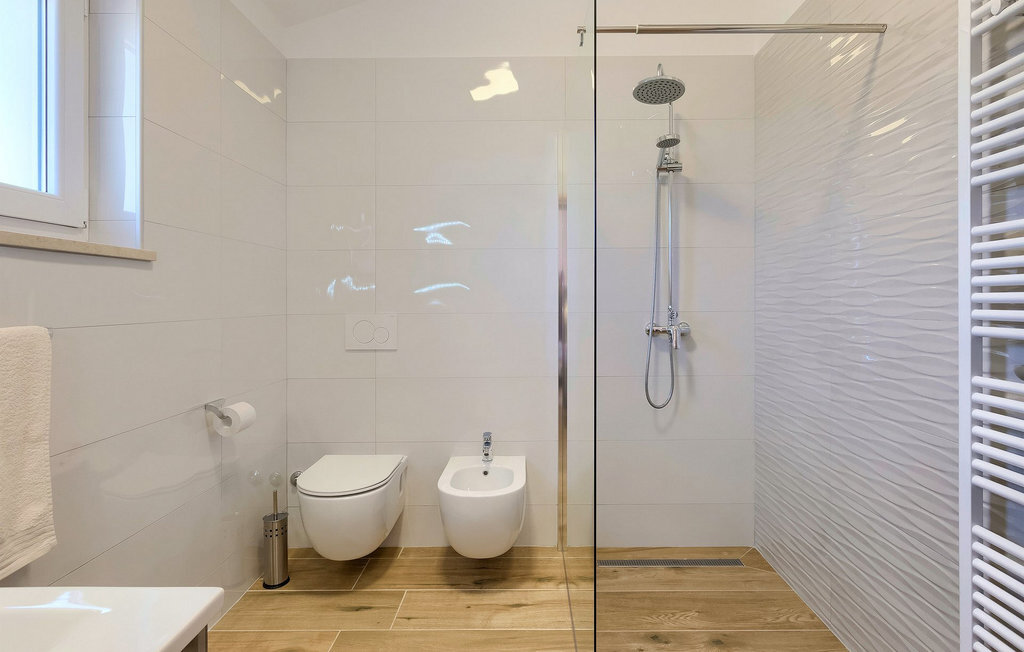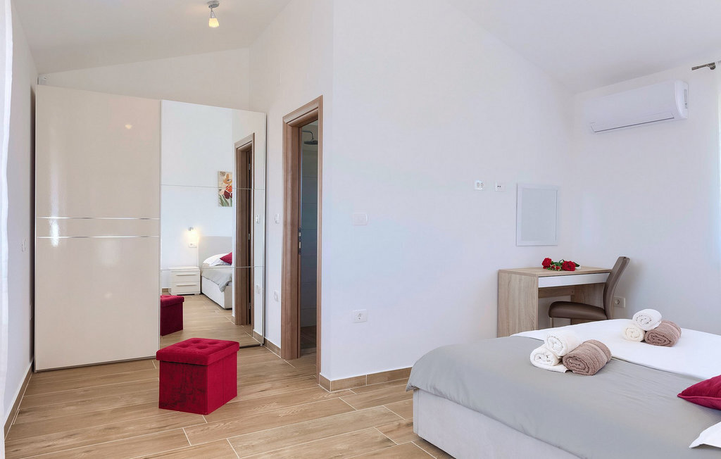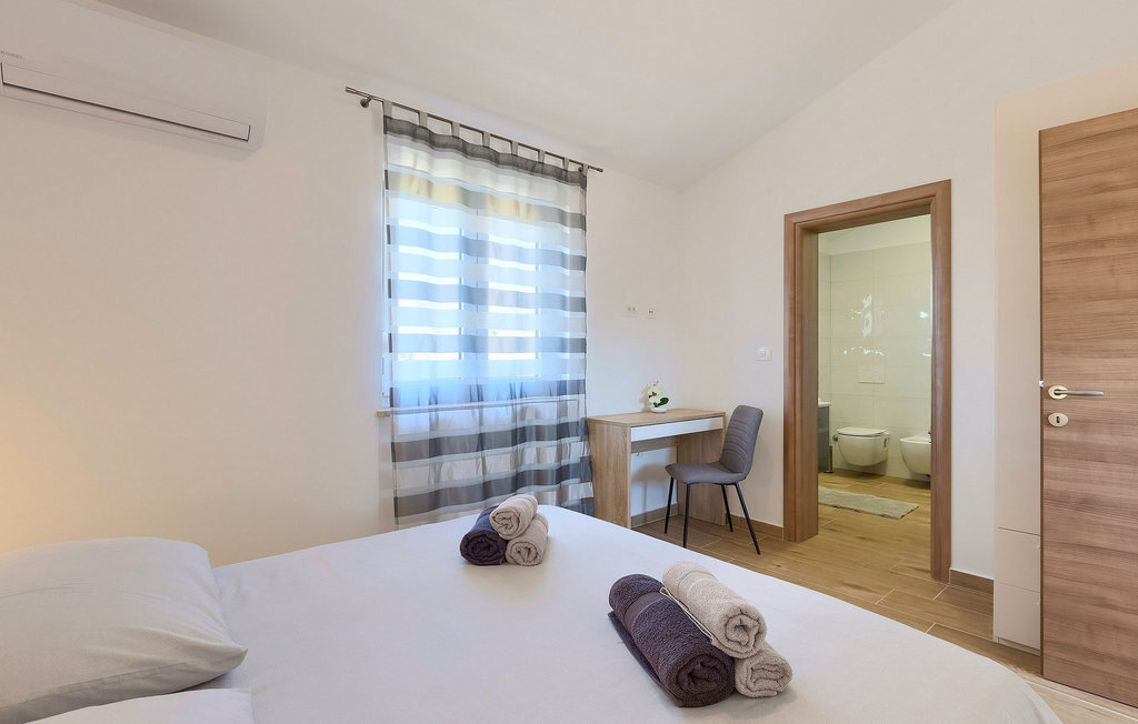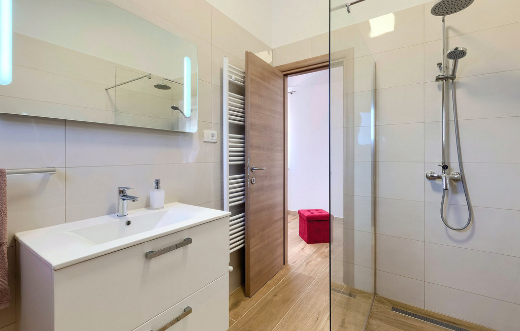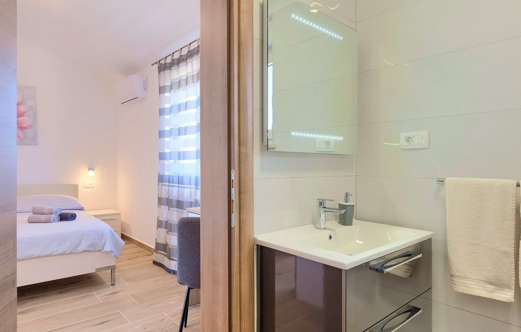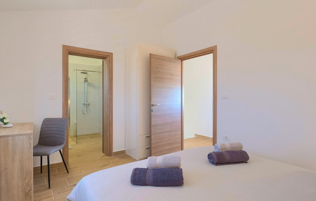 Au premier étage, la maison dispose de deux chambres modernes et confortables avec un lit double et une salle de bain privée. Toutes les salles de bains sont équipées de cabines de douche.