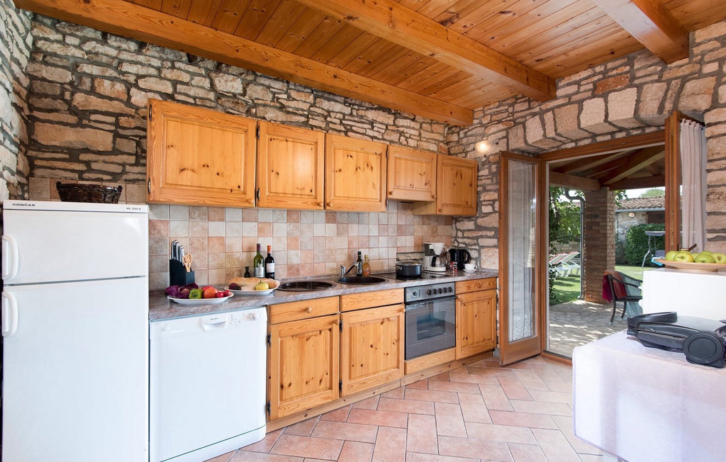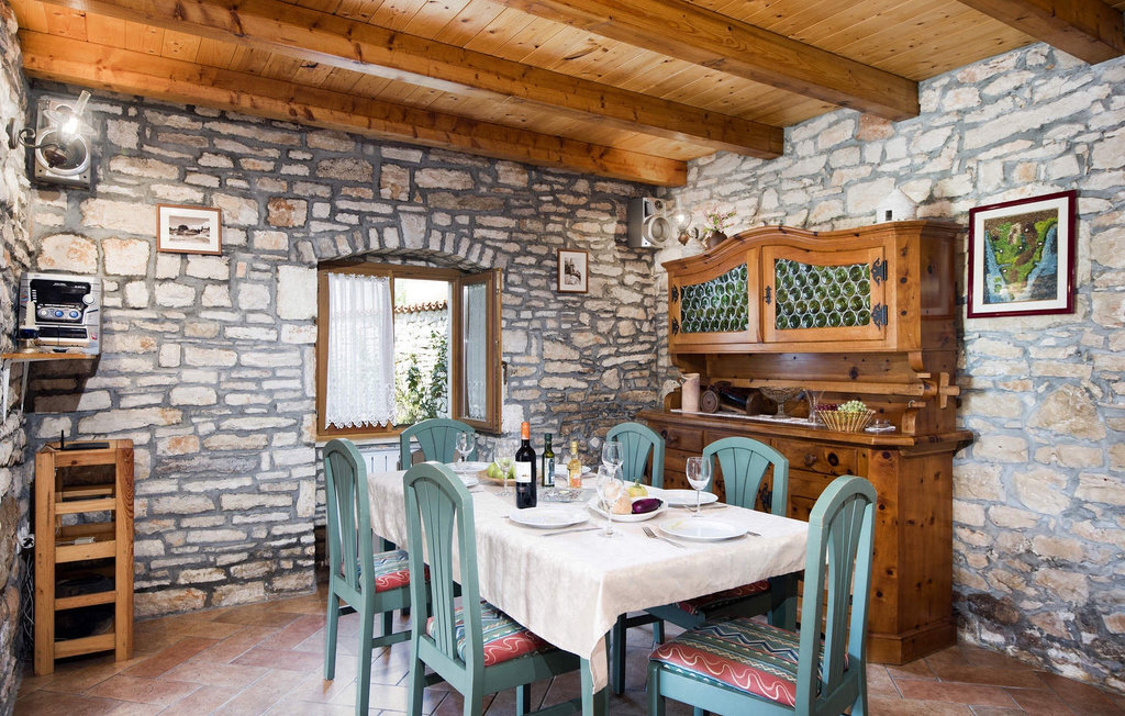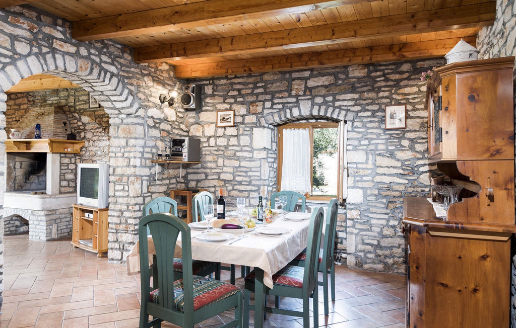À l'intérieur de la villa, l'ambiance est chaleureuse. Au rez-de-chaussée, où se trouvent un salon et une salle à manger, ainsi qu'une cuisine, de magnifiques murs en pierre attireront votre attention, tandis que les détails en bois contribuent à la chaleur de la pièce. La charmante cuisine entièrement équipée vous invite à préparer quelques-unes des spécialités traditionnelles d'Istrie.