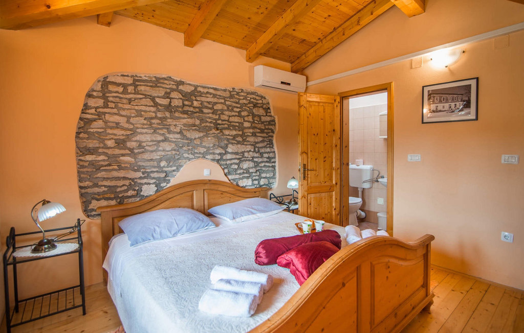 À l'étage, trois chambres peuvent accueillir jusqu'à 6 personnes, avec deux belles salles de bain. Les chambres à coucher confortables sont également aménagées dans le style d'une maison istrienne, tout en dégageant une atmosphère istrienne traditionnelle.