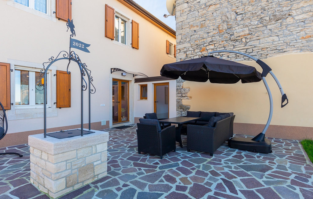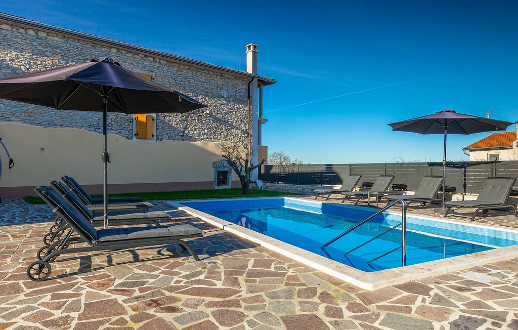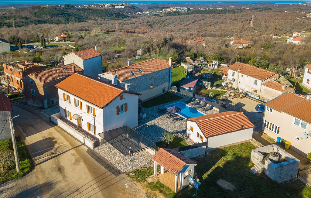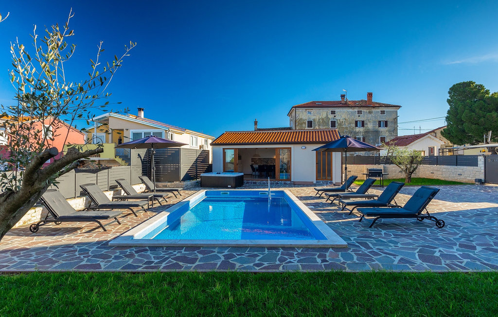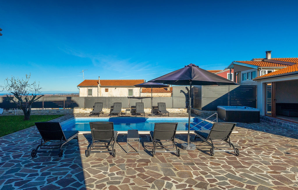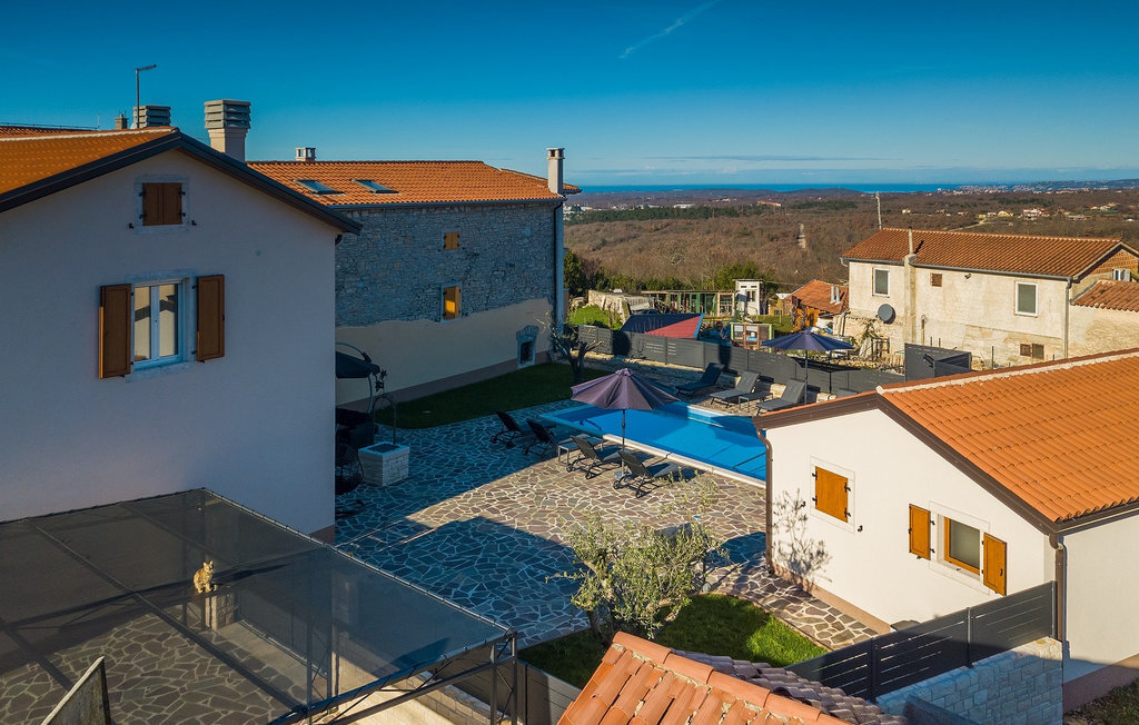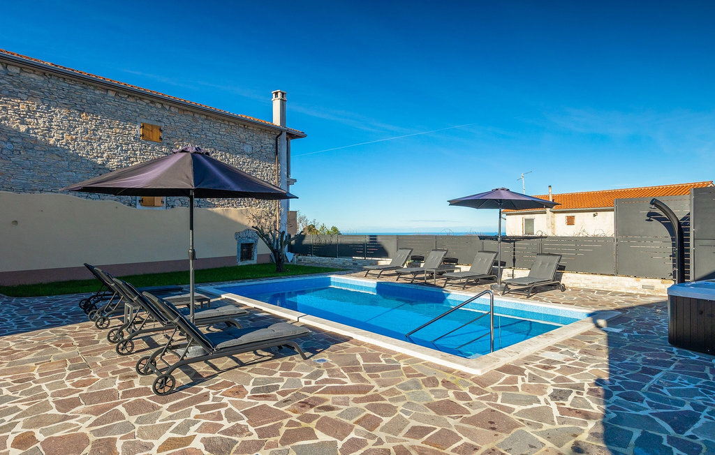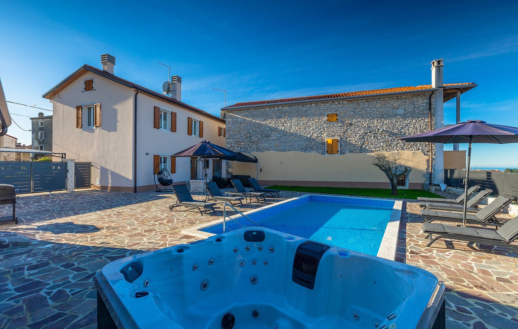 La charmante et ancienne villa restaurée Druskovic se trouve dans le petit hameau de Triban, à quelques minutes en voiture de la ville médiévale de Buje. La maison de deux étages dispose de 3 chambres et peut accueillir jusqu'à 6+2 hôtes. Le rez-de-chaussée de la villa se compose d'un espace de vie ouvert avec cheminée, d'un coin repas et d'une cuisine entièrement équipée. Vous y trouverez également un espace bien-être avec sauna et une salle de bain séparée. À l'étage supérieur se trouvent trois chambres à coucher design et confortables, chacune avec un lit double et deux chambres avec une douche. L'espace extérieur est le point fort de la villa. La villa dispose d'une grande piscine privée, d'une grande terrasse avec un espace lounge et d'un jacuzzi. Vous pourrez vous y détendre et profiter de la belle vue sur la côte italienne et slovène et sur les montagnes. À quelques pas de la piscine se trouve une cuisine d'été couverte et bien équipée avec un coin repas. C'est l'endroit parfait pour une réunion de famille, où vous pourrez préparer de délicieux repas sur le barbecue au charbon de bois. La Villa Druskovic est idéale pour les grandes familles et les groupes à la recherche de vacances relaxantes en Istrie.La Villa Druskovic est située dans la partie nord de l'Istrie, non loin d'Umag, dans la petite ville de Triban. La villa est un point de départ idéal pour de nombreuses excursions et activités. Nous vous recommandons une excursion dans la petite ville médiévale de Buje, entourée de vignobles et d'oliveraies. Visitez la cave à vin de la famille Kozlovi, qui vous fera visiter sa cave, puis dégustez différents vins avec une belle vue sur les vignobles. Goûtez aux plats traditionnels d'Istrie comme le Fui aux truffes, l'Ombolo ou le bœuf d'Istrie Bokarin. Nous recommandons à tous les amateurs de culture de visiter la ville de Pula et son amphithéâtre, la ville romantique de Rovinj avec ses maisons colorées et les villes médiévales du centre de l'Istrie comme Motovun, Buzet ou Gronjan. Les amateurs de golf seront ravis de la proximité du terrain de golf avec un total de 18 trous, situé au point le plus à l'est de la Croatie, le cap Savudrija. Si vous avez plus de temps, nous vous recommandons vivement une excursion d'une journée en bateau à Venise.