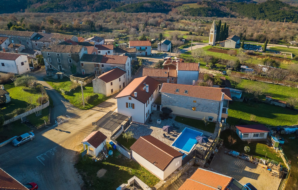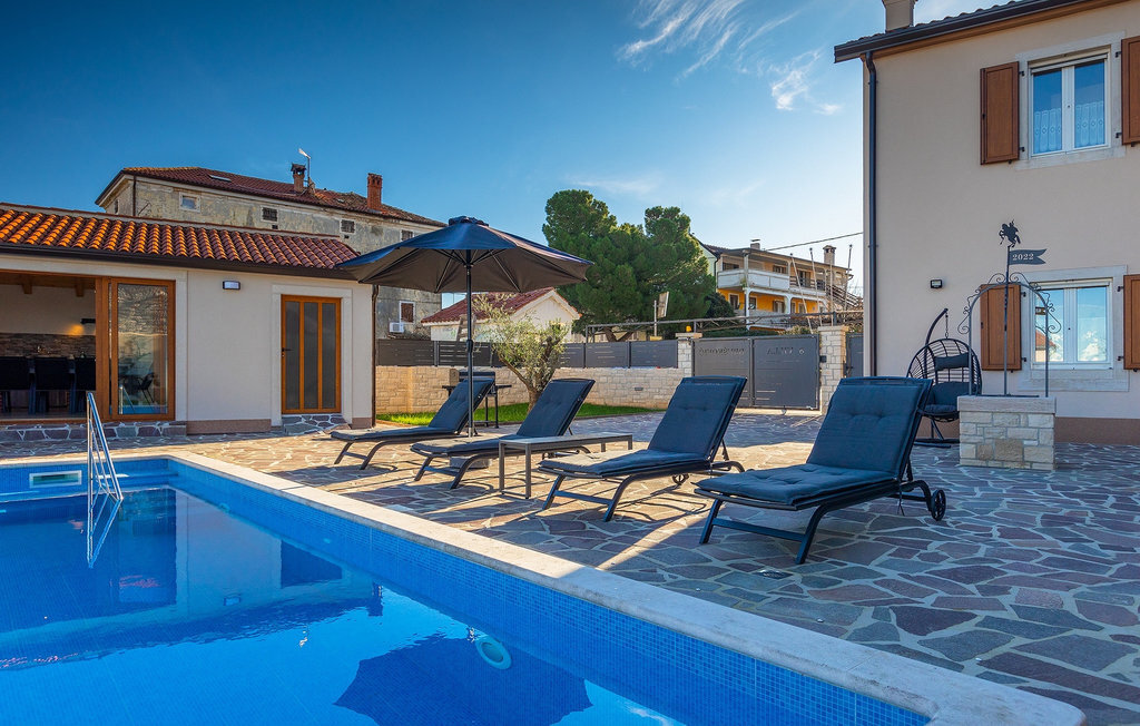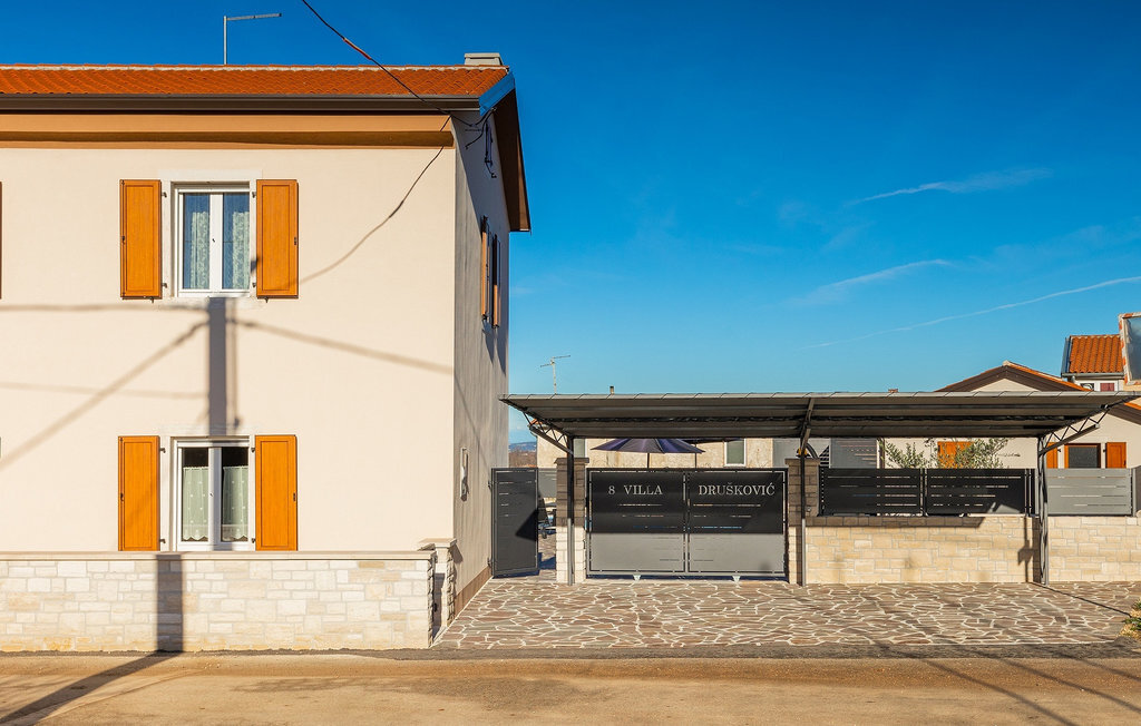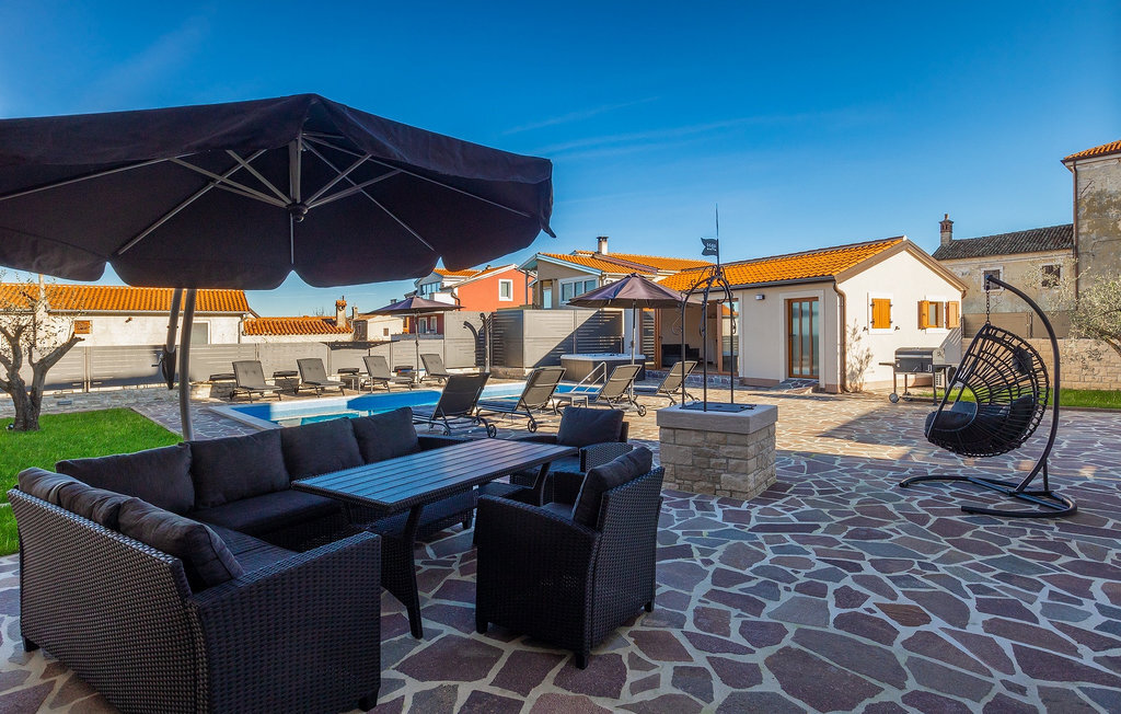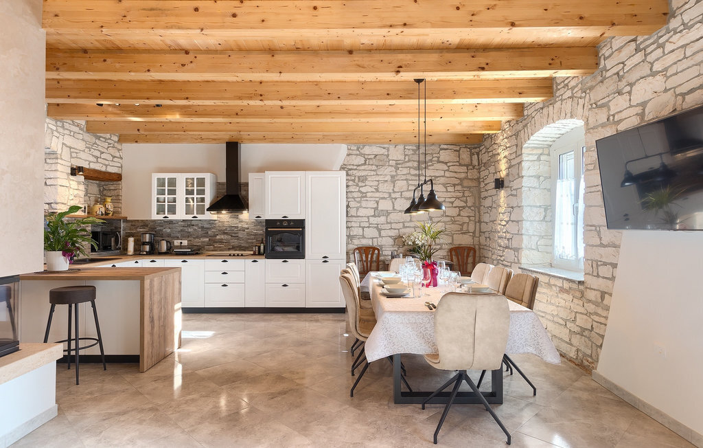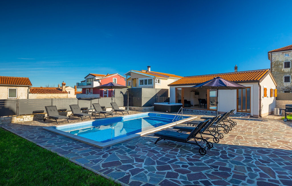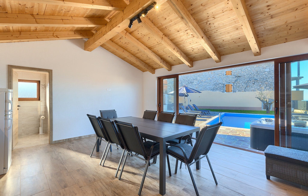 La charmante et ancienne villa restaurée Druskovic se trouve dans le petit hameau de Triban, à quelques minutes en voiture de la ville médiévale de Buje. La maison de deux étages dispose de 3 chambres et peut accueillir jusqu'à 6+2 hôtes. Le rez-de-chaussée de la villa se compose d'un espace de vie ouvert avec cheminée, d'un coin repas et d'une cuisine entièrement équipée. Vous y trouverez également un espace bien-être avec sauna et une salle de bain séparée. À l'étage supérieur se trouvent trois chambres à coucher design et confortables, chacune avec un lit double et deux chambres avec une douche. L'espace extérieur est le point fort de la villa. La villa dispose d'une grande piscine privée, d'une grande terrasse avec un espace lounge et d'un jacuzzi. Vous pourrez vous y détendre et profiter de la belle vue sur la côte italienne et slovène et sur les montagnes. À quelques pas de la piscine se trouve une cuisine d'été couverte et bien équipée avec un coin repas. C'est l'endroit parfait pour une réunion de famille, où vous pourrez préparer de délicieux repas sur le barbecue au charbon de bois. La Villa Druskovic est idéale pour les grandes familles et les groupes à la recherche de vacances relaxantes en Istrie.La Villa Druskovic est située dans la partie nord de l'Istrie, non loin d'Umag, dans la petite ville de Triban. La villa est un point de départ idéal pour de nombreuses excursions et activités. Nous vous recommandons une excursion dans la petite ville médiévale de Buje, entourée de vignobles et d'oliveraies. Visitez la cave à vin de la famille Kozlovi, qui vous fera visiter sa cave, puis dégustez différents vins avec une belle vue sur les vignobles. Goûtez aux plats traditionnels d'Istrie comme le Fui aux truffes, l'Ombolo ou le bœuf d'Istrie Bokarin. Nous recommandons à tous les amateurs de culture de visiter la ville de Pula et son amphithéâtre, la ville romantique de Rovinj avec ses maisons colorées et les villes médiévales du centre de l'Istrie comme Motovun, Buzet ou Gronjan. Les amateurs de golf seront ravis de la proximité du terrain de golf avec un total de 18 trous, situé au point le plus à l'est de la Croatie, le cap Savudrija. Si vous avez plus de temps, nous vous recommandons vivement une excursion d'une journée en bateau à Venise.