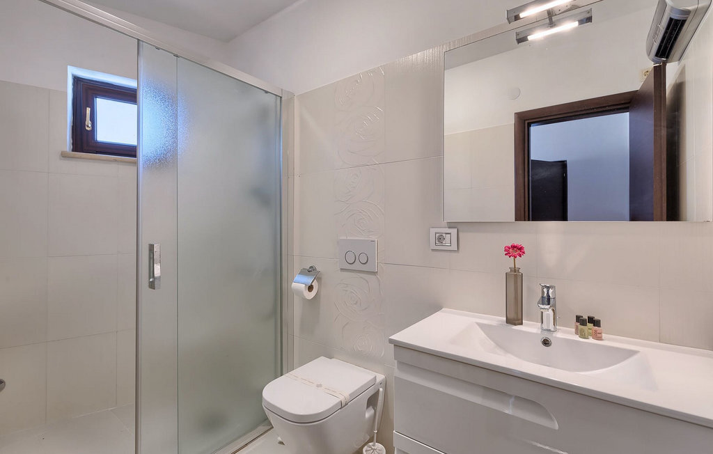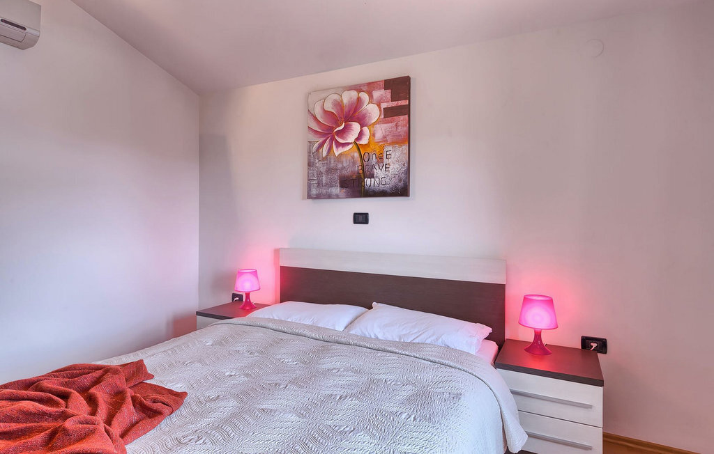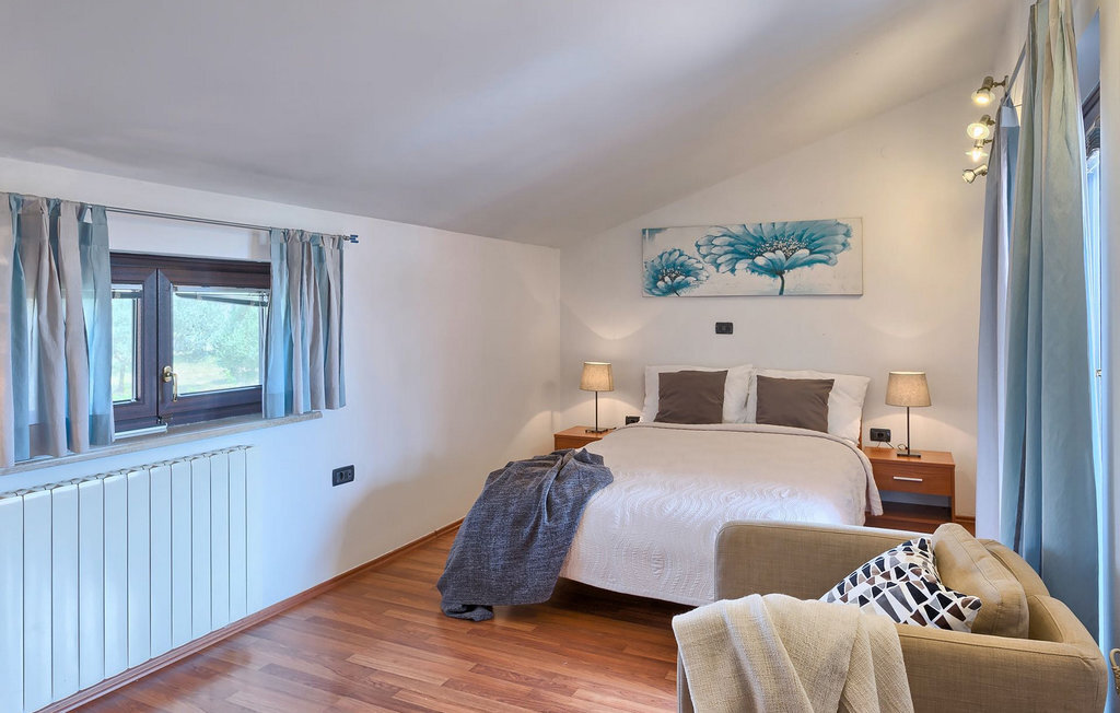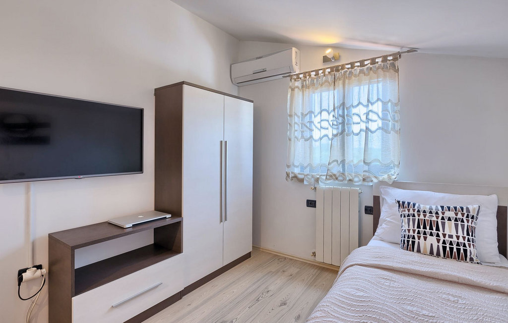 À l'étage supérieur se trouvent deux chambres à coucher, chacune avec un lit double, une chambre avec deux lits simples, une salle de bain et une chambre avec salle de bain privée. Toutes les chambres sont climatisées et disposent de la télévision par satellite. Sur demande, le propriétaire peut organiser une excursion d'une journée vers le parc national des îles Brijuni.