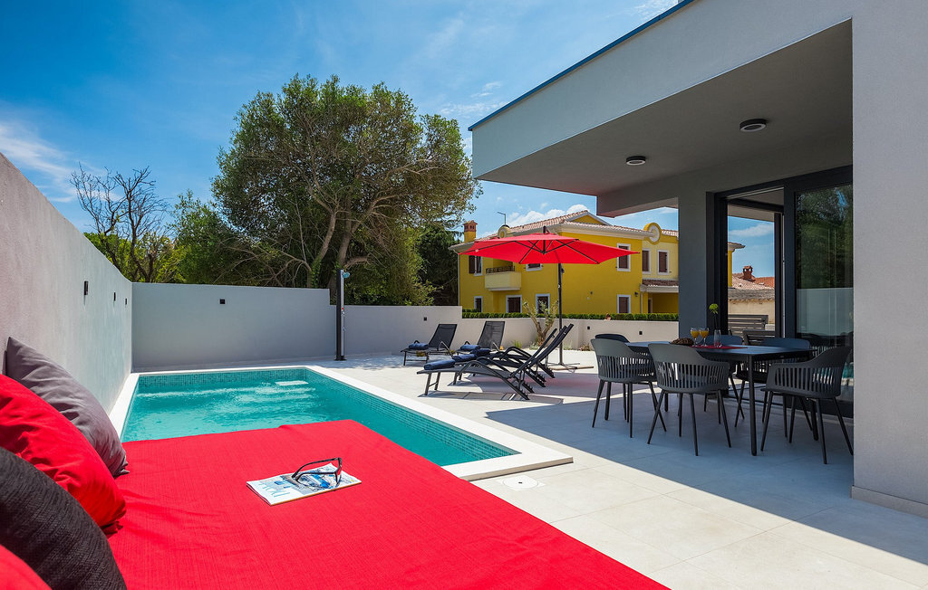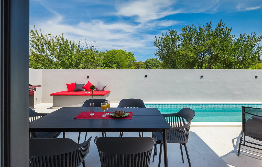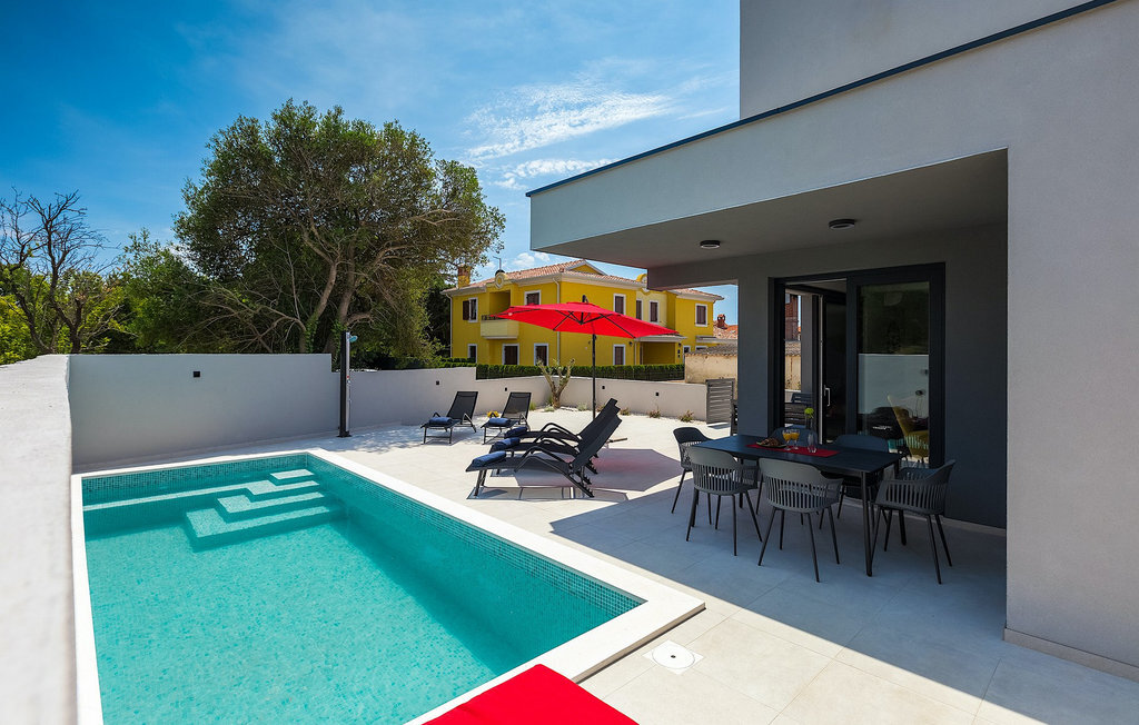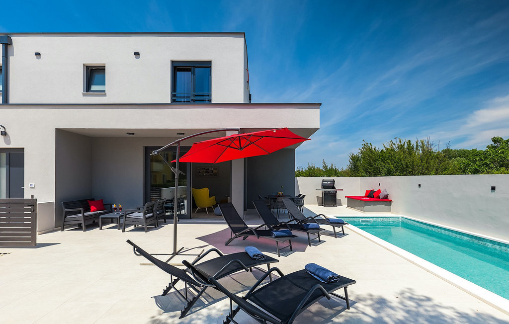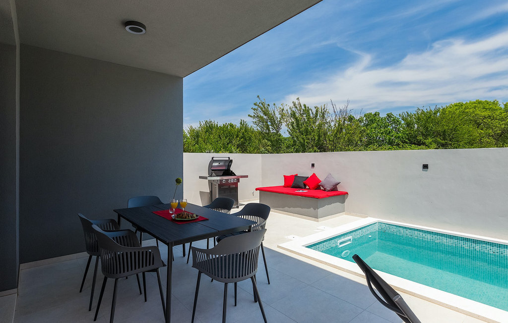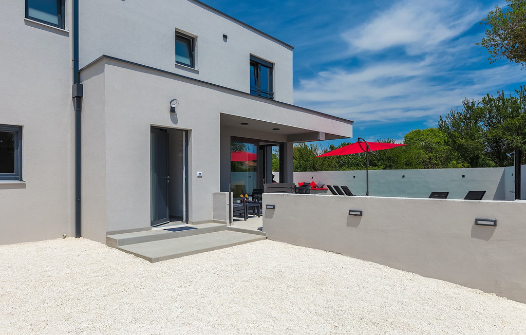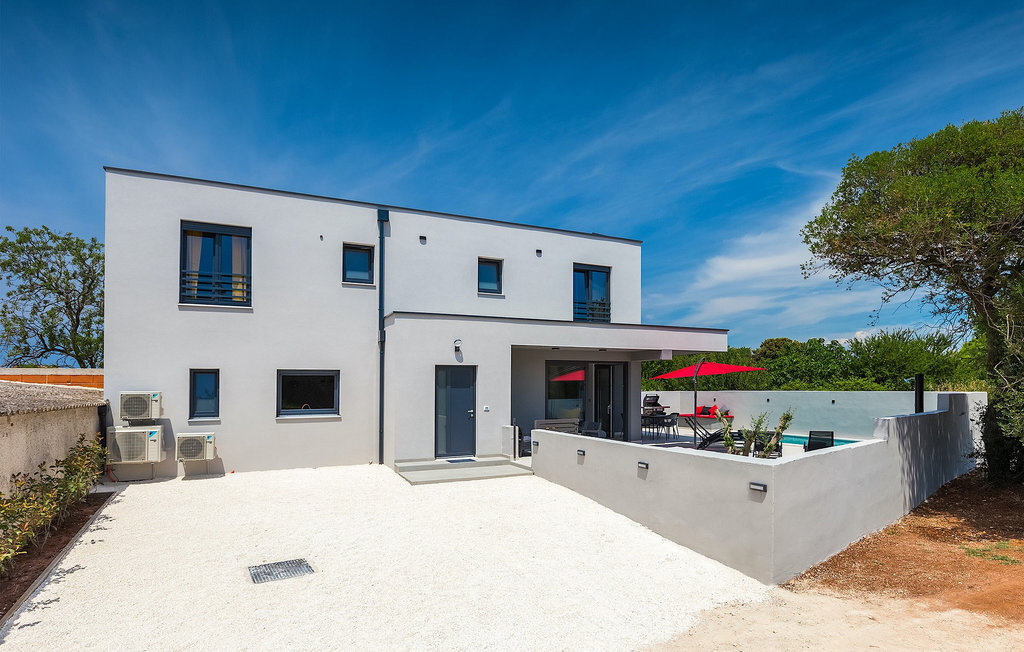 La villa moderne Gabriel se trouve dans le petit village de Banjole, près de Pula. Grâce à son emplacement parfait, les plages, les restaurants et les cafés sont facilement accessibles à pied. Le rez-de-chaussée se compose d'un salon, d'une salle à manger et d'une cuisine ouverts, ainsi que d'une salle de bain. L'ameublement a été choisi dans des couleurs sobres qui ont un effet apaisant, mais vous remarquerez de temps en temps quelques taches de couleur excitantes. La cuisine entièrement équipée offre beaucoup de place pour préparer de délicieuses spécialités et passer ensuite le temps ensemble autour de la table à manger. Pendant que vous vous reposez après le déjeuner, vous pouvez profiter de la vue sur la piscine extérieure privée depuis le salon confortable, ce qui est parfait pour se rafraîchir pendant les chaudes journées d'été. Des chaises longues et un parasol sont à votre disposition autour de la piscine. Depuis le salon, vous accédez à la terrasse sur laquelle se trouvent un coin repas et un barbecue à gaz qui promettent des soirées barbecue inoubliables. Au premier étage de la villa se trouvent deux chambres agréables avec leur propre salle de bain. La villa est entièrement climatisée et un parking privé ainsi qu'un accès à Internet sont également disponibles. Le terrain est entièrement clôturé. La Villa Gabriel, située près de la plage, est le choix parfait pour échapper à votre quotidien et passer des vacances de rêve.La Villa Gabriel est située dans un petit village de vacances à Banjole, à quelques pas de la plage.