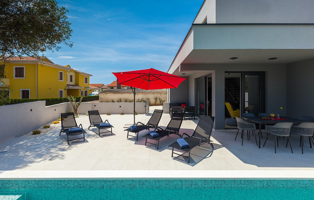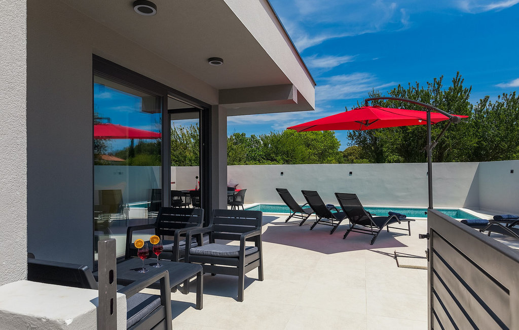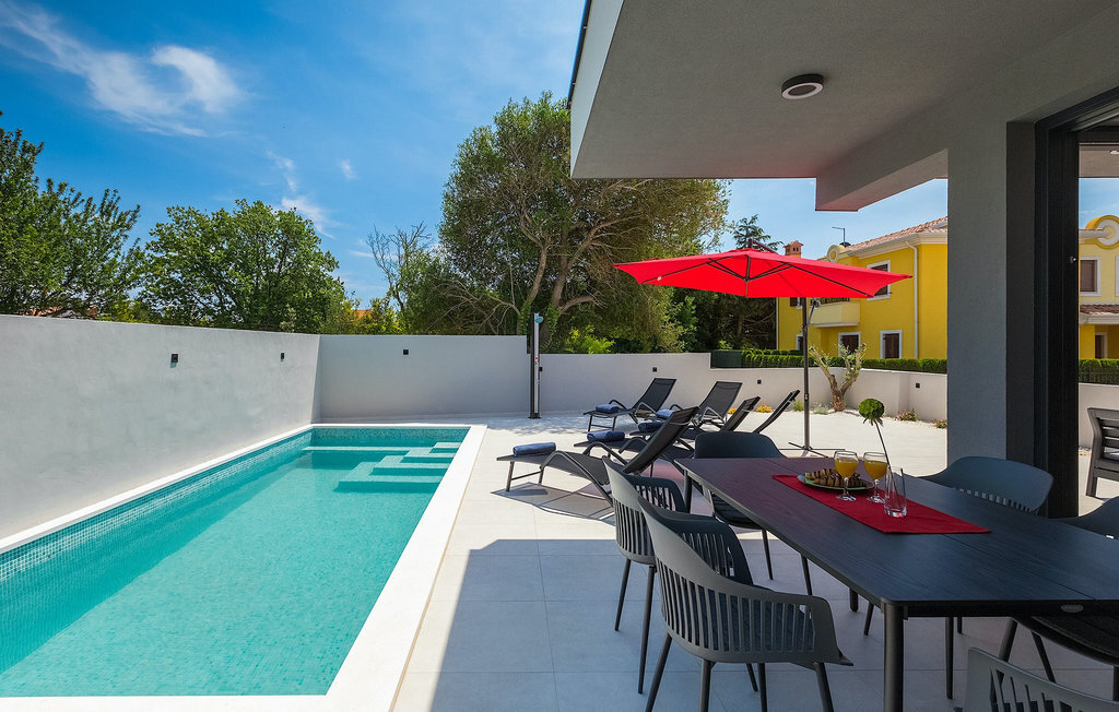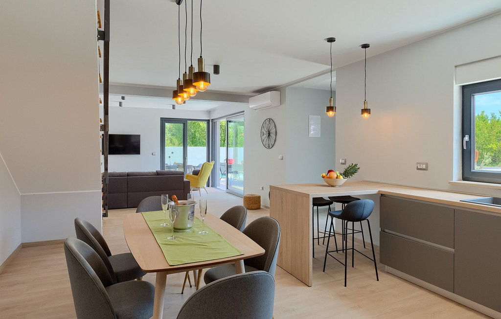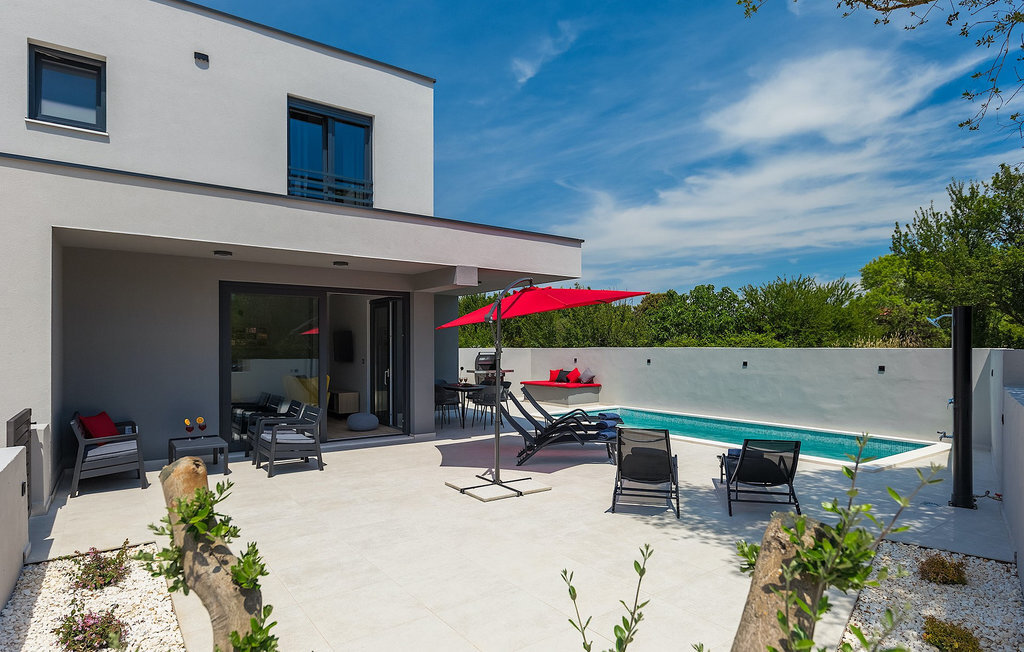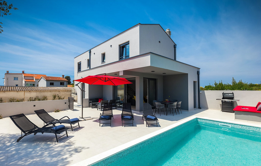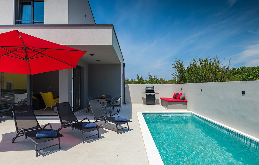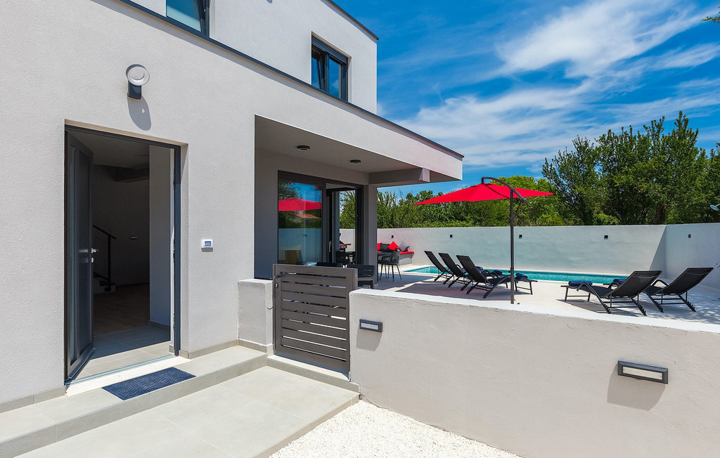 La villa moderne Gabriel se trouve dans le petit village de Banjole, près de Pula. Grâce à son emplacement parfait, les plages, les restaurants et les cafés sont facilement accessibles à pied. Le rez-de-chaussée se compose d'un salon, d'une salle à manger et d'une cuisine ouverts, ainsi que d'une salle de bain. L'ameublement a été choisi dans des couleurs sobres qui ont un effet apaisant, mais vous remarquerez de temps en temps quelques taches de couleur excitantes. La cuisine entièrement équipée offre beaucoup de place pour préparer de délicieuses spécialités et passer ensuite le temps ensemble autour de la table à manger. Pendant que vous vous reposez après le déjeuner, vous pouvez profiter de la vue sur la piscine extérieure privée depuis le salon confortable, ce qui est parfait pour se rafraîchir pendant les chaudes journées d'été. Des chaises longues et un parasol sont à votre disposition autour de la piscine. Depuis le salon, vous accédez à la terrasse sur laquelle se trouvent un coin repas et un barbecue à gaz qui promettent des soirées barbecue inoubliables. Au premier étage de la villa se trouvent deux chambres agréables avec leur propre salle de bain. La villa est entièrement climatisée et un parking privé ainsi qu'un accès à Internet sont également disponibles. Le terrain est entièrement clôturé. La Villa Gabriel, située près de la plage, est le choix parfait pour échapper à votre quotidien et passer des vacances de rêve.La Villa Gabriel est située dans un petit village de vacances à Banjole, à quelques pas de la plage.