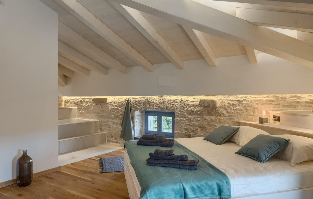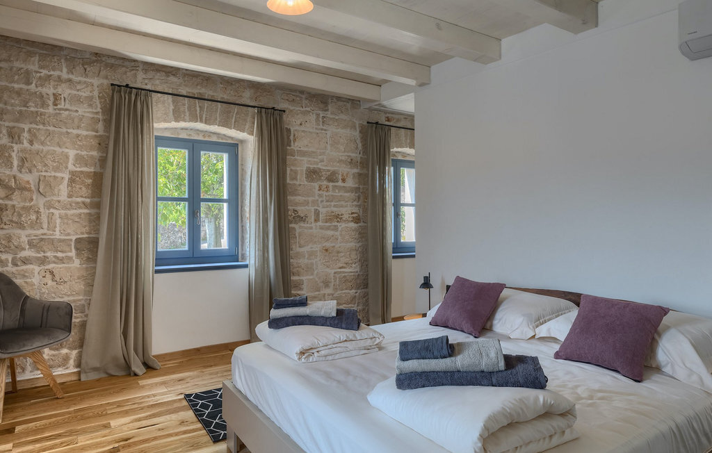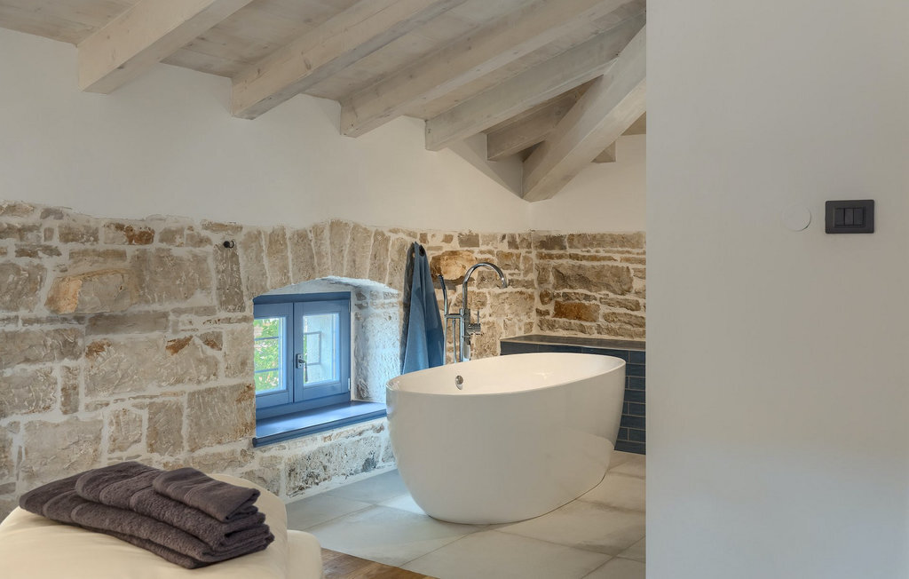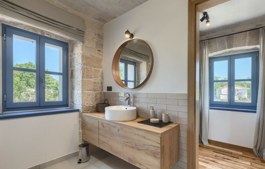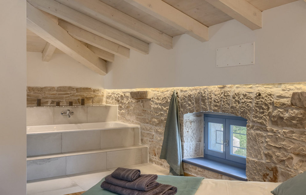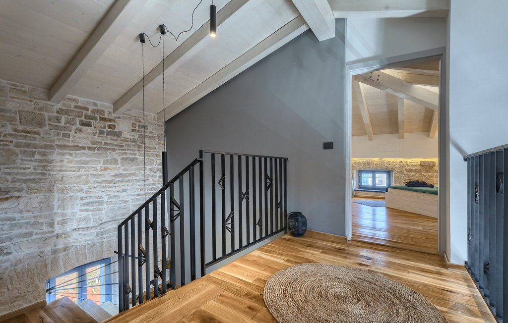 La villa dispose de 4 chambres à coucher au total et peut accueillir jusqu'à 10 personnes, ce qui la rend idéale pour des vacances en famille. L'intérieur est moderne et équipé d'appareils de haute qualité, mais la villa a aussi son charme original, typique des vieilles maisons d'Istrie - un bon exemple sont les fenêtres en bois colorées et les murs en pierre.