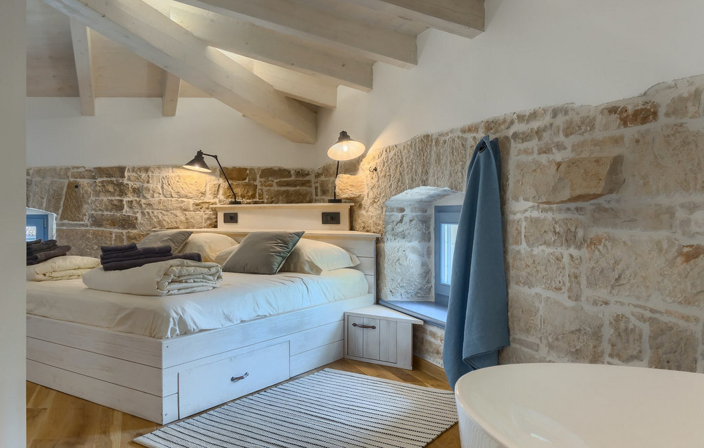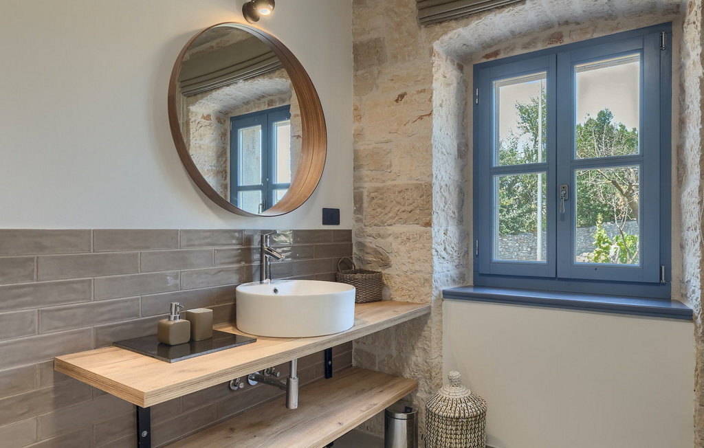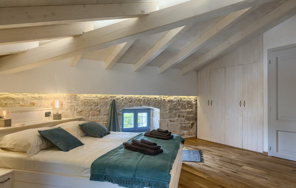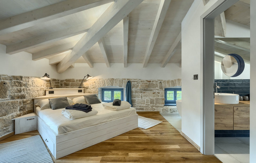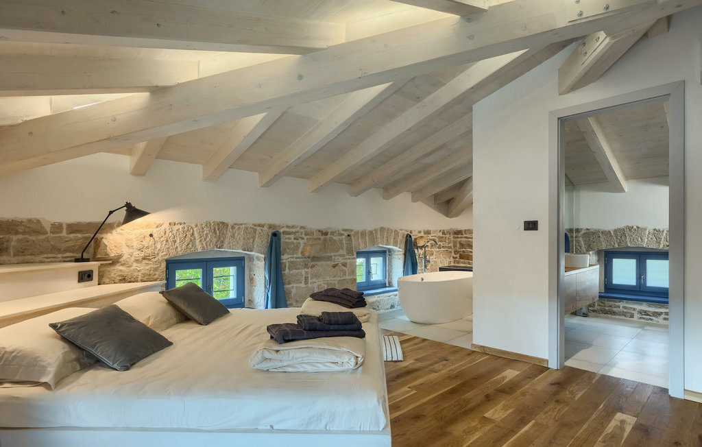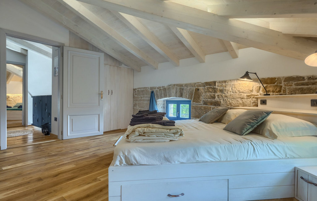 La villa dispose de 4 chambres à coucher au total et peut accueillir jusqu'à 10 personnes, ce qui la rend idéale pour des vacances en famille. L'intérieur est moderne et équipé d'appareils de haute qualité, mais la villa a aussi son charme original, typique des vieilles maisons d'Istrie - un bon exemple sont les fenêtres en bois colorées et les murs en pierre.