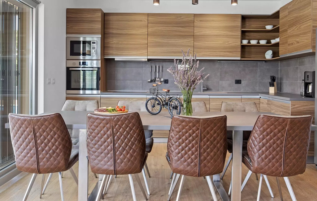 Le rez-de-chaussée de la villa Penelope, élégamment aménagé, comprend 2 chambres à coucher, 2 salles de bains, un WC pour invités et un vaste espace de vie ouvert avec une cuisine entièrement équipée et un coin repas. Le salon offre un accès direct à la terrasse avec un coin repas en plein air. Les trois chambres et deux salles de bains restantes se trouvent au premier étage, ainsi qu'un petit salon et une cuisine avec un bar pour le petit-déjeuner. Une autre pièce a été transformée en salle de jeux pour les jeunes enfants avec une table et des chaises.
