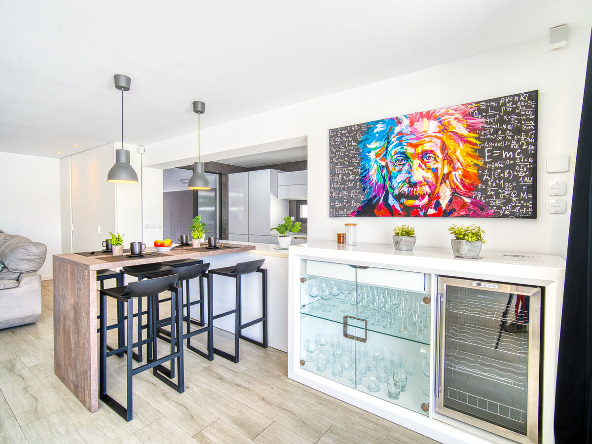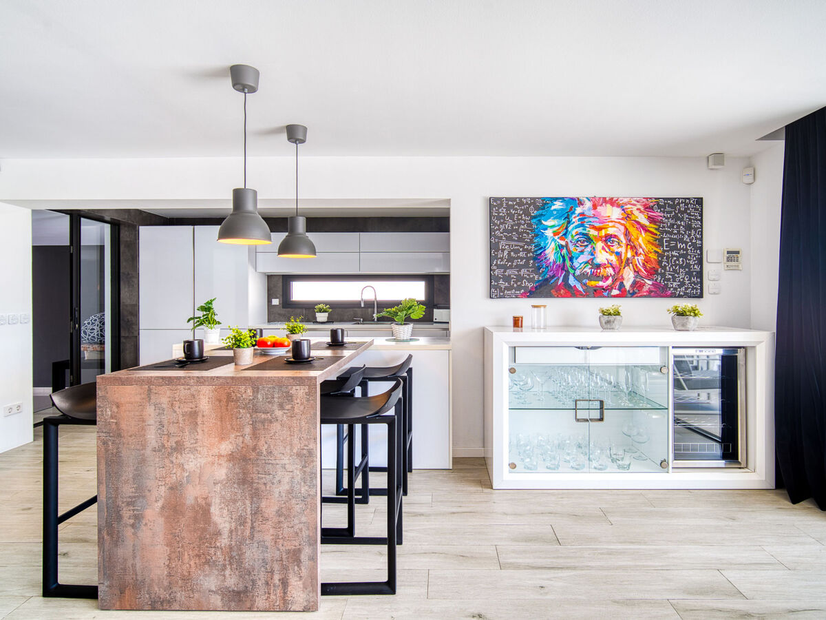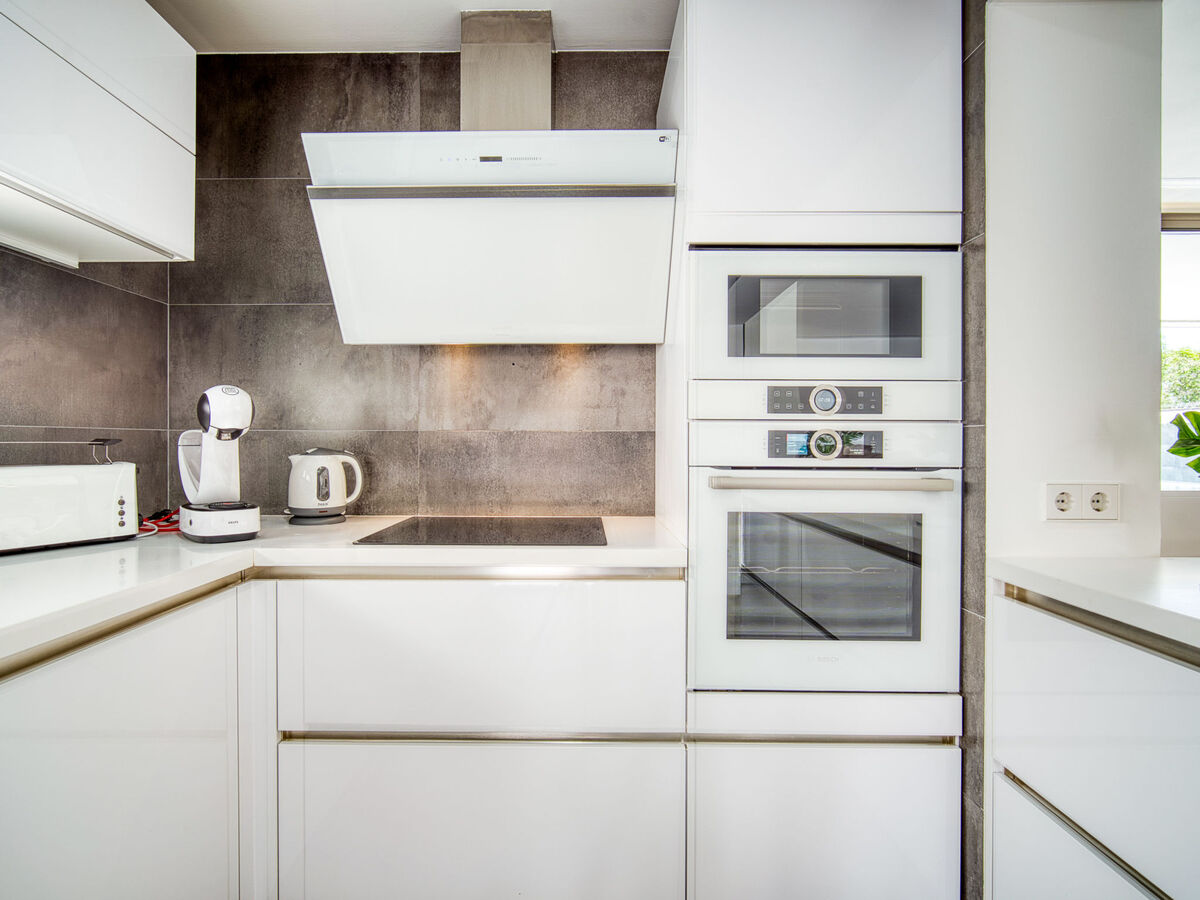 Grande cuisine (four, lave-vaisselle, 3 plaques à induction, grille-pain, bouilloire électrique, micro-ondes, congélateur, cafetière électrique, Capsules pour machine à café (Krups), ilot de cuisine).