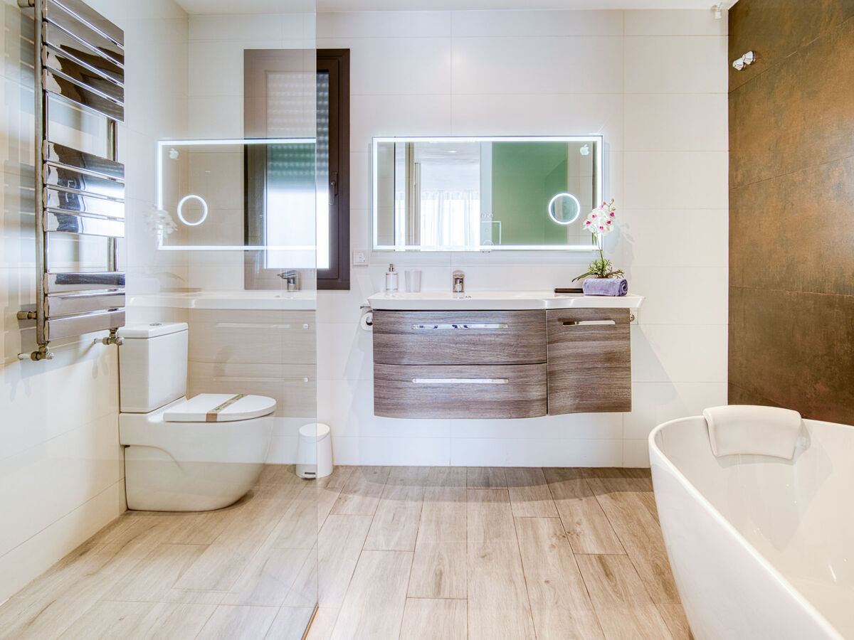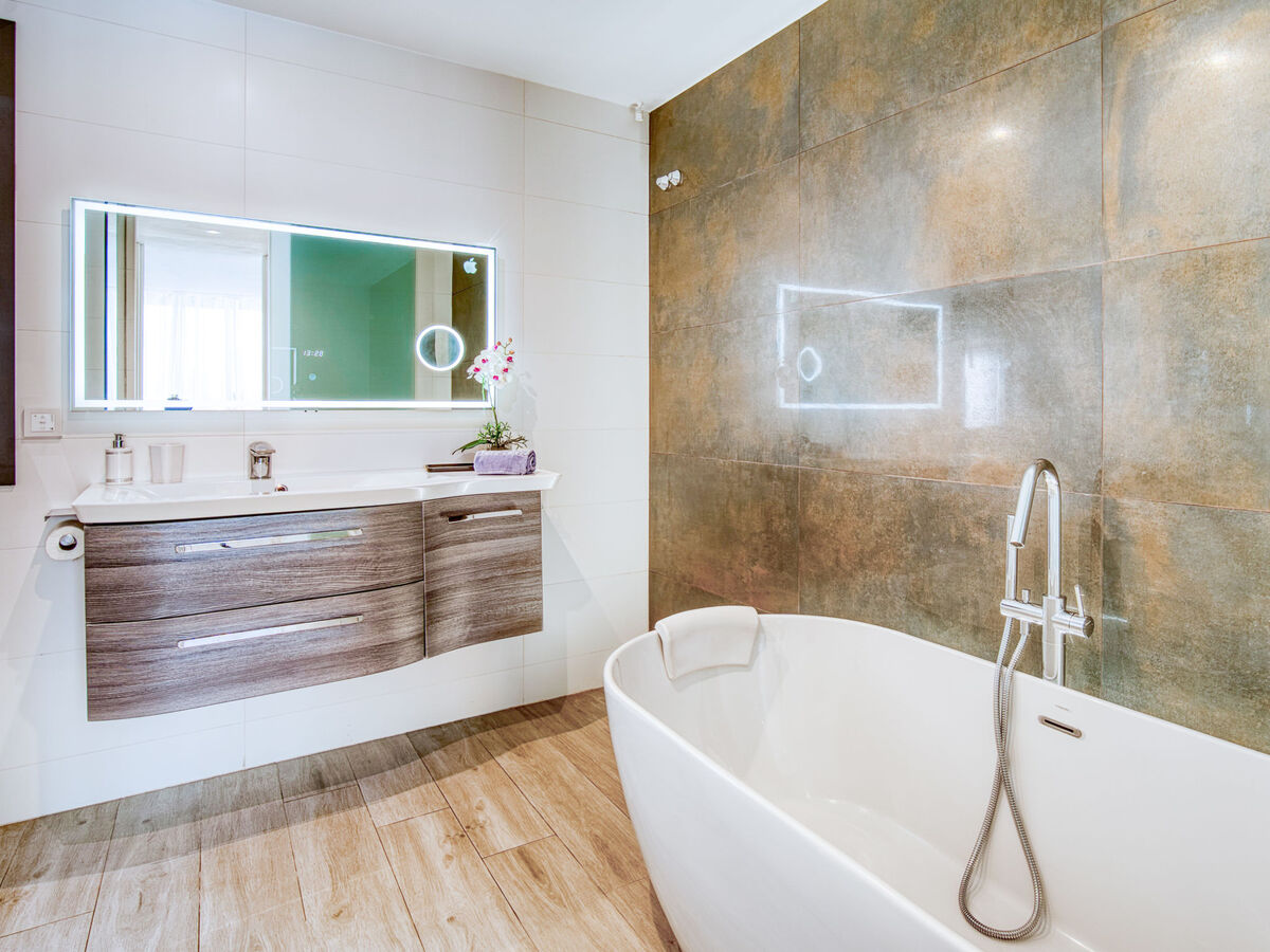 1 grande chambre avec Dressing avec 1 grand-lit (150 cm, longueur 190 cm), bain/douche/WC, air-conditionné, chauffage à air chaud et volet roulant électrique.