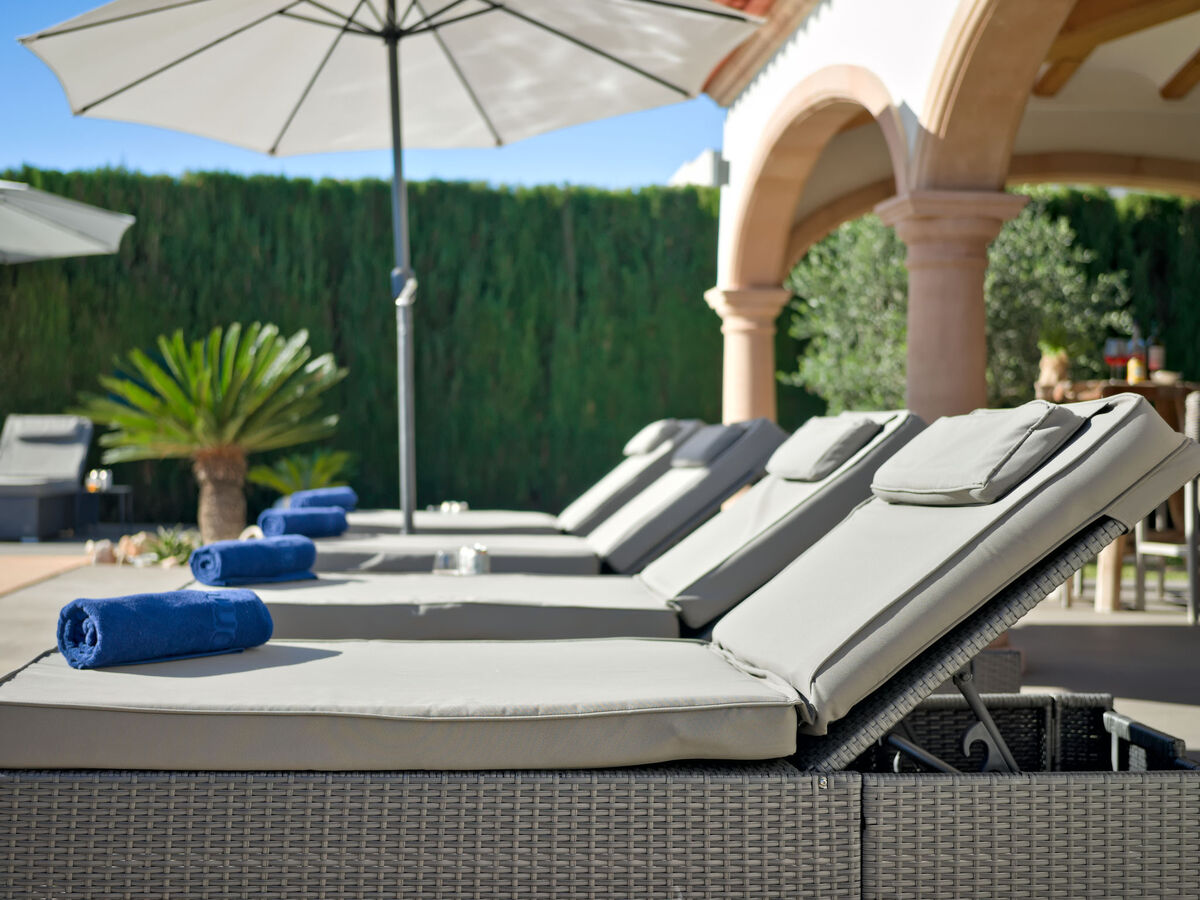 Meubles de terrasse, barbecue, chaises longues, loggia, place pour s'asseoir.