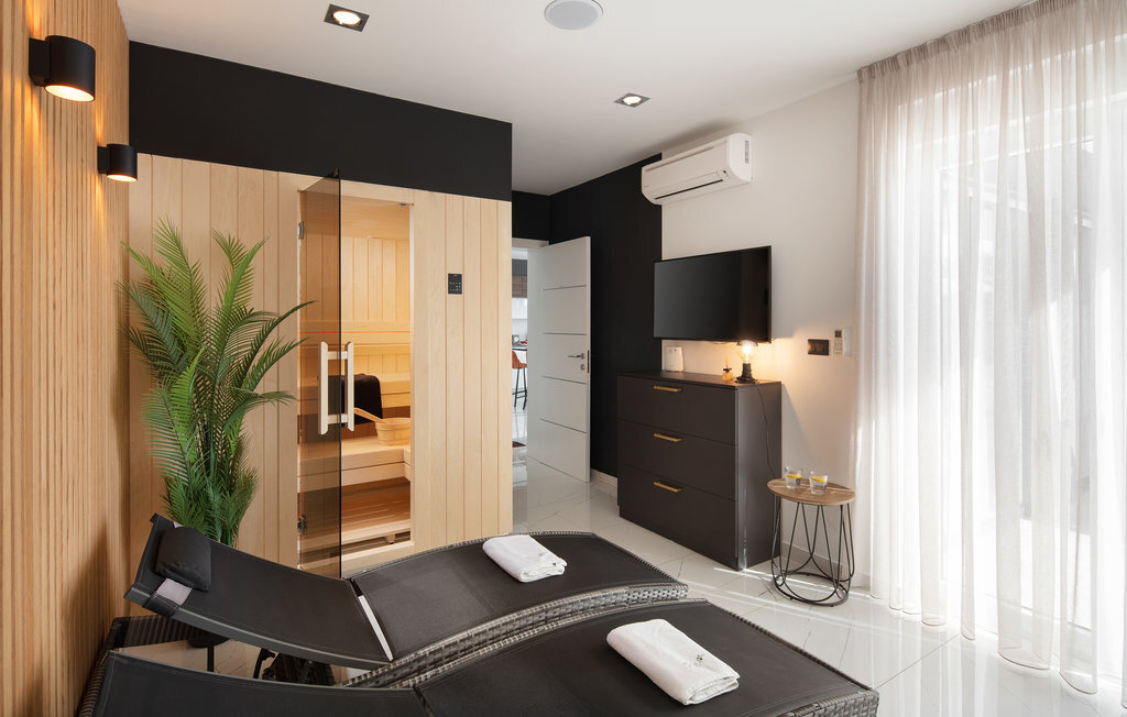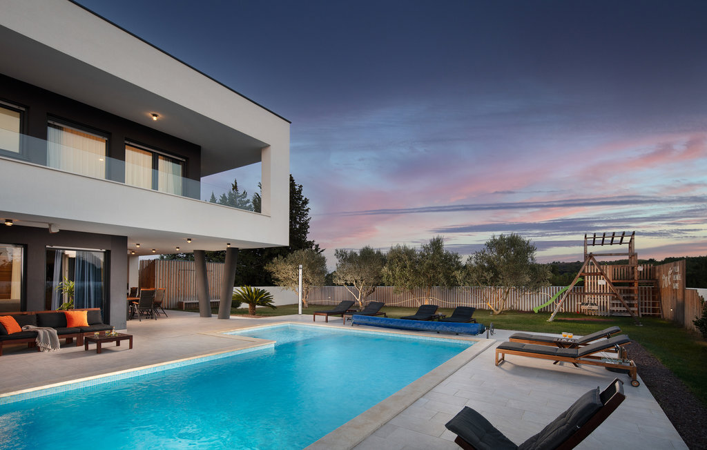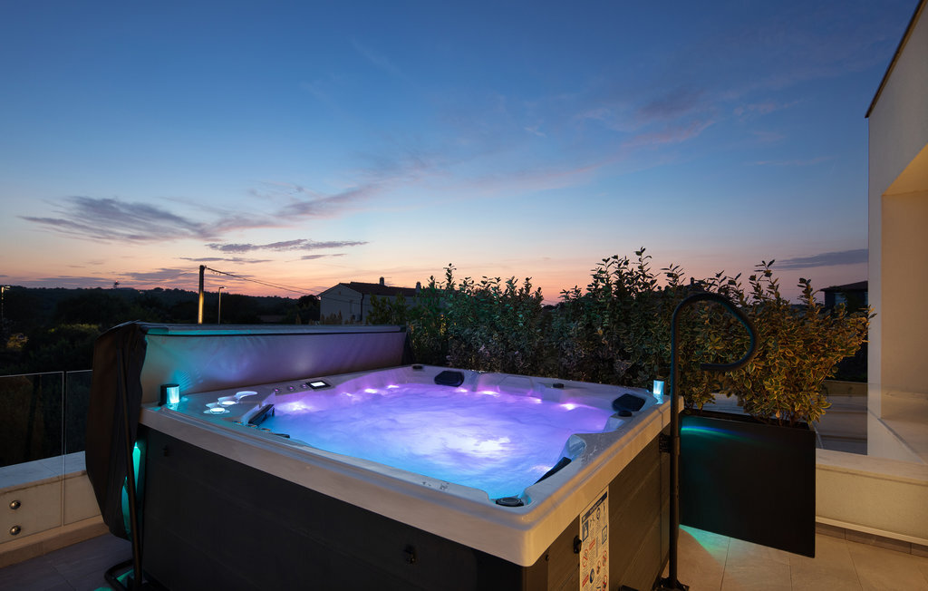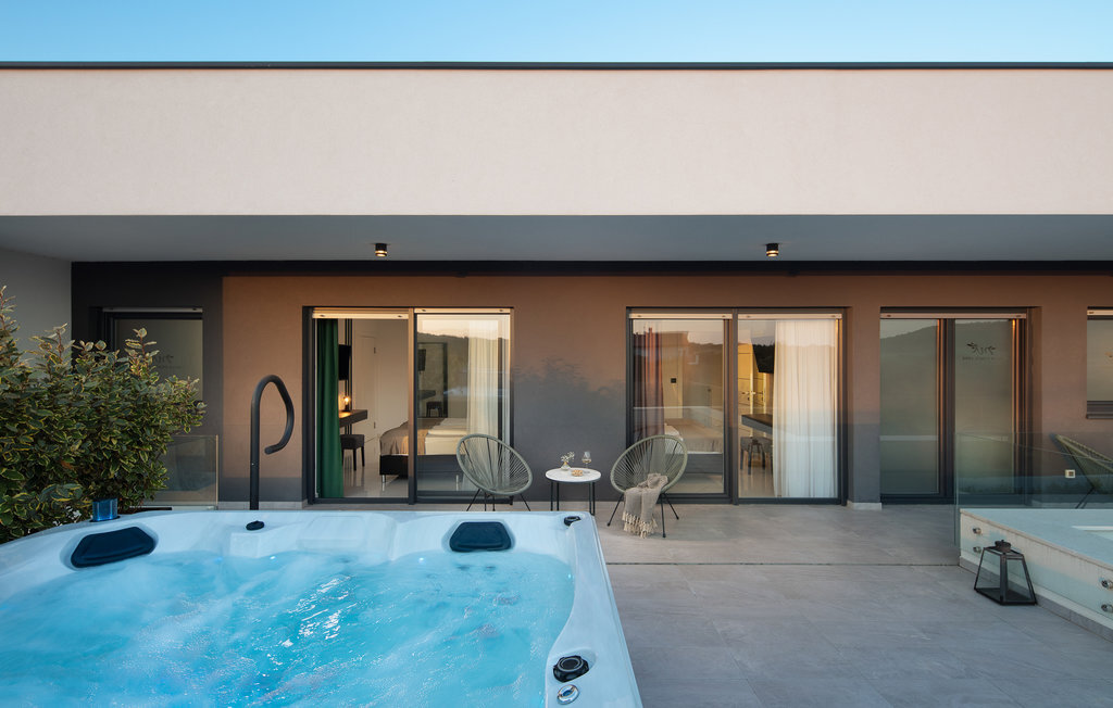 Bien-être à l'extérieur : Location de vacances disposant de chaises-longues et d'un ou plusieurs équipements tels que piscine extérieure, jacuzzi extérieur, lit à baldaquin de jardin etc...