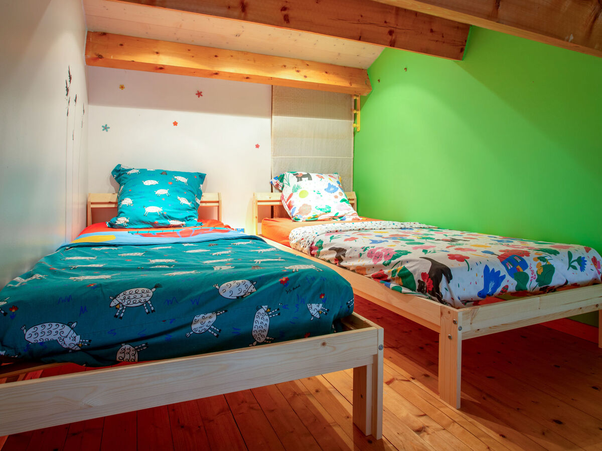 À l'étage supérieur: 1 chambre, mansardée sur 2 niveaux avec 3 lits (90 cm, longueur 190 cm).