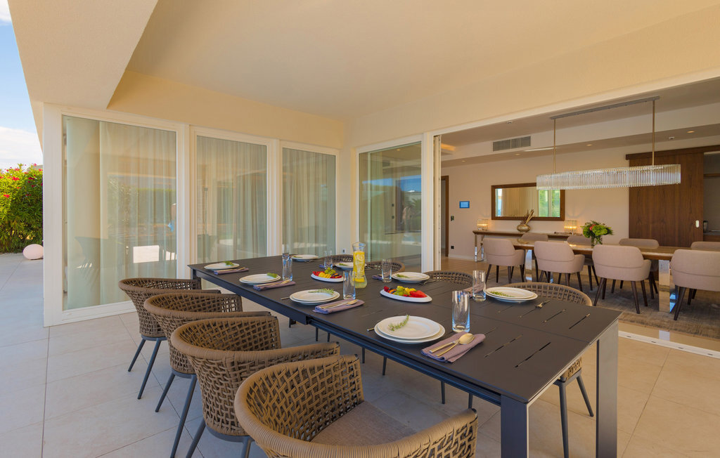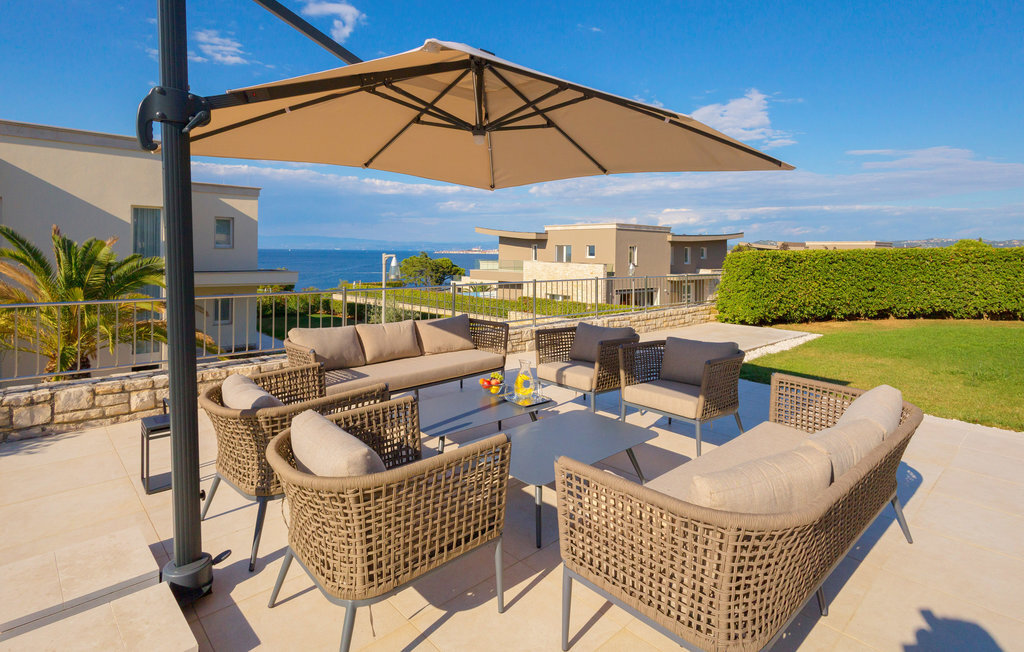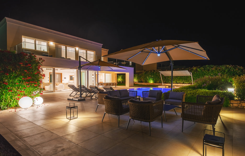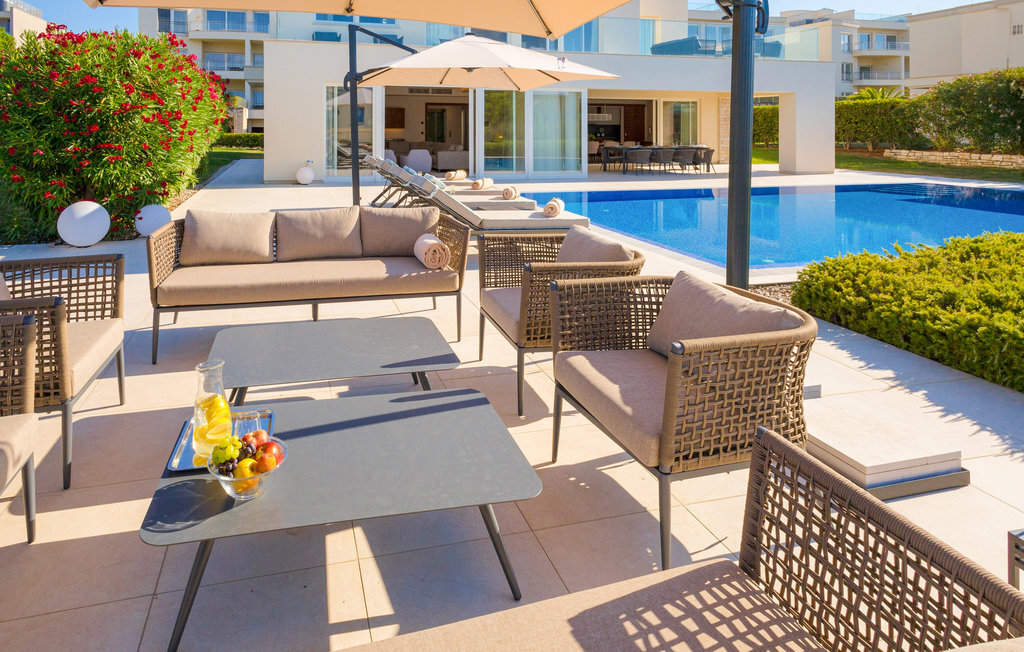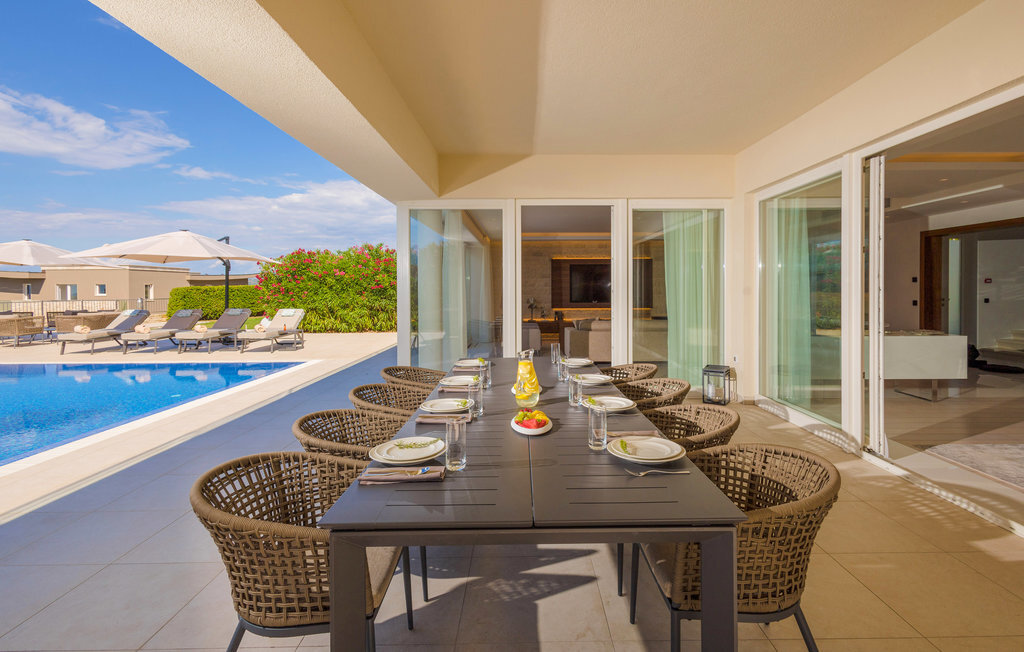Le style confortable des espaces intérieurs se retrouve à l'extérieur. Ici, vous pouvez vous détendre longuement au soleil et à l'ombre, prendre un bain de soleil sur les chaises longues au bord de la piscine et préparer vos plats préférés au barbecue le soir, voilà à quoi ressemble la détente idéale des vacances.