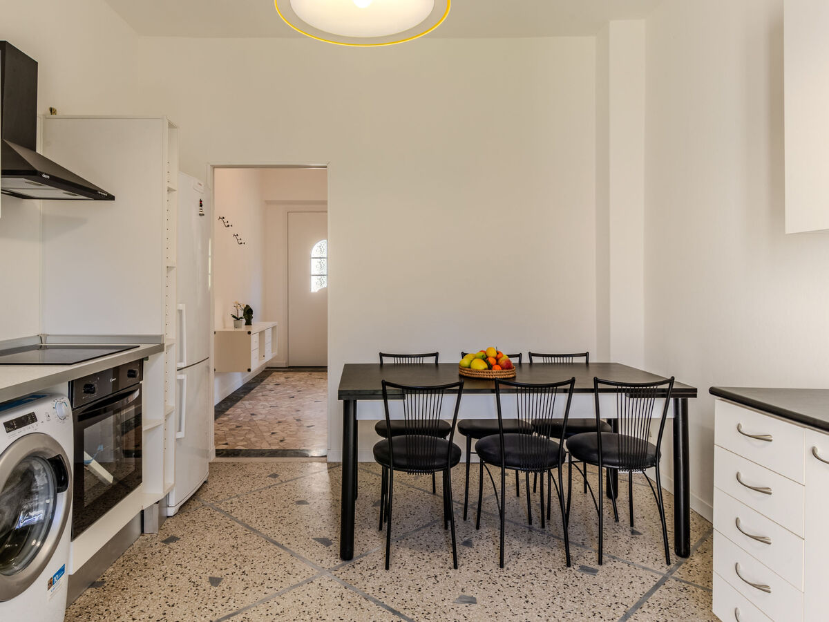 Grande cuisine/séjour (four, lave-vaisselle, 4 feux, grille-pain, cafetière électrique) avec table pour les repas.