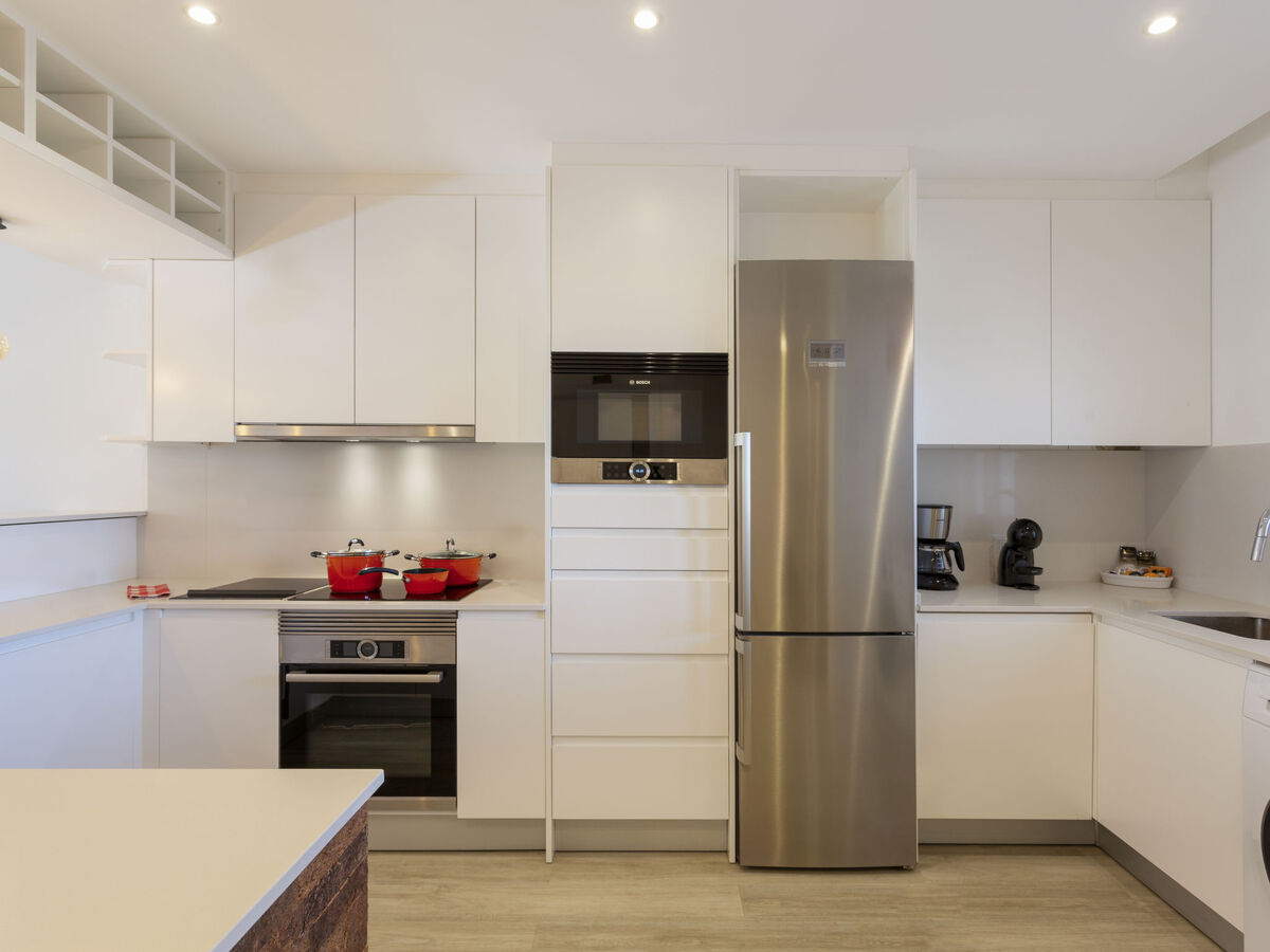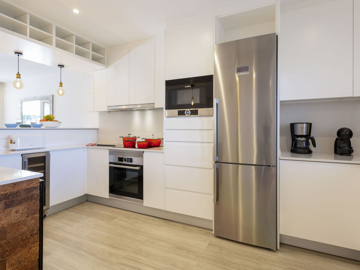 Cuisine ouverte (four, lave-vaisselle, 4 plaques vitrocéramiques, grille-pain, bouilloire électrique, micro-ondes, congélateur, cafetière électrique).