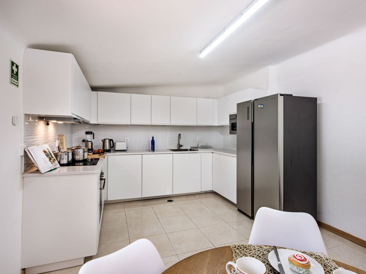 Cuisine ouverte (four, lave-vaisselle, 4 plaques vitrocéramiques, grille-pain, bouilloire électrique, micro-ondes, congélateur, cafetière électrique) avec table pour les repas.