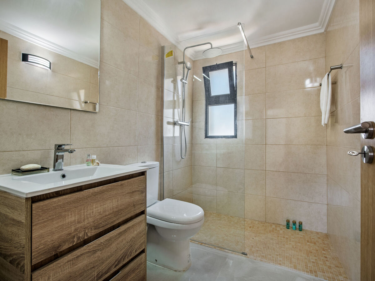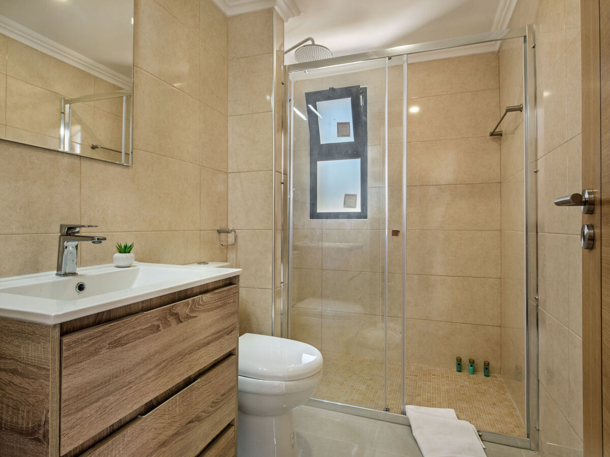 1 chambre avec 1 grand-lit (160 cm, longueur 200 cm), douche/bidet/WC, air-conditionné et chauffage à air chaud.
