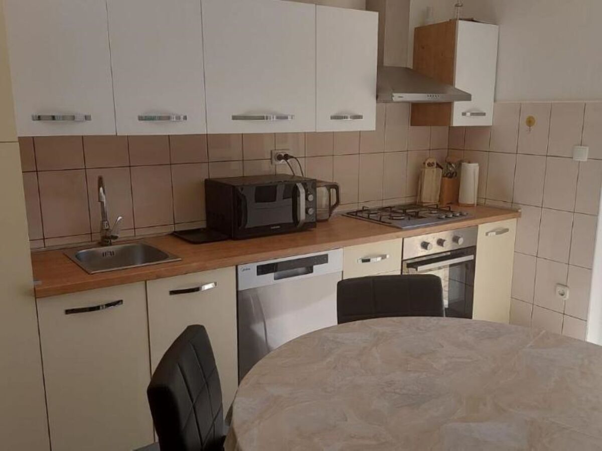 Cuisine (four, lave-vaisselle, 4 plaques vitrocéramiques, bouilloire électrique, micro-ondes, congélateur) avec table pour les repas, ventilateur.