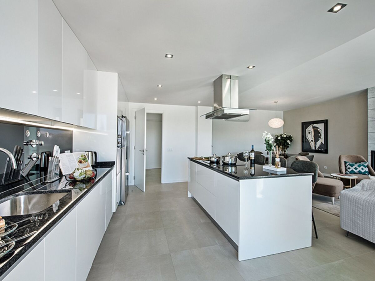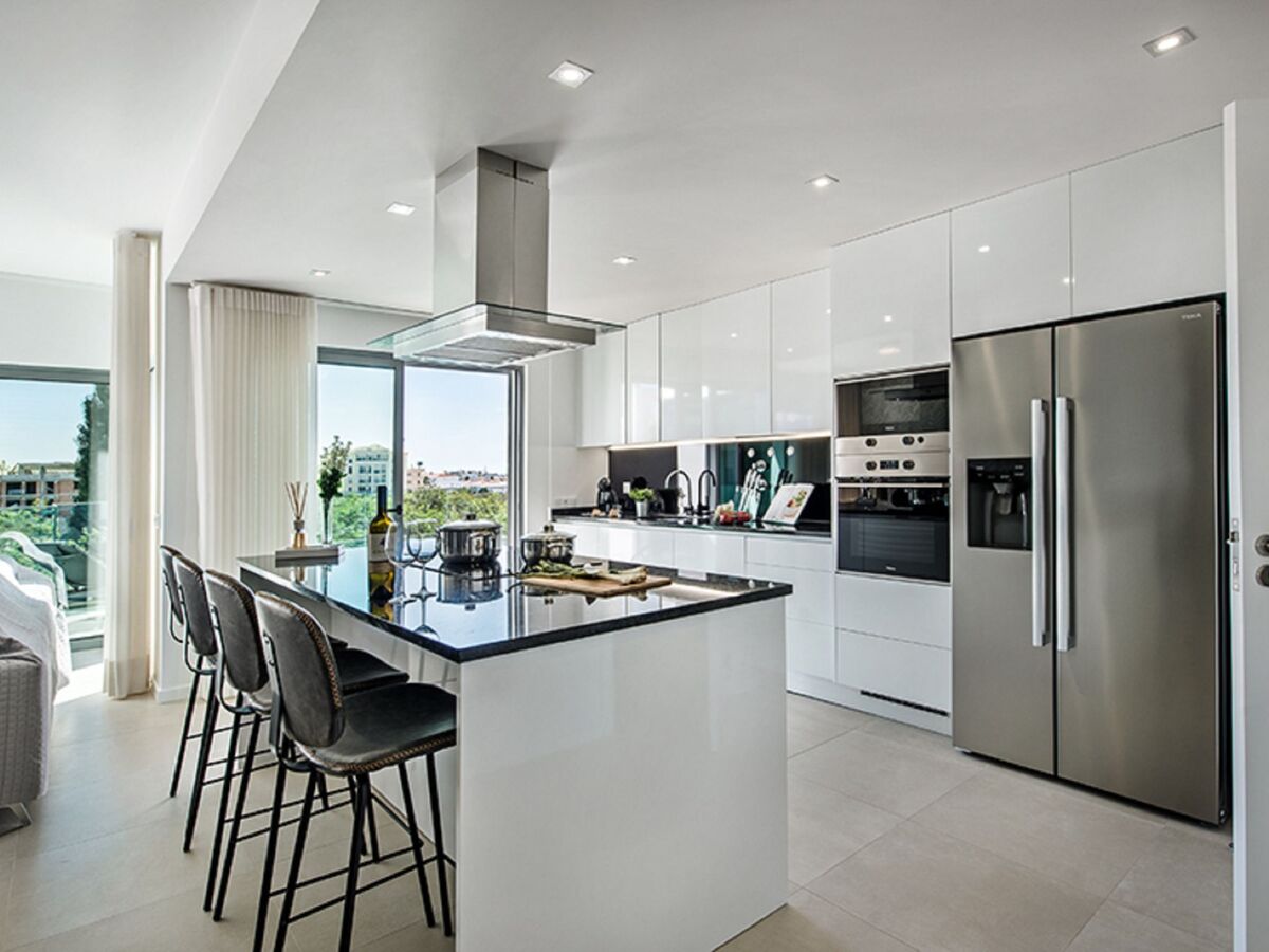 Cuisine ouverte (four, lave-vaisselle, 4 plaques vitrocéramiques, grille-pain, bouilloire électrique, micro-ondes, congélateur, ilot de cuisine).