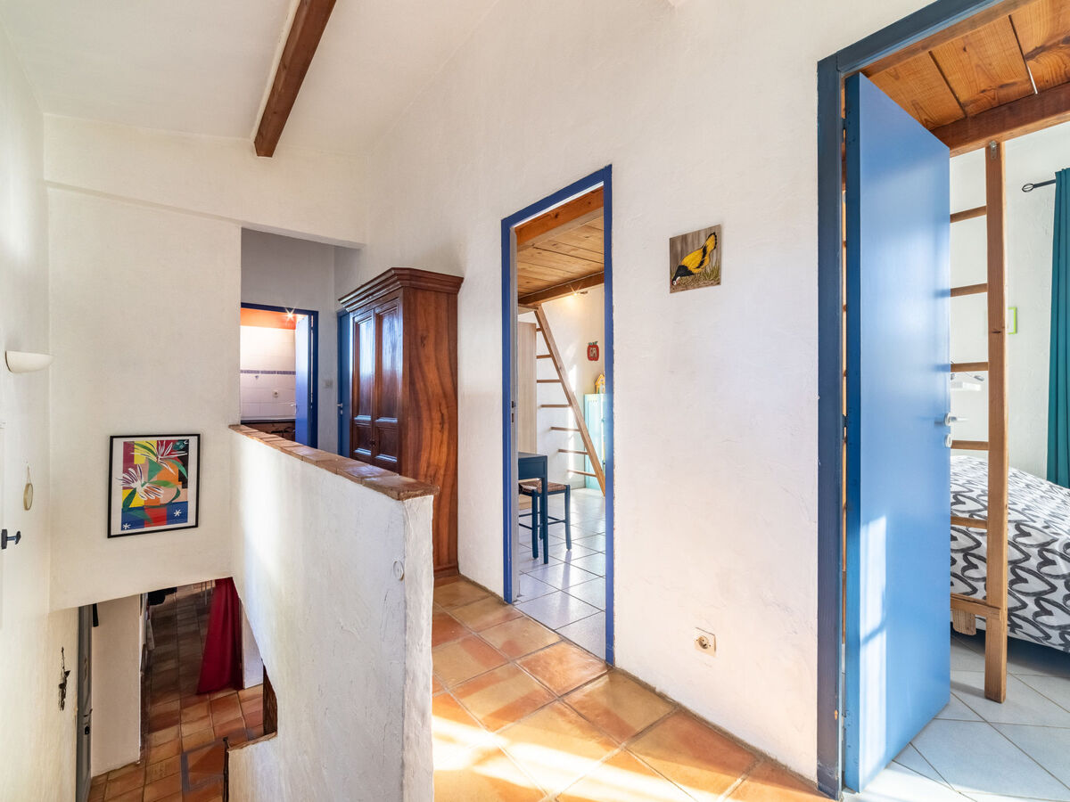 À l'étage supérieur: 1 chambre avec 1 grand-lit (160 cm, longueur 190 cm).